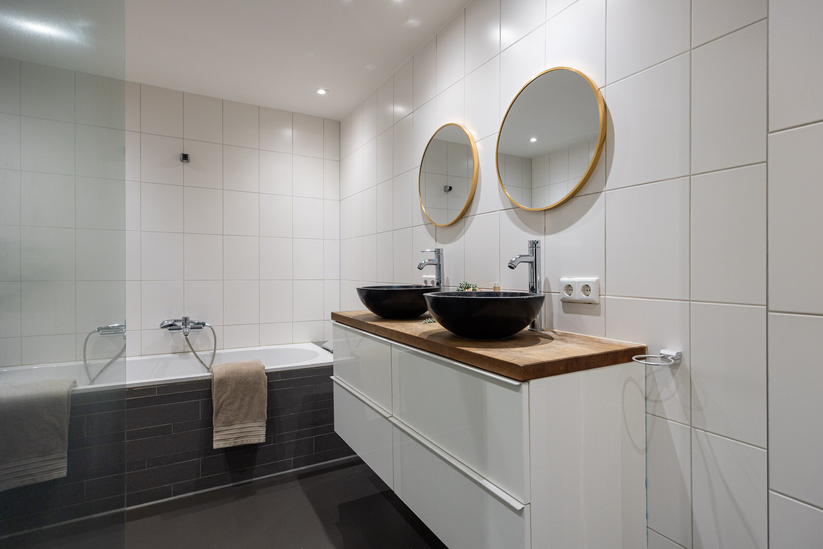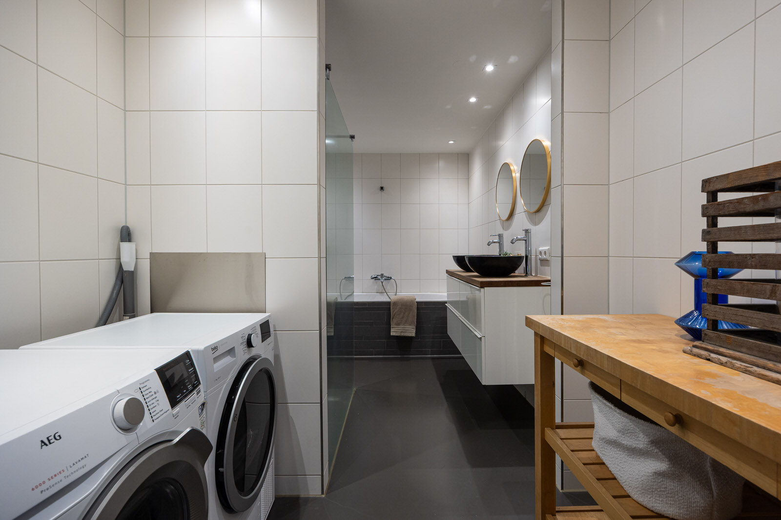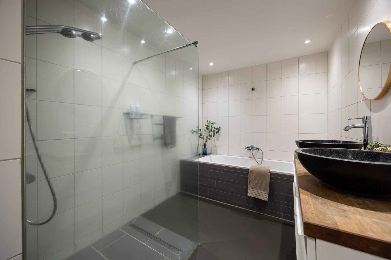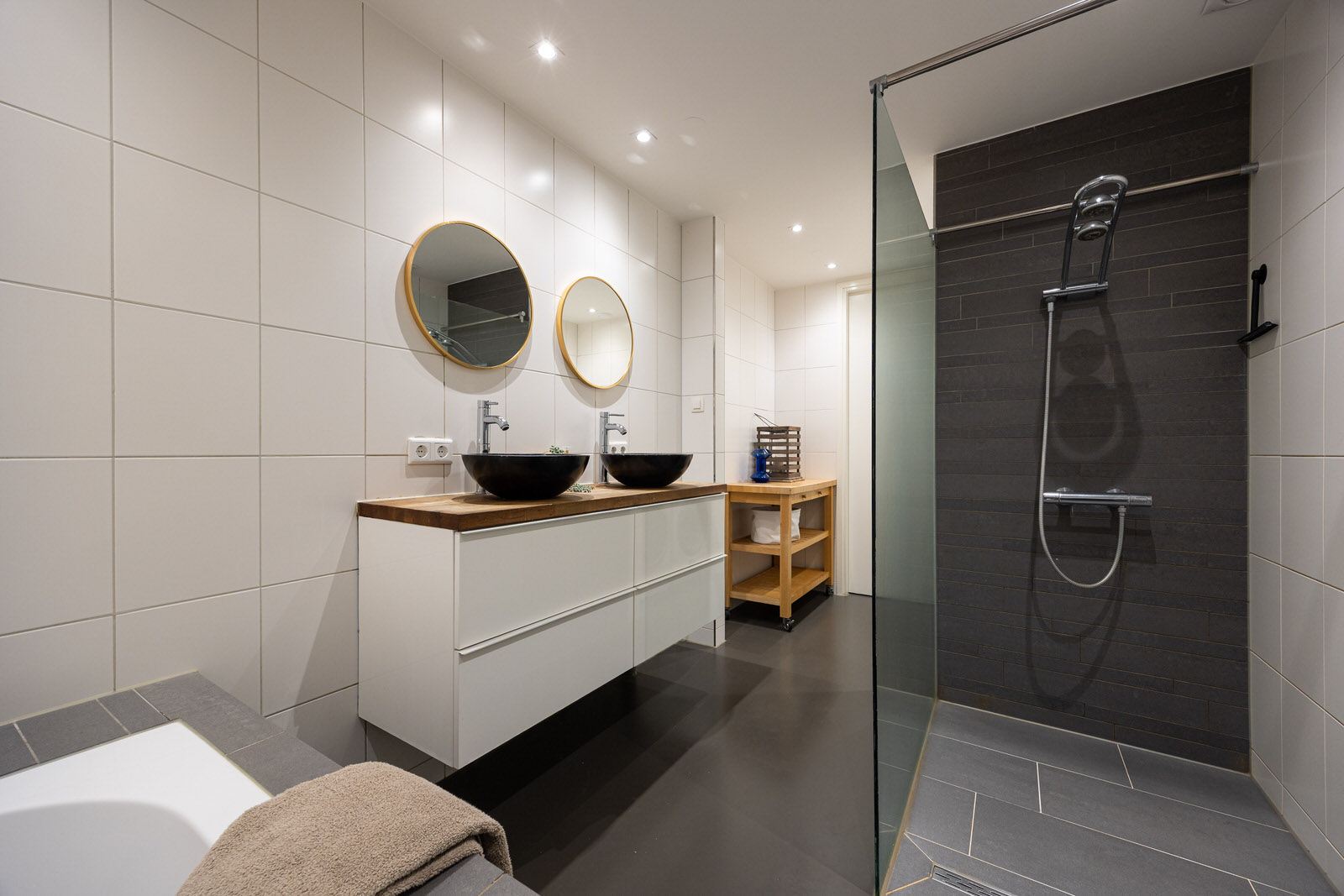 De badkamer is modern uitgevoerd en voorzien van een inloopdouche, een ligbad, een wastafelmeubel met twee waskommen en eigentijdse betegeling. Tevens bevinden zich hier de aansluitingen voor de wasapparatuur, praktisch gegroepeerd in een aparte hoek van de ruimte.