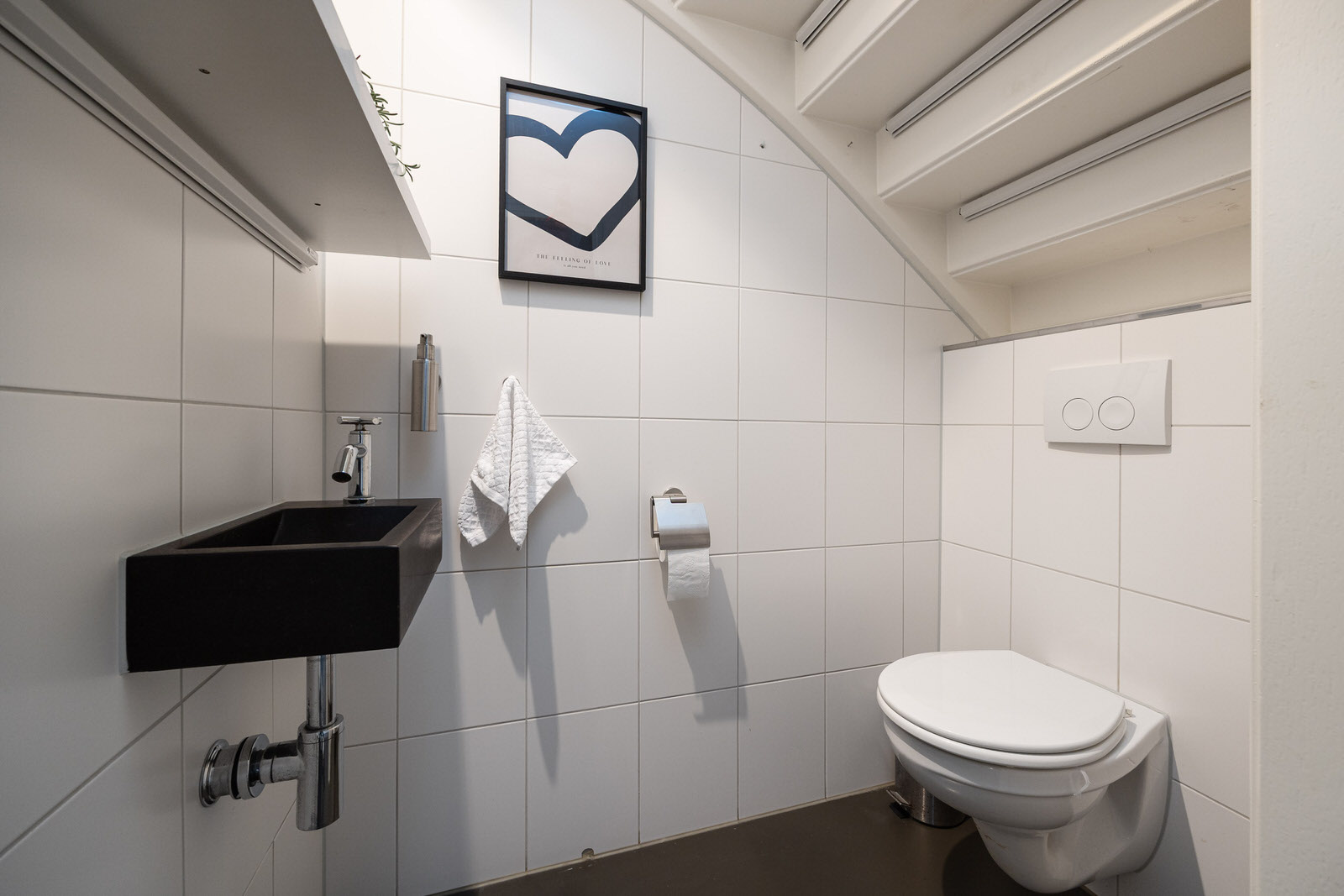De separate toiletruimte is voorzien van een zwevend closet en een fonteintje.