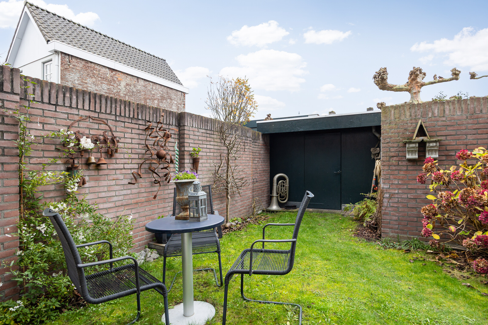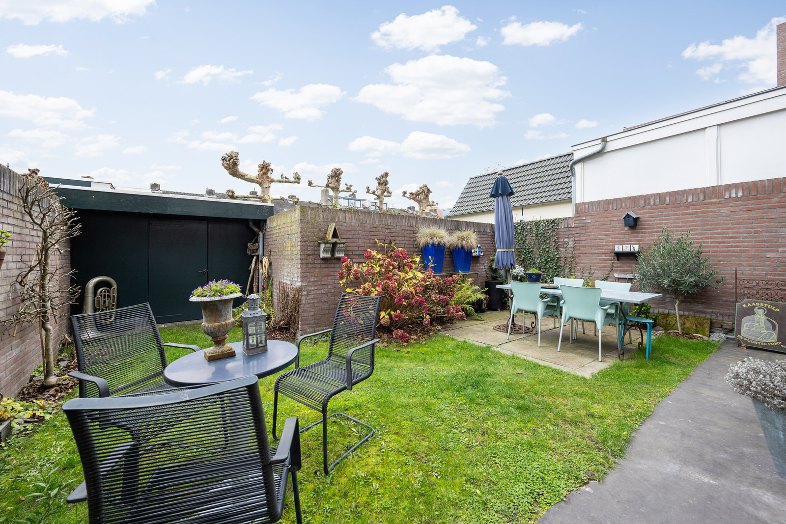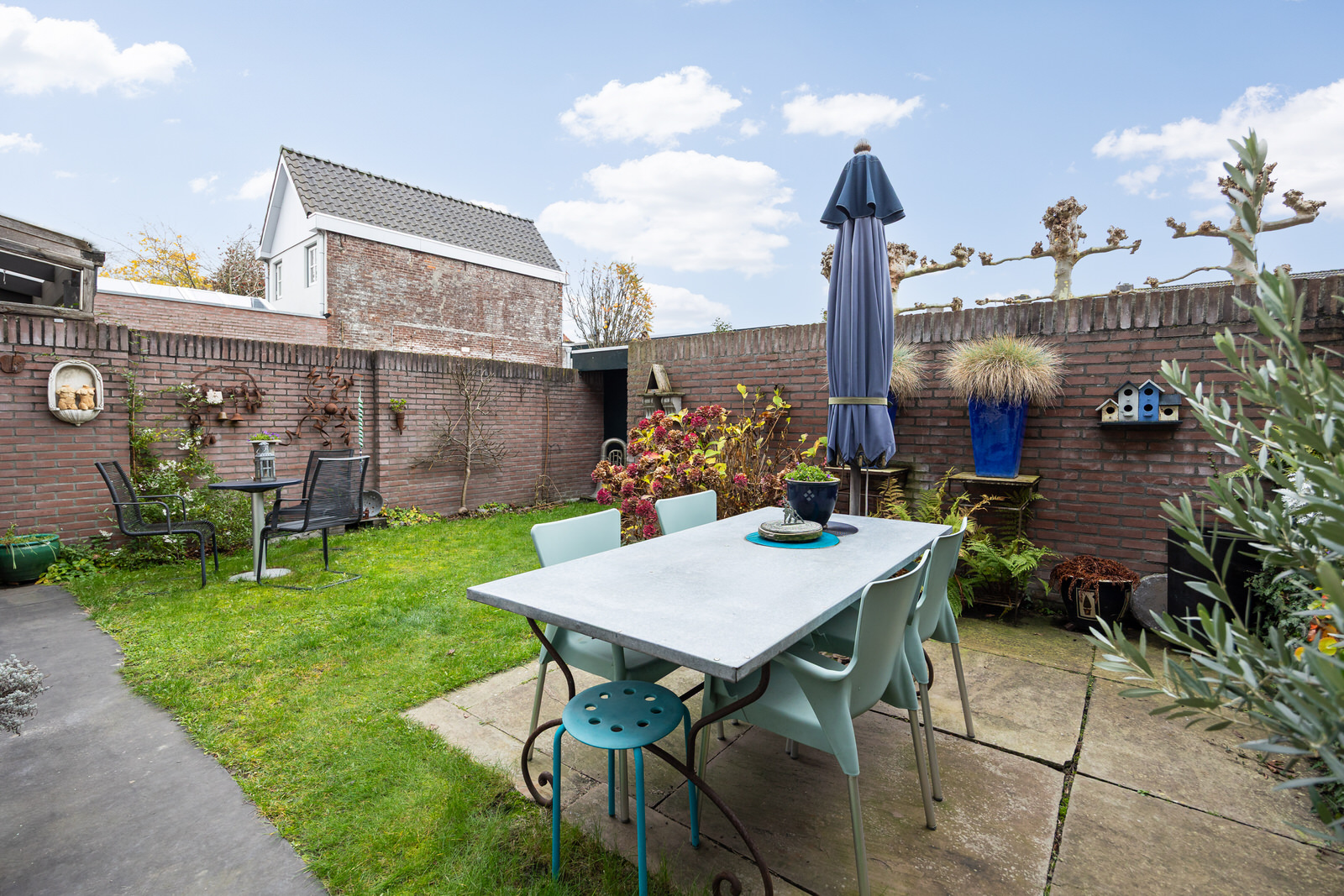 De achtertuin biedt een fijne combinatie van groen, privacy en verschillende zitplekken. Direct achter de woning ligt een terras met ruimte voor een grote eettafel, ideaal voor lange avonden buiten. Achter in de tuin staat een ruime stenen berging met opslagmogelijkheden voor fietsen en tuingereedschap.