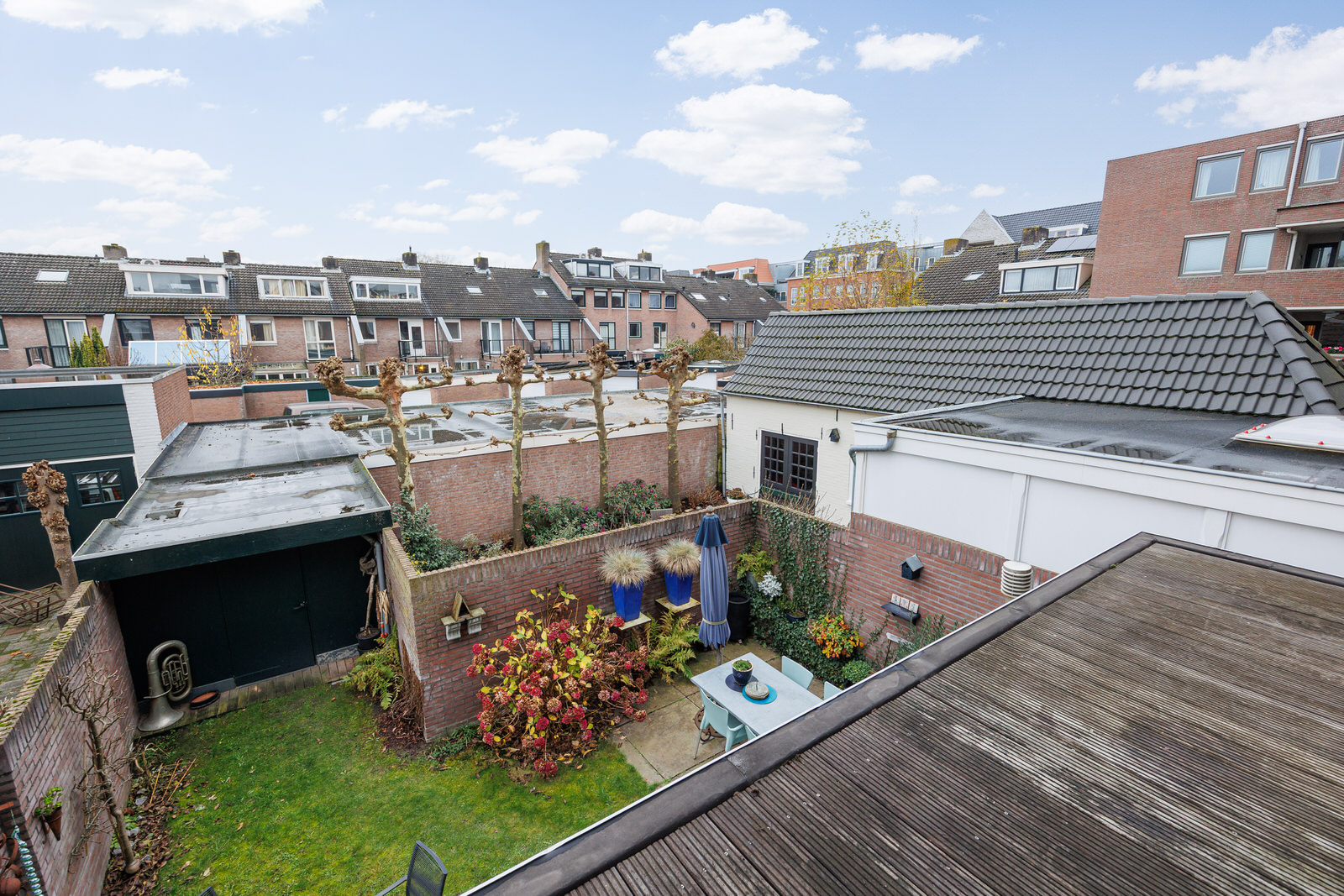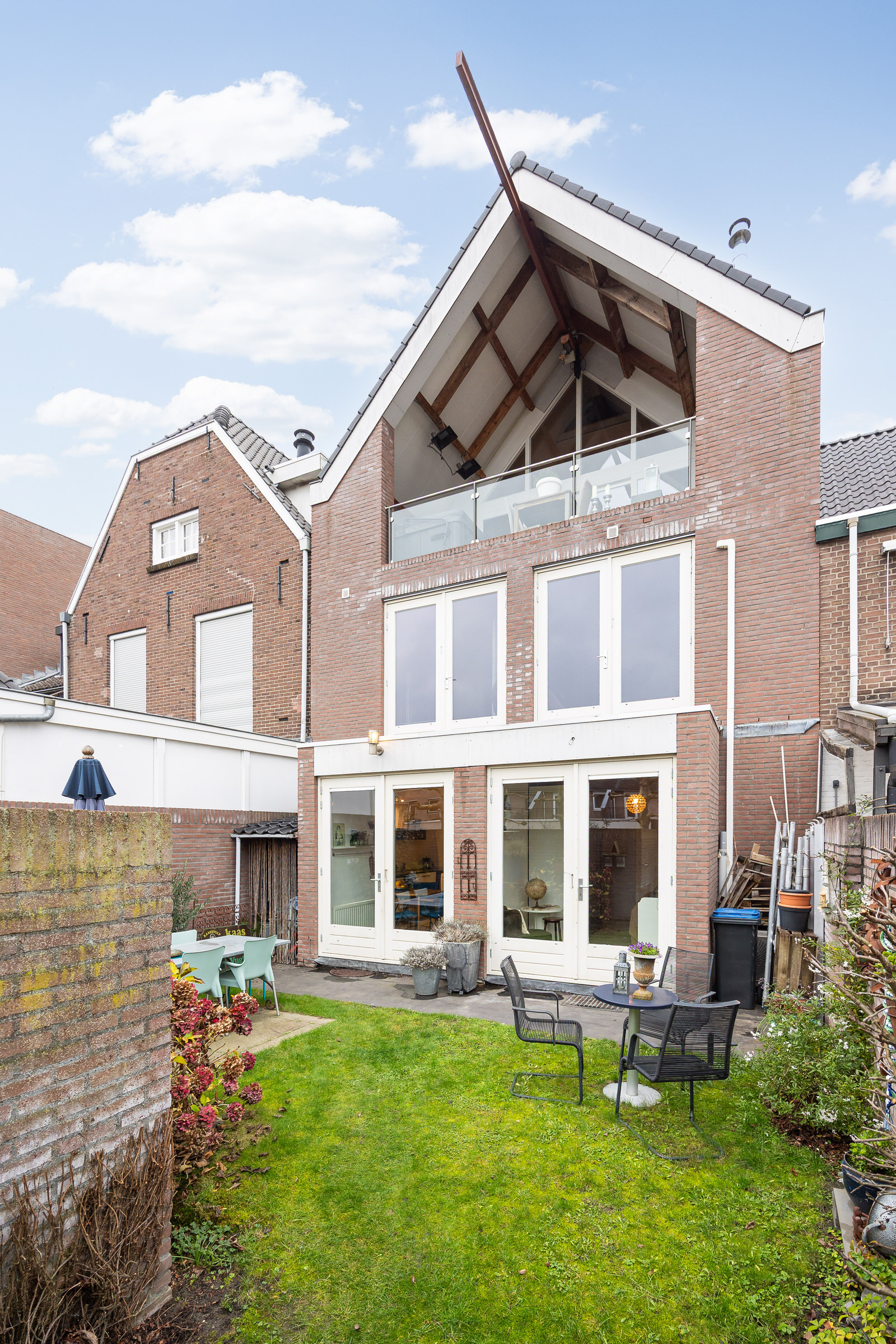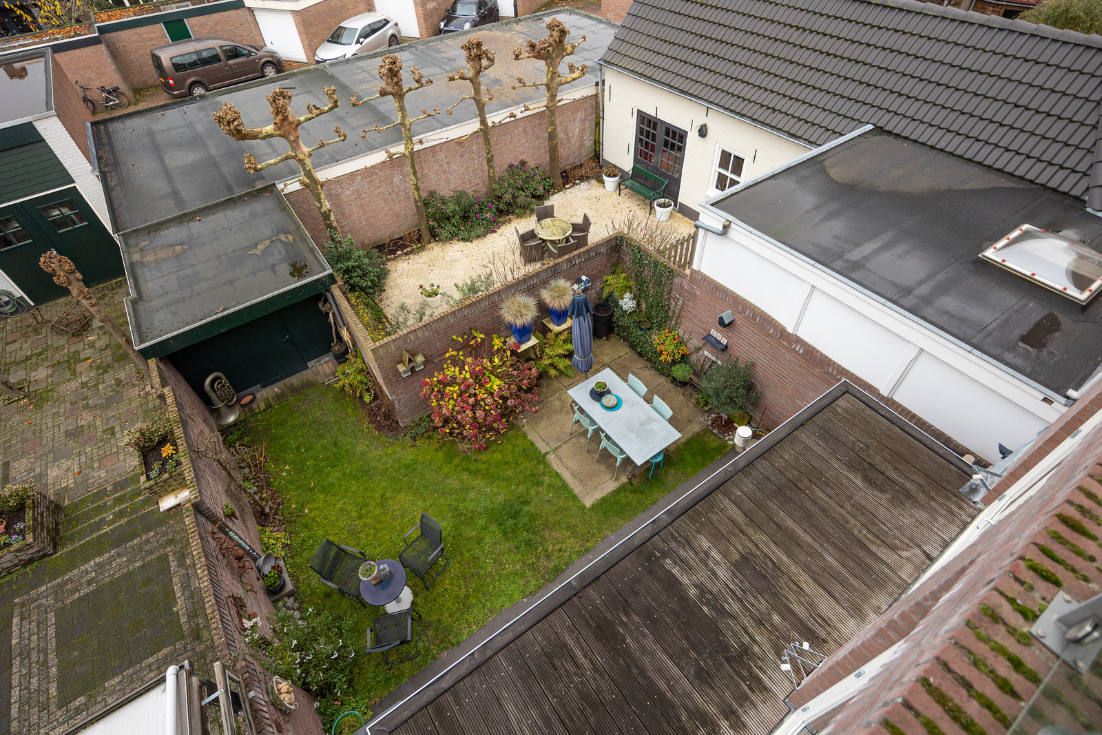 De achtertuin biedt een fijne combinatie van groen, privacy en verschillende zitplekken. Direct achter de woning ligt een terras met ruimte voor een grote eettafel, ideaal voor lange avonden buiten. Achter in de tuin staat een ruime stenen berging met opslagmogelijkheden voor fietsen en tuingereedschap.