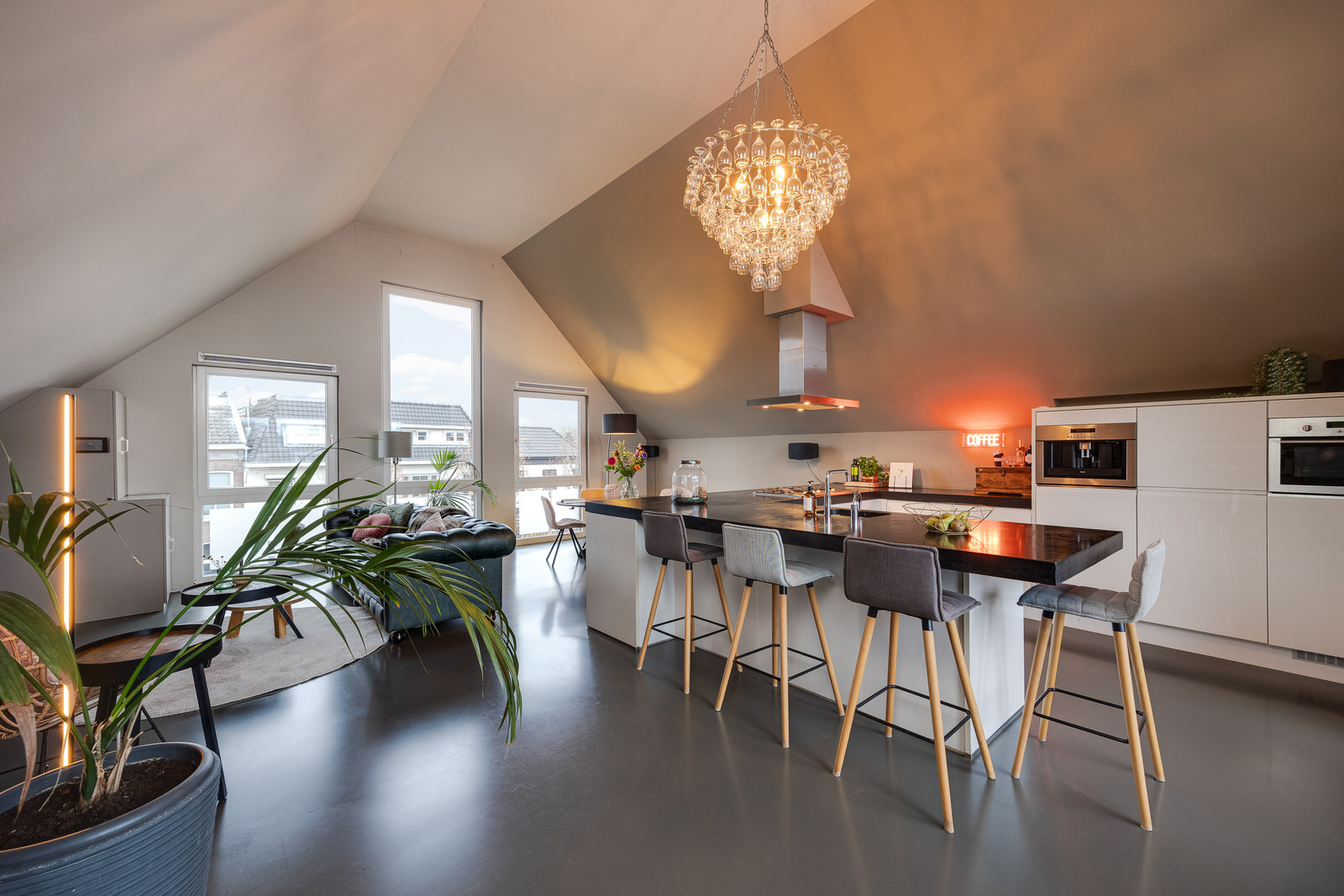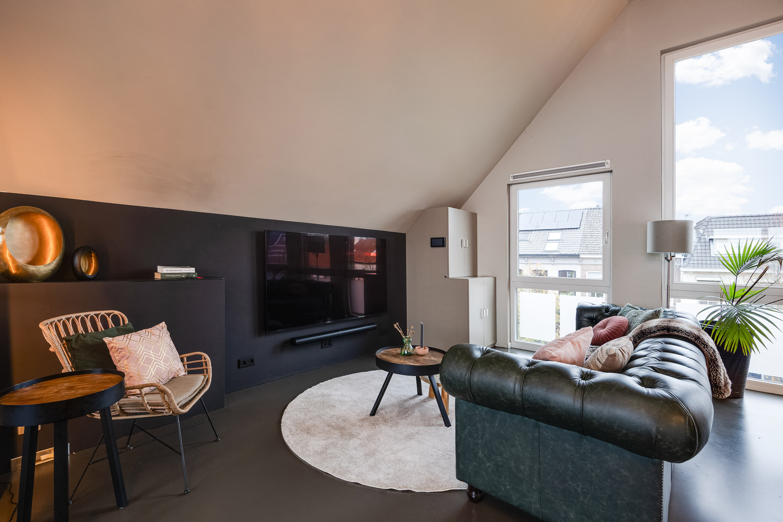 De tweede verdieping vormt één grote, open leefruimte met een indrukwekkende hoogte onder de kap. De combinatie van licht en ruimte zorgt voor een warme en stijlvolle woonlaag met een loftachtige uitstraling.