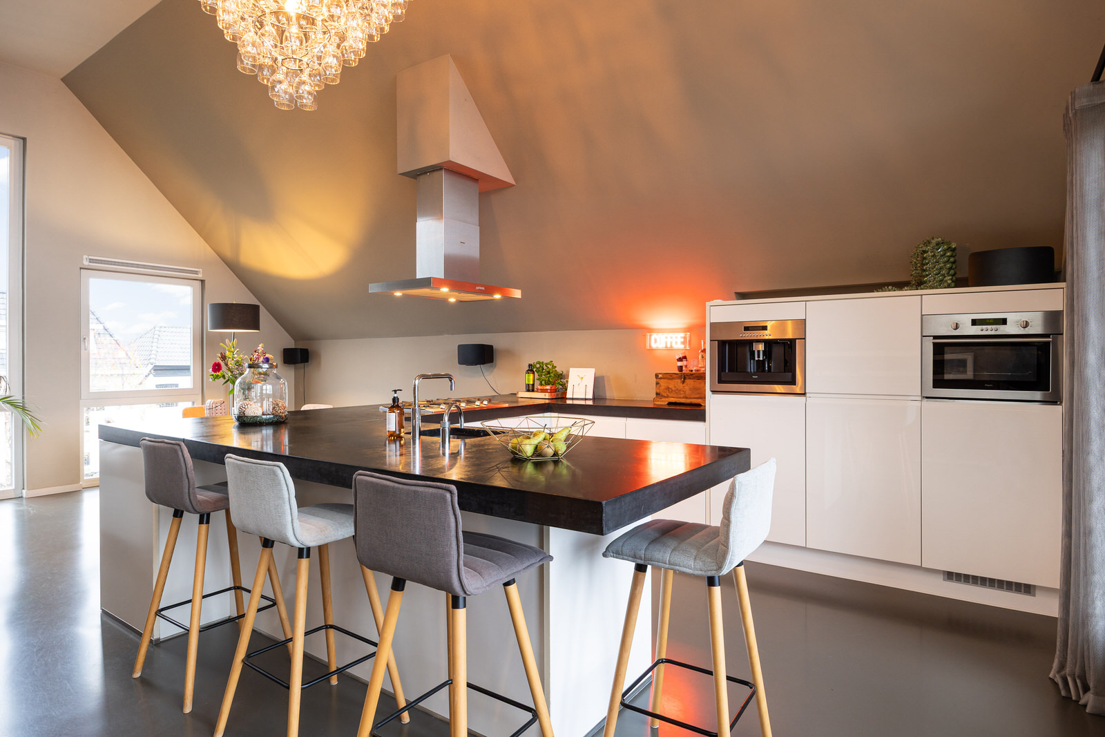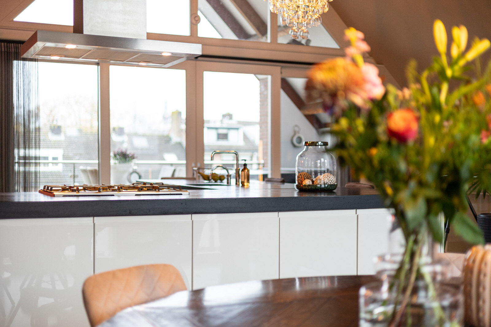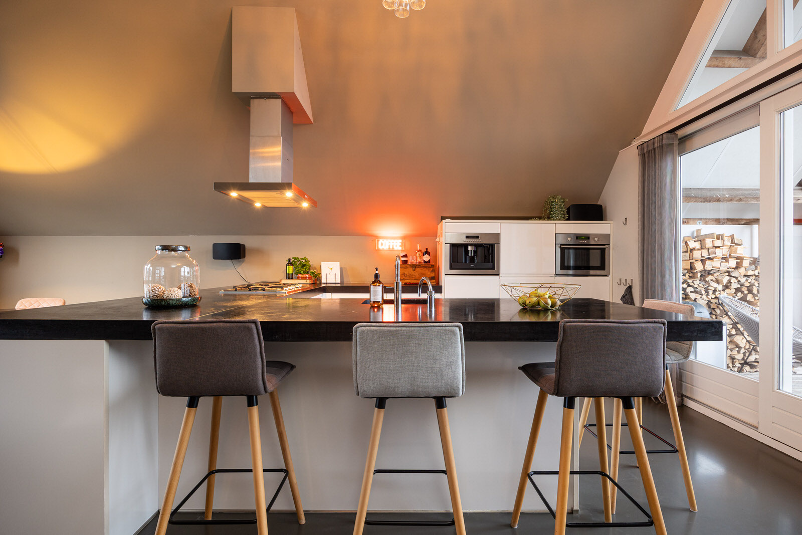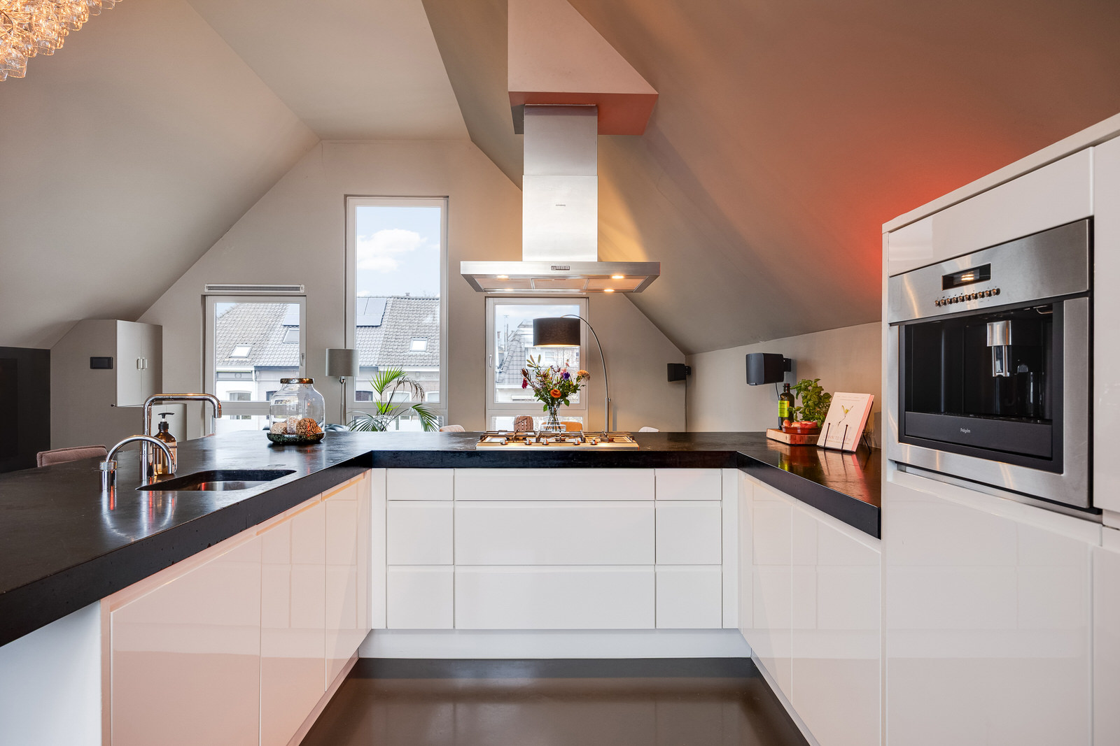 De moderne keuken is uitgevoerd in een ruime U-opstelling en beschikt over diverse inbouwapparaten, waaronder een Quooker-kraan, een ingebouwd koffiezetapparaat, een combi-oven, een koelkast, vier vrieslades, een 5-pits gaskookplaat met wokbrander, een afzuigkap, een vaatwasser en een Bodega43-wijnkast. Er is volop werk- en bergruimte aanwezig en het kook- en werkeiland vormt een natuurlijk middelpunt in de leefruimte. Door de schuifpui naar de loggia ontstaat er een fijne verbinding met buiten.