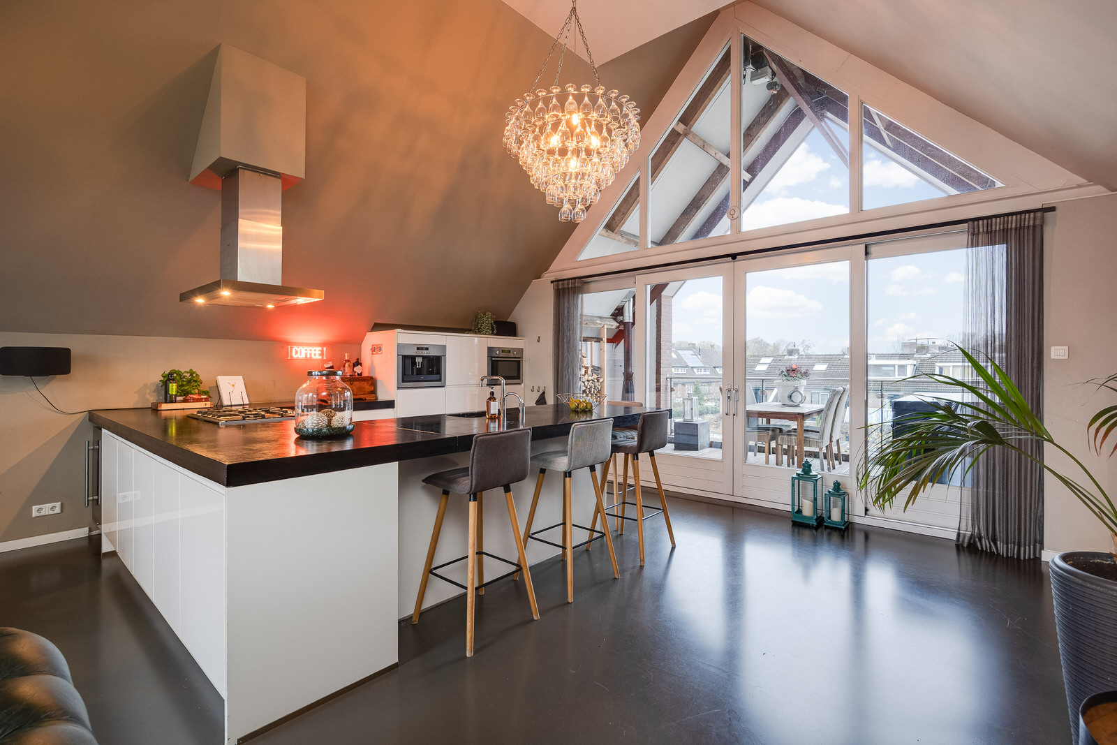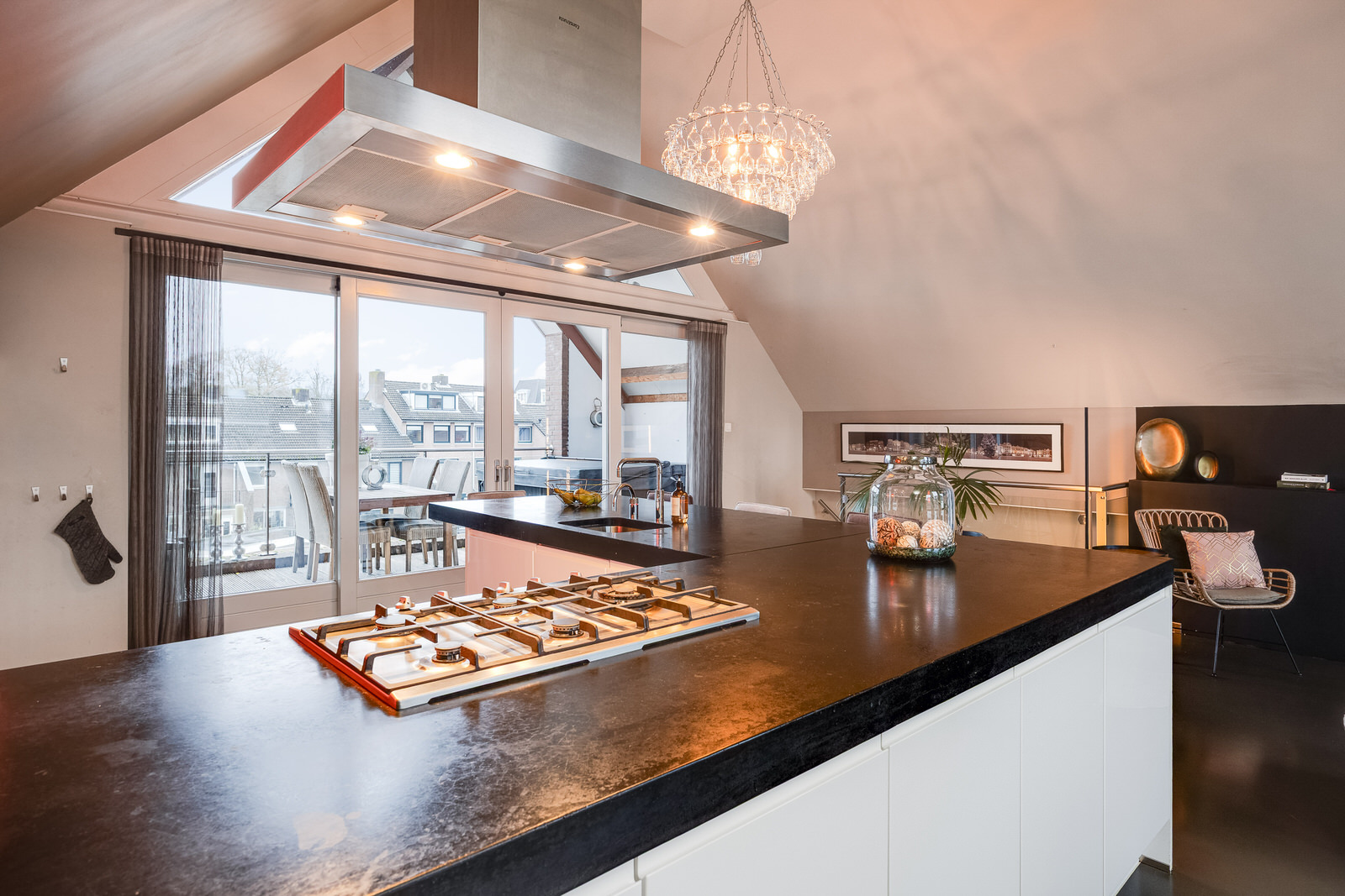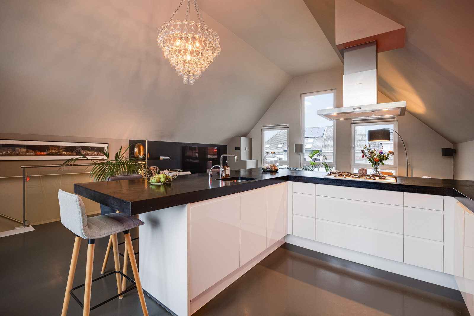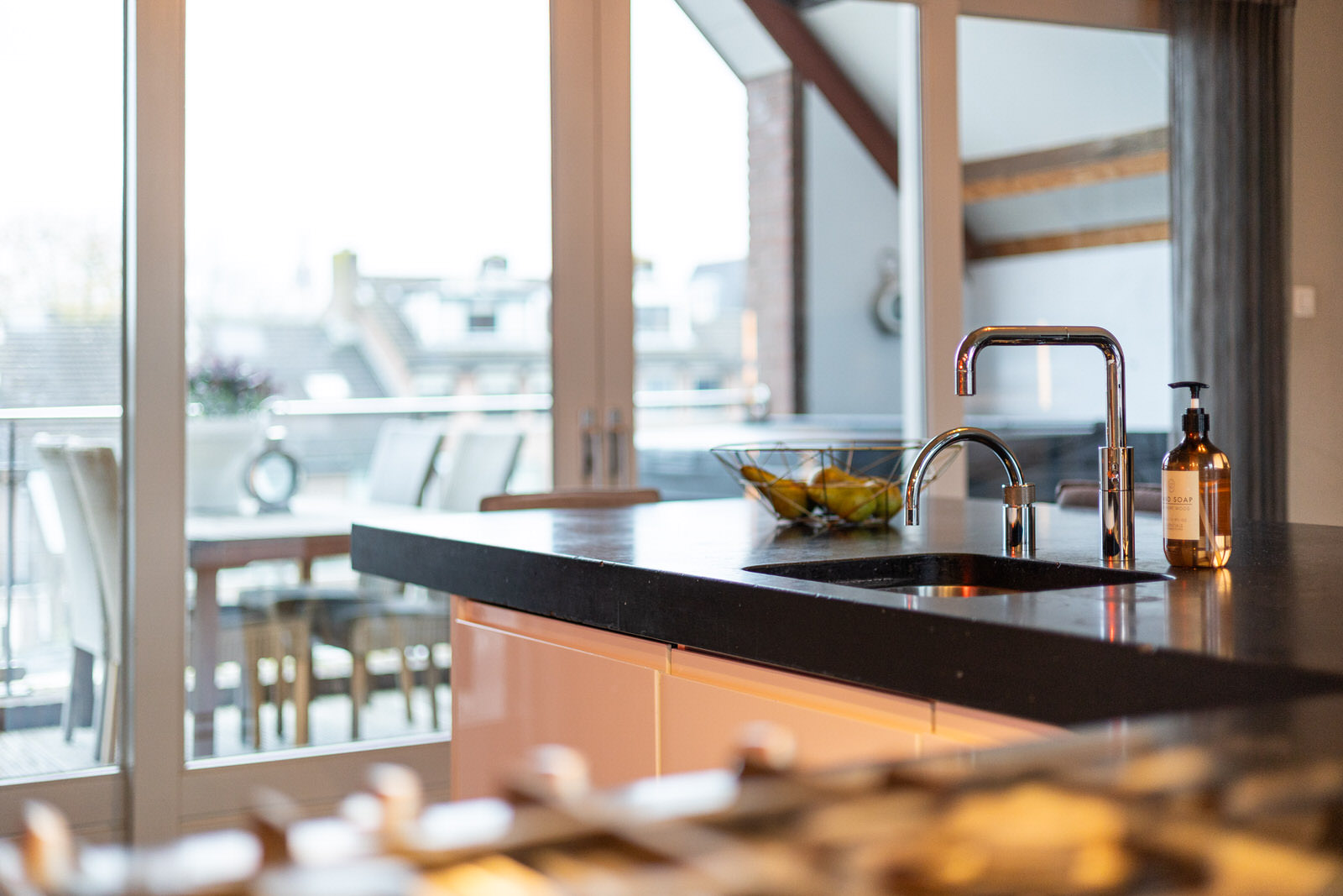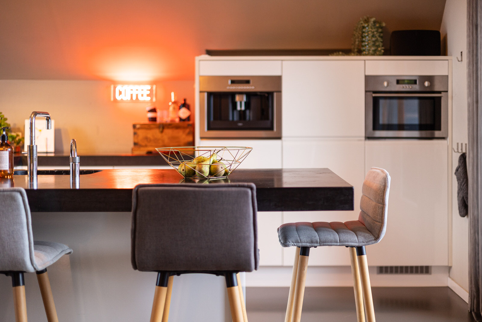 De moderne keuken is uitgevoerd in een ruime U-opstelling en beschikt over diverse inbouwapparaten, waaronder een Quooker-kraan, een ingebouwd koffiezetapparaat, een combi-oven, een koelkast, vier vrieslades, een 5-pits gaskookplaat met wokbrander, een afzuigkap, een vaatwasser en een Bodega43-wijnkast. Er is volop werk- en bergruimte aanwezig en het kook- en werkeiland vormt een natuurlijk middelpunt in de leefruimte. Door de schuifpui naar de loggia ontstaat er een fijne verbinding met buiten.