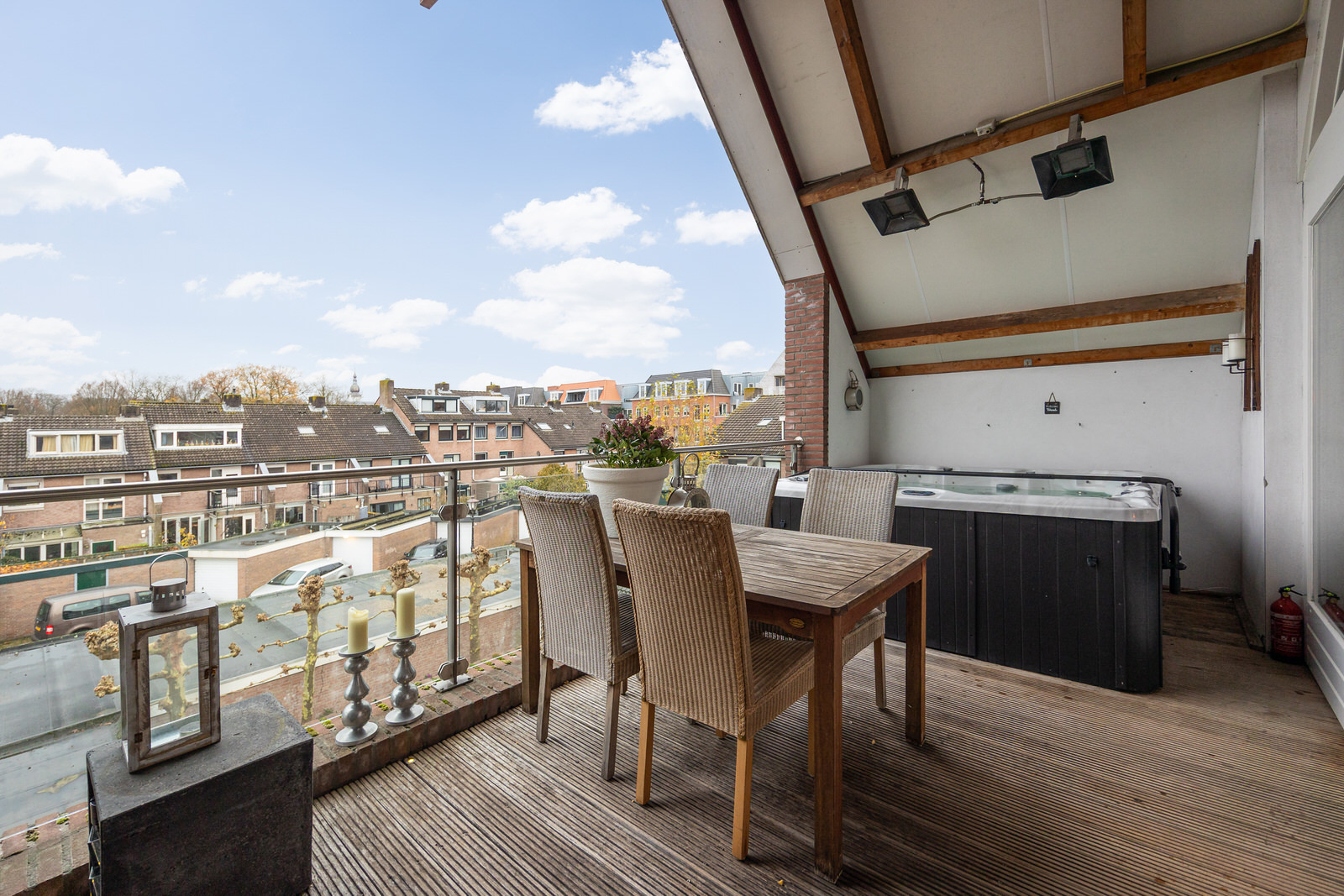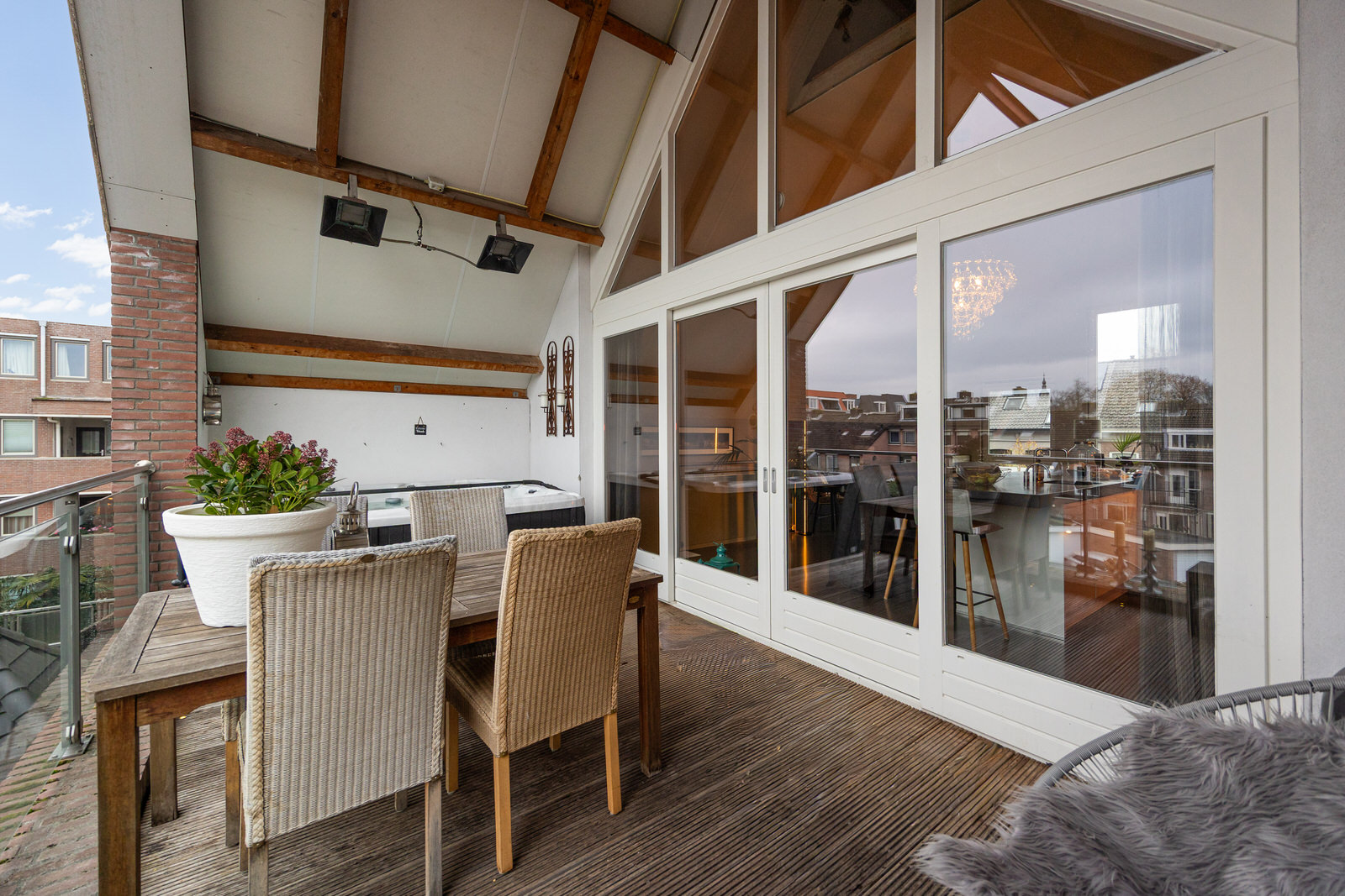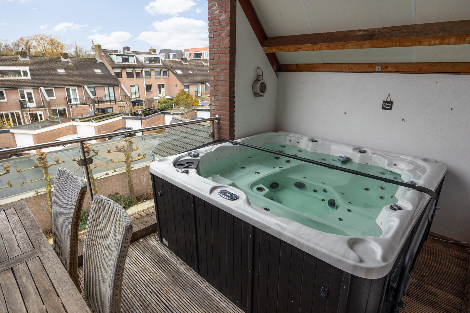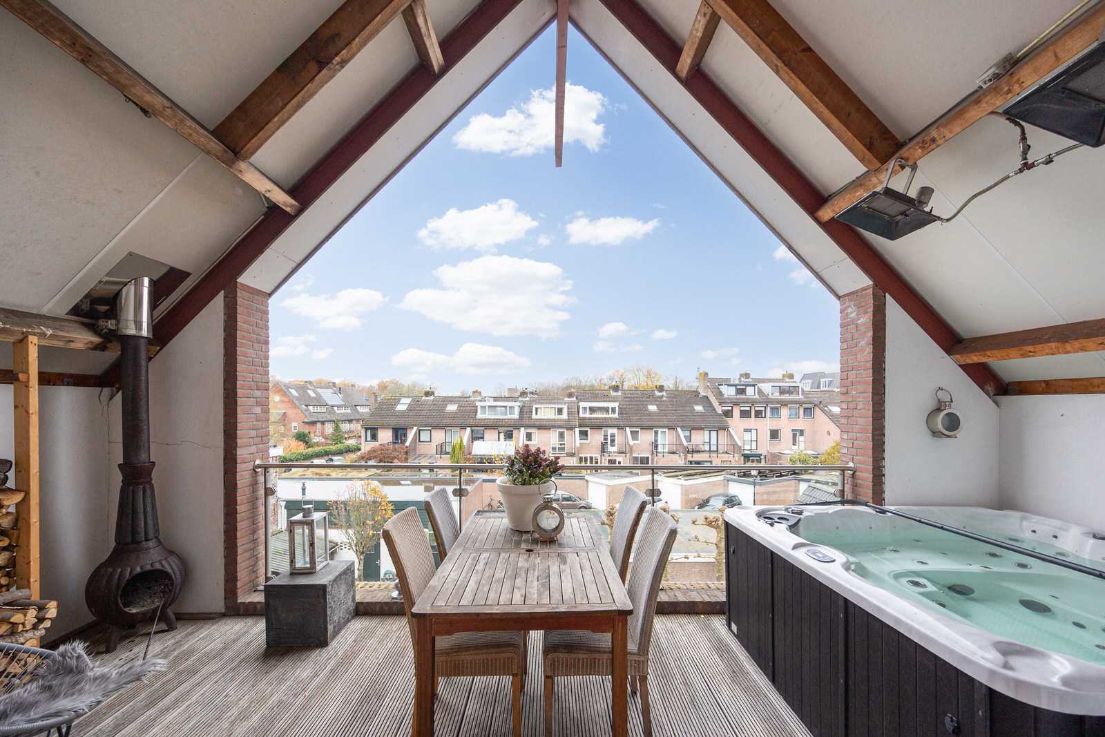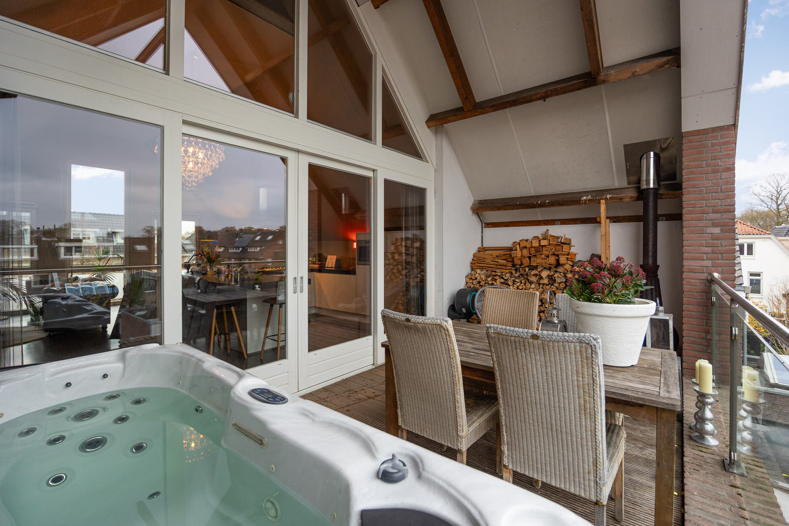 Dankzij de royale afmetingen en de overkapping ontstaat hier een sfeervolle en beschutte buitenruimte die het hele jaar door comfortabel te gebruiken is. De loggia is voorzien van twee terrasheaters en een houtgestookte buitenkachel, waardoor het ook op koelere dagen een aangename plek blijft. De aanwezige jacuzzi (ter overname) is fraai geïntegreerd onder de overkapping. Aan de voorzijde zorgt de glazen balustrade voor een open en ruimtelijk gevoel, met zicht op de achterliggende woonomgeving.