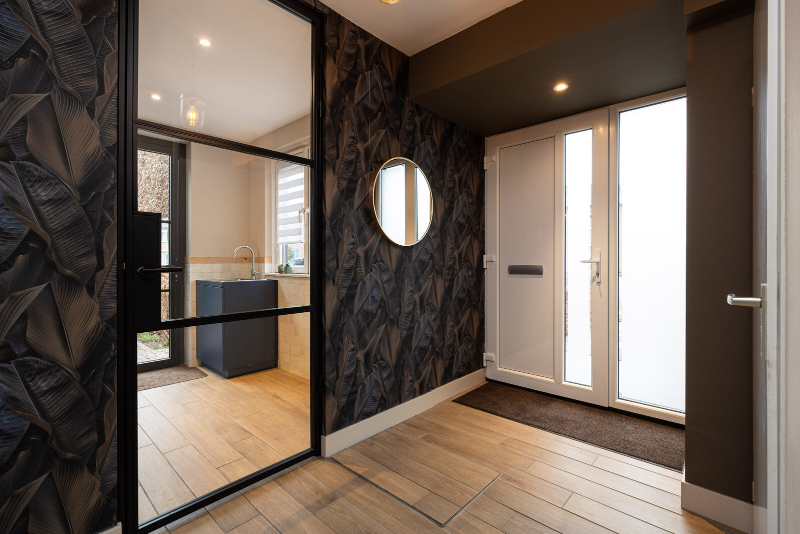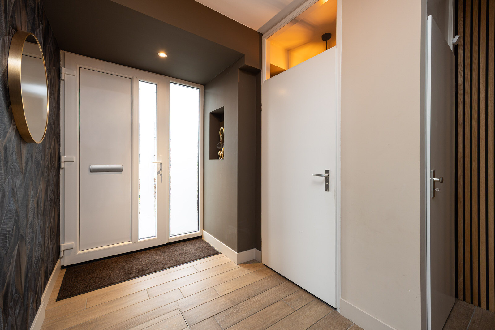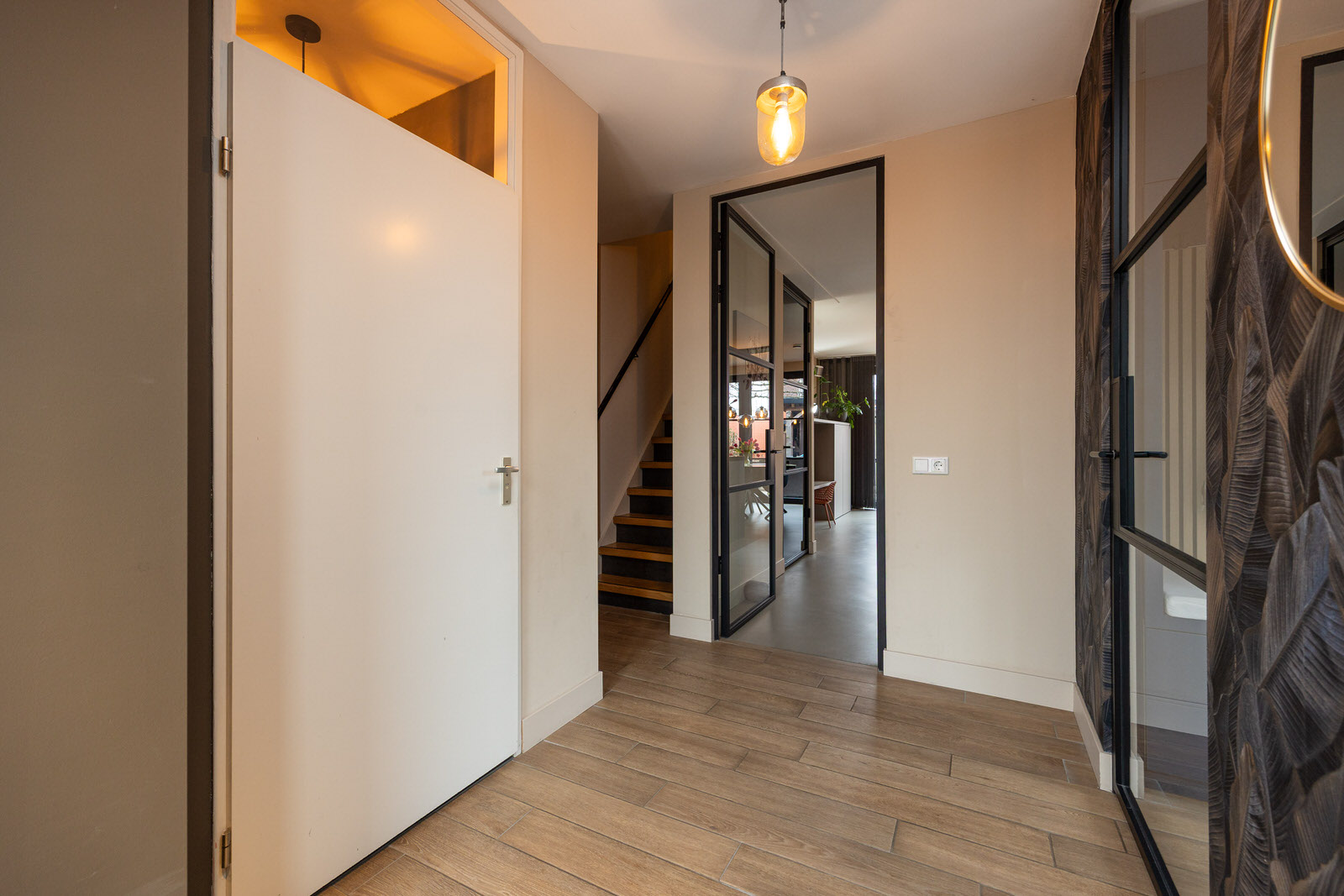 De hal vormt een prettige en verzorgde binnenkomst. De ruimte is strak afgewerkt en zet direct de toon voor de rest van de woning. De houtlook tegelvloer loopt hier door en in combinatie met de moderne afwerking en het rustige kleurgebruik ontstaat een uitnodigende entree waar je comfortabel binnenkomt.