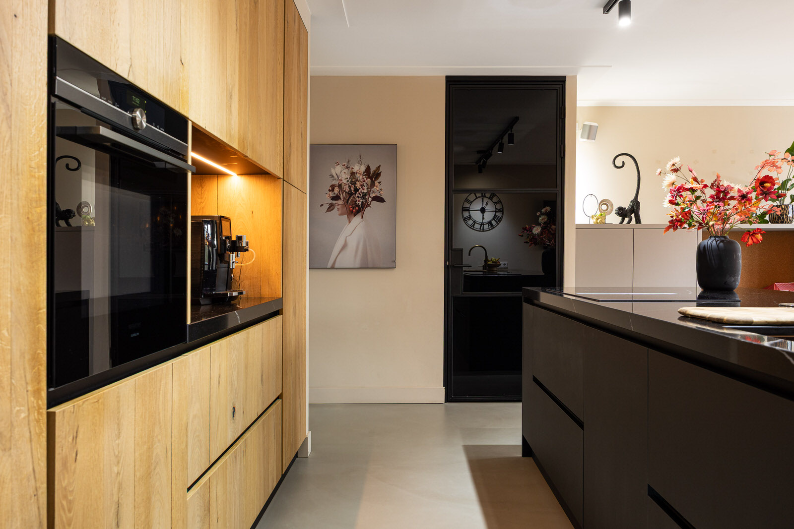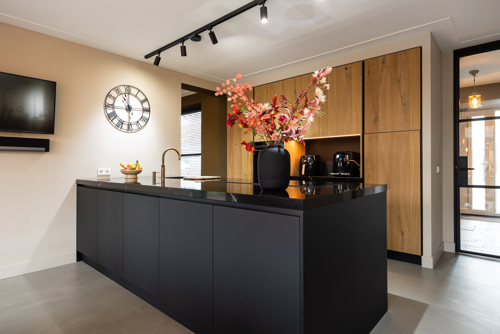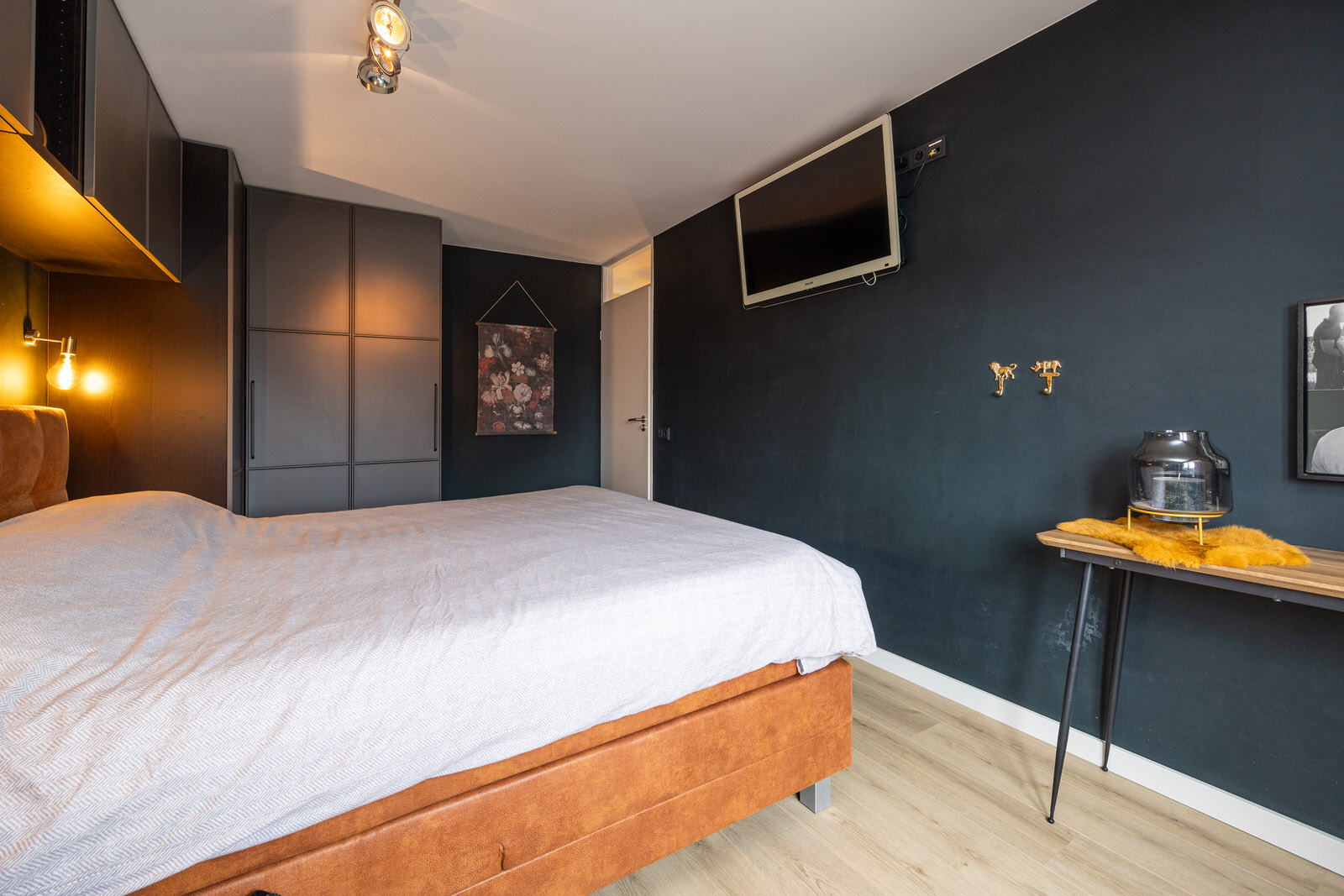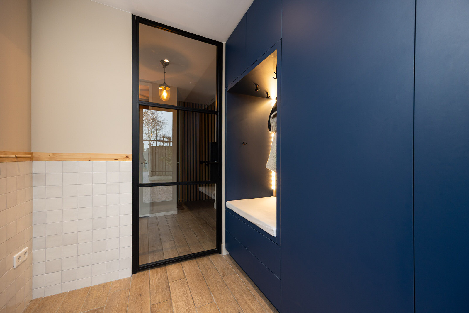 De hal vormt een prettige en verzorgde binnenkomst. De ruimte is strak afgewerkt en zet direct de toon voor de rest van de woning. De houtlook tegelvloer loopt hier door en in combinatie met de moderne afwerking en het rustige kleurgebruik ontstaat een uitnodigende entree waar je comfortabel binnenkomt.
