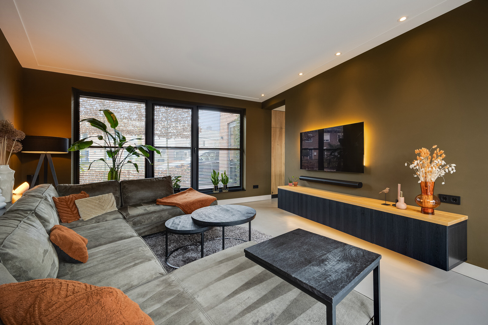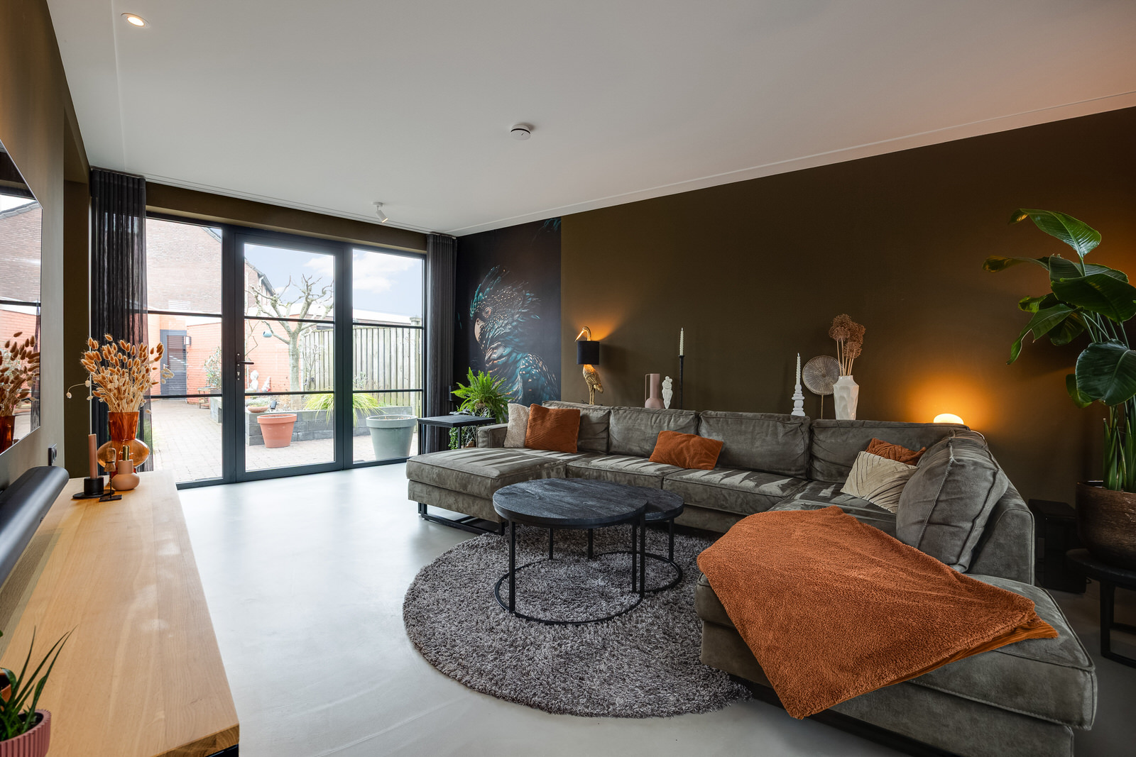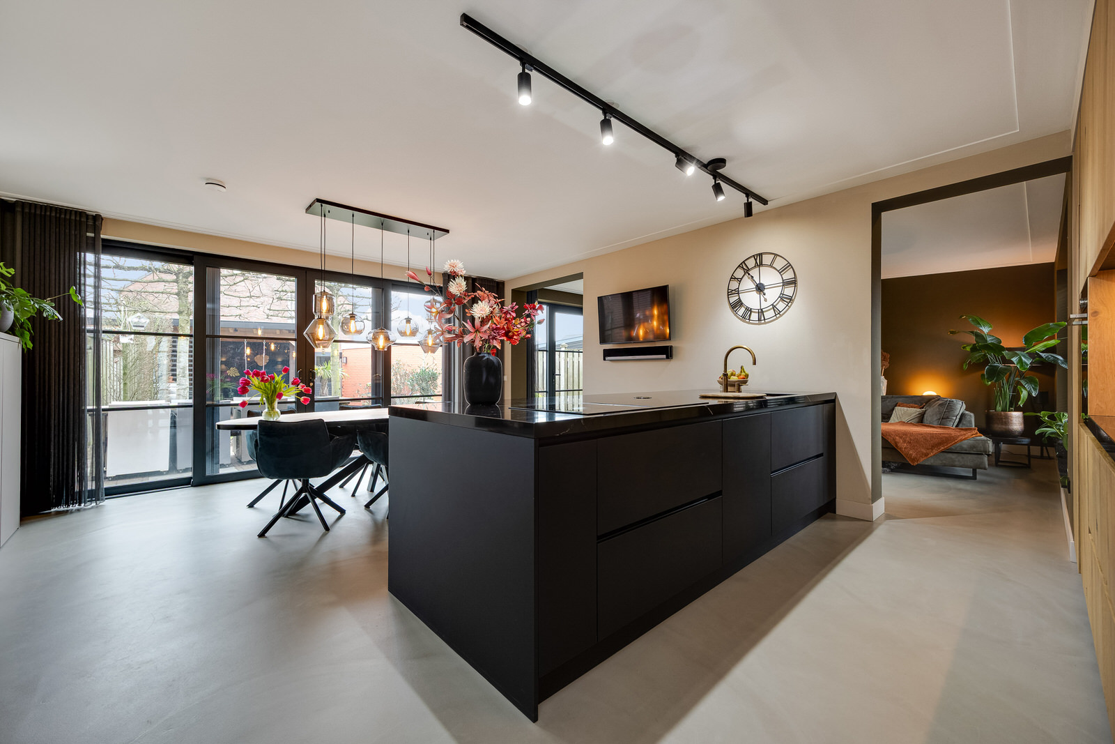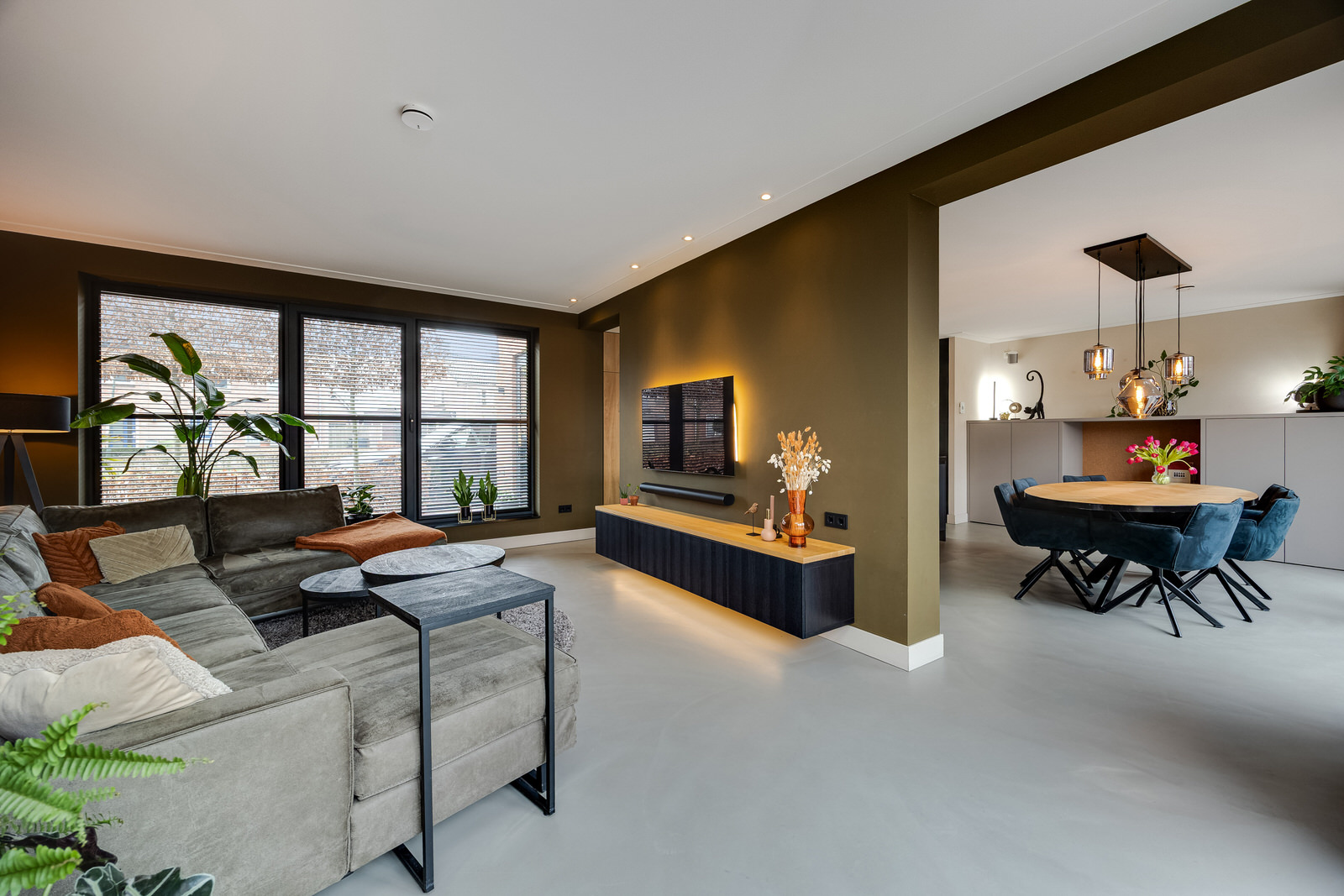 De woonkamer bevindt zich in de aanbouw en vormt een prettige, lichte leefruimte met een duidelijke focus op comfort en buitenleven. De begane grond is voorzien van vloerverwarming en afgewerkt met een gietvloer, wat zorgt voor een comfortabel en gelijkmatig verwarmd woonklimaat. Dankzij de royale opzet, de grote glaspartijen en de openslaande deuren naar de tuin lopen binnen en buiten hier op een natuurlijke manier in elkaar over. De woonkamer is in 2021 gerealiseerd tijdens de uitbouw en vormt samen met de woonkeuken een logisch en ruim geheel. De ramen aan de voorzijde zijn voorzien van elektrisch bedienbare screens en op maat gemaakte jaloezieën, wat bijdraagt aan comfort en privacy.