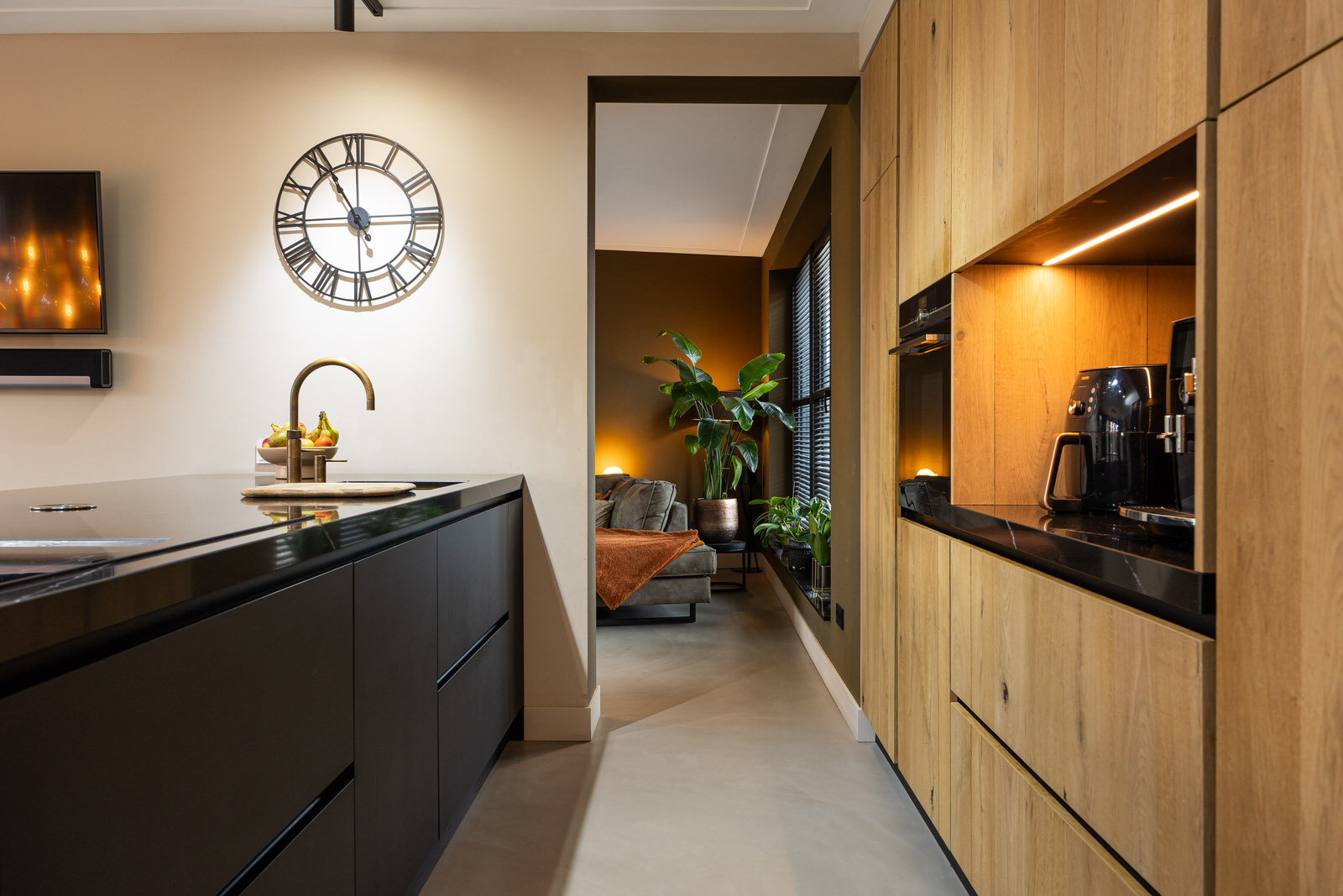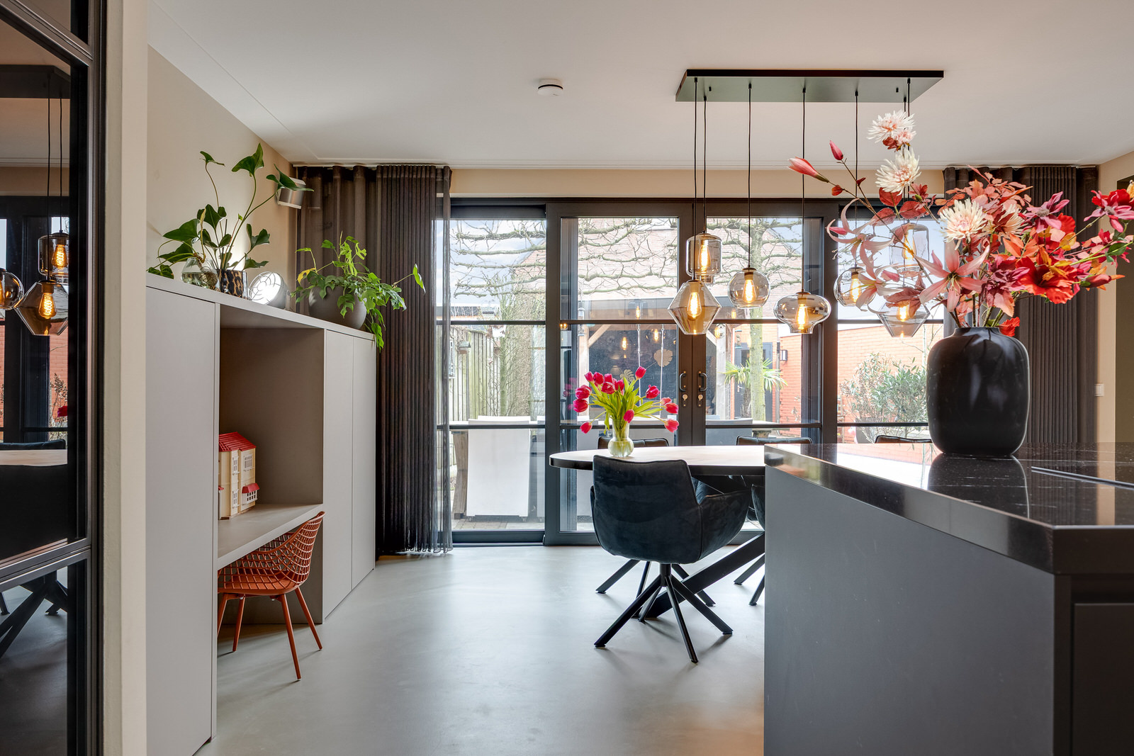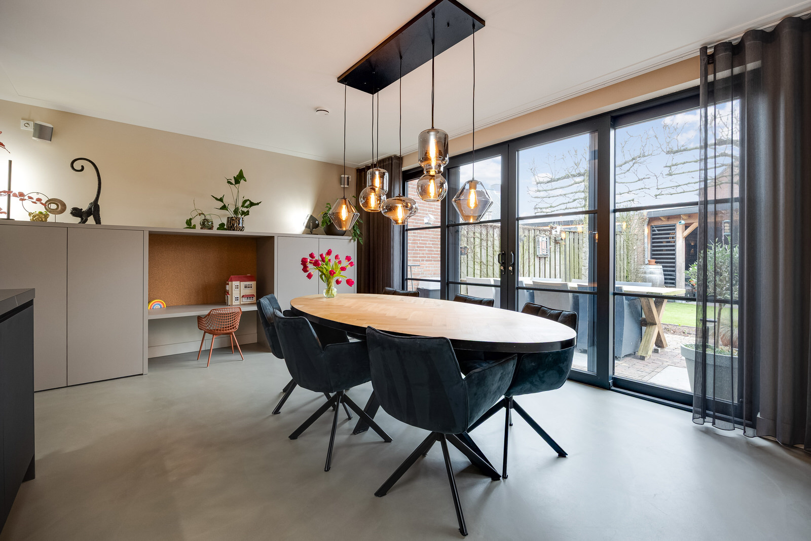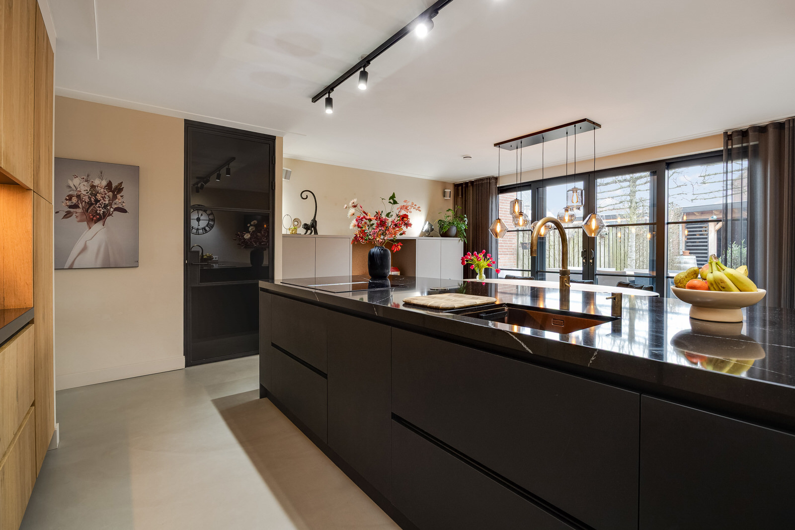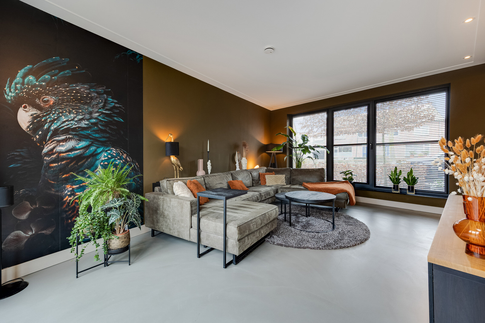 De woonkamer bevindt zich in de aanbouw en vormt een prettige, lichte leefruimte met een duidelijke focus op comfort en buitenleven. De begane grond is voorzien van vloerverwarming en afgewerkt met een gietvloer, wat zorgt voor een comfortabel en gelijkmatig verwarmd woonklimaat. Dankzij de royale opzet, de grote glaspartijen en de openslaande deuren naar de tuin lopen binnen en buiten hier op een natuurlijke manier in elkaar over. De woonkamer is in 2021 gerealiseerd tijdens de uitbouw en vormt samen met de woonkeuken een logisch en ruim geheel. De ramen aan de voorzijde zijn voorzien van elektrisch bedienbare screens en op maat gemaakte jaloezieën, wat bijdraagt aan comfort en privacy.
