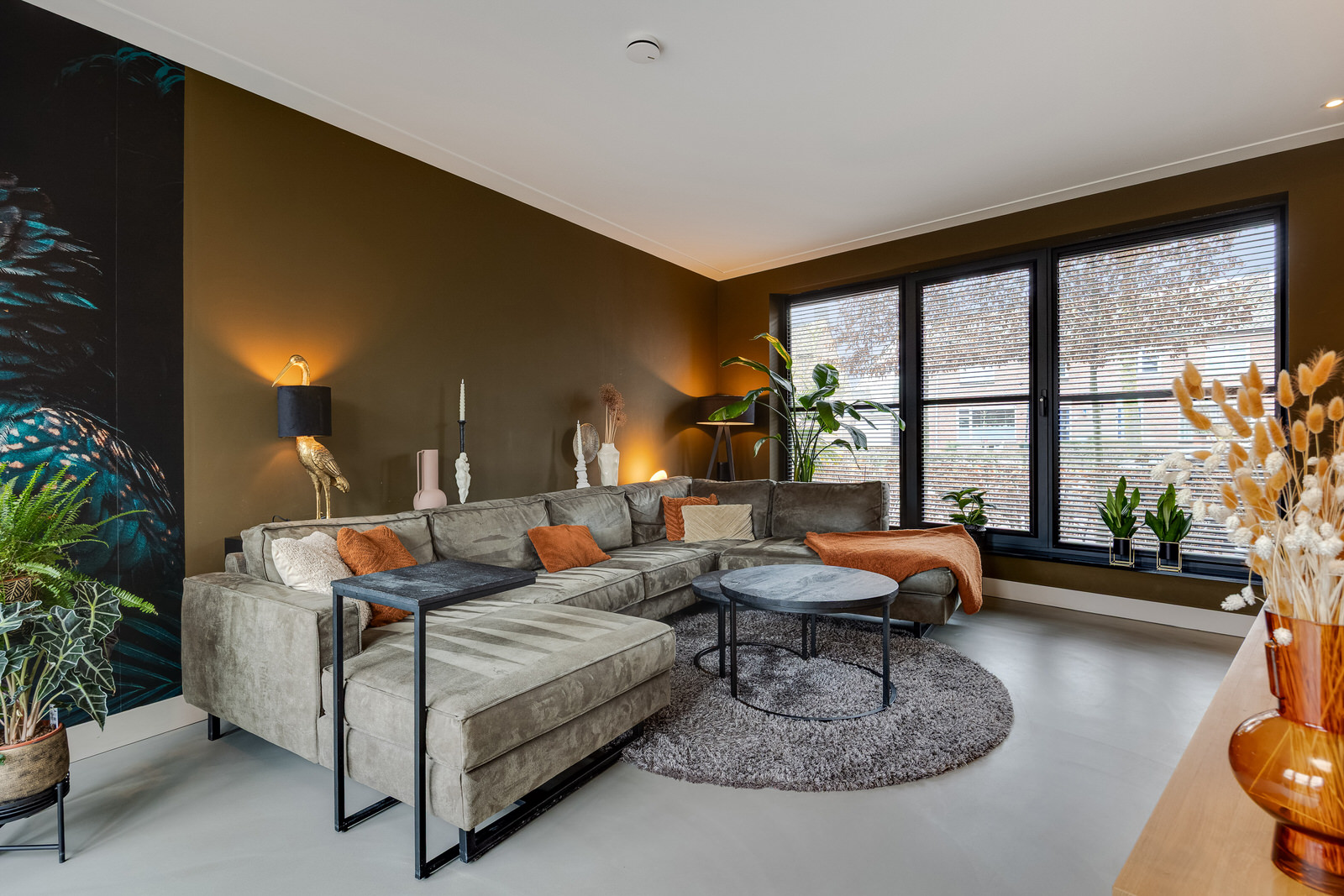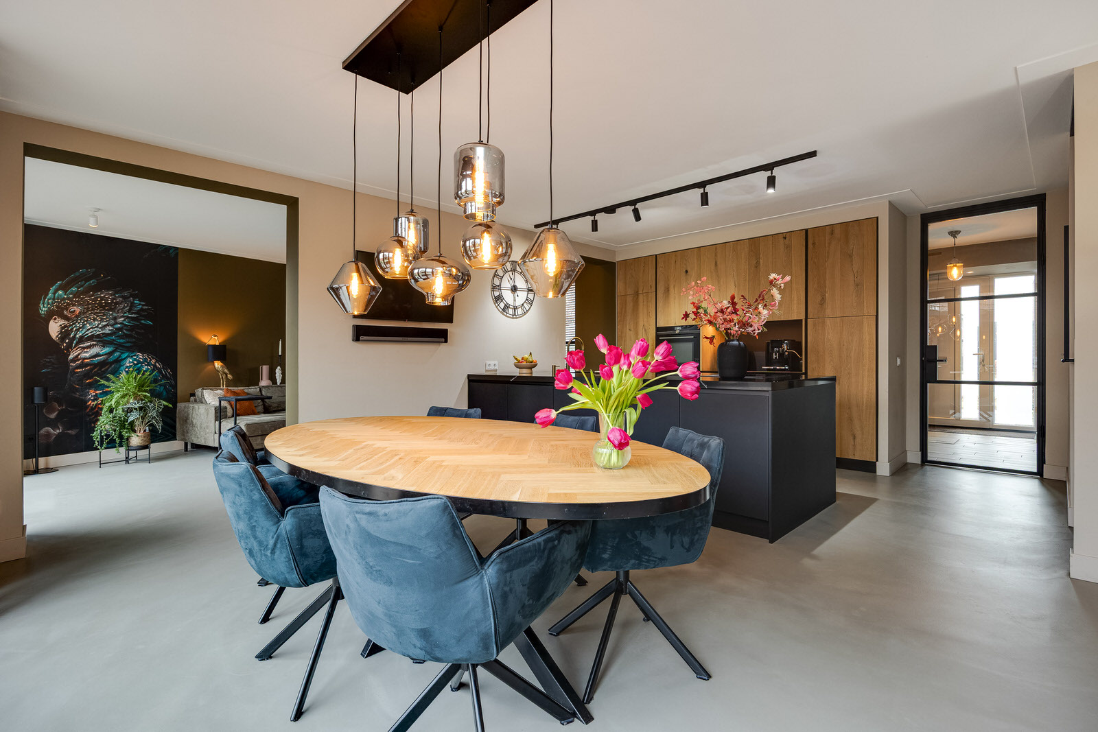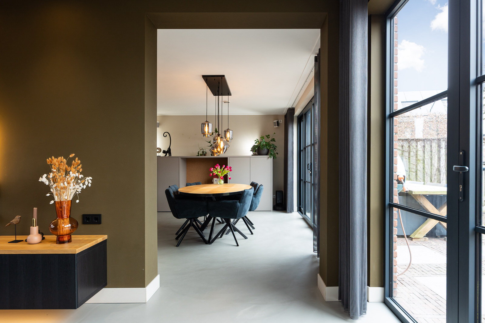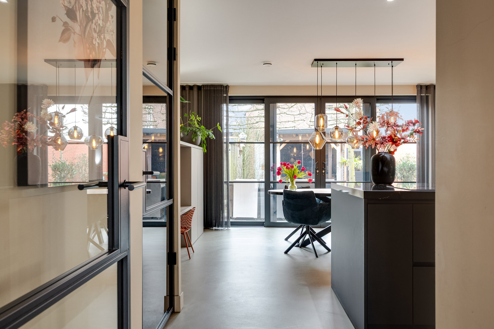 De woonkamer bevindt zich in de aanbouw en vormt een prettige, lichte leefruimte met een duidelijke focus op comfort en buitenleven. De begane grond is voorzien van vloerverwarming en afgewerkt met een gietvloer, wat zorgt voor een comfortabel en gelijkmatig verwarmd woonklimaat. Dankzij de royale opzet, de grote glaspartijen en de openslaande deuren naar de tuin lopen binnen en buiten hier op een natuurlijke manier in elkaar over. De woonkamer is in 2021 gerealiseerd tijdens de uitbouw en vormt samen met de woonkeuken een logisch en ruim geheel. De ramen aan de voorzijde zijn voorzien van elektrisch bedienbare screens en op maat gemaakte jaloezieën, wat bijdraagt aan comfort en privacy.