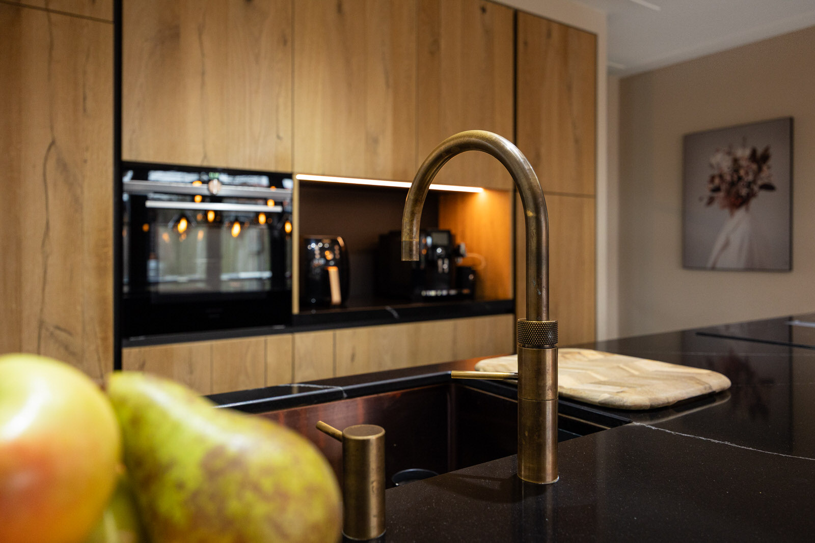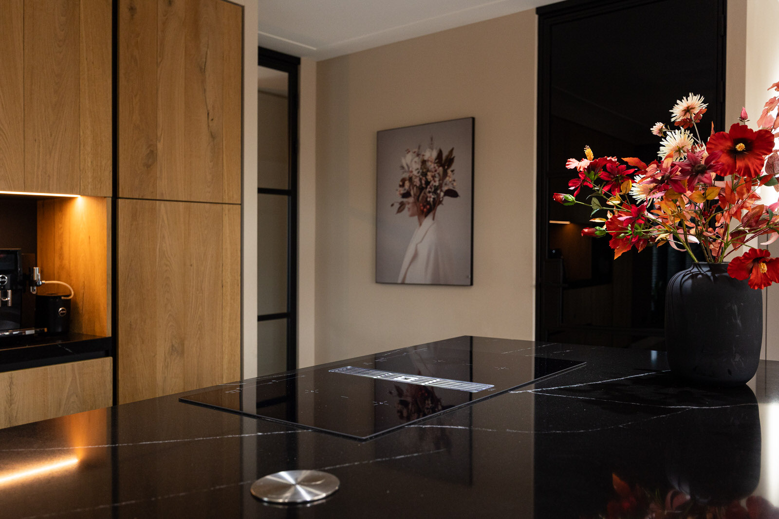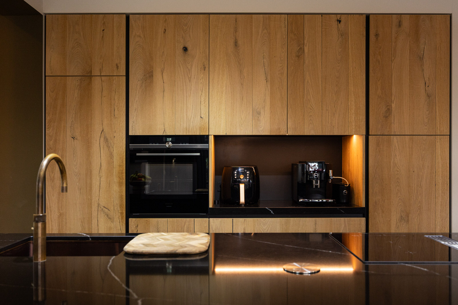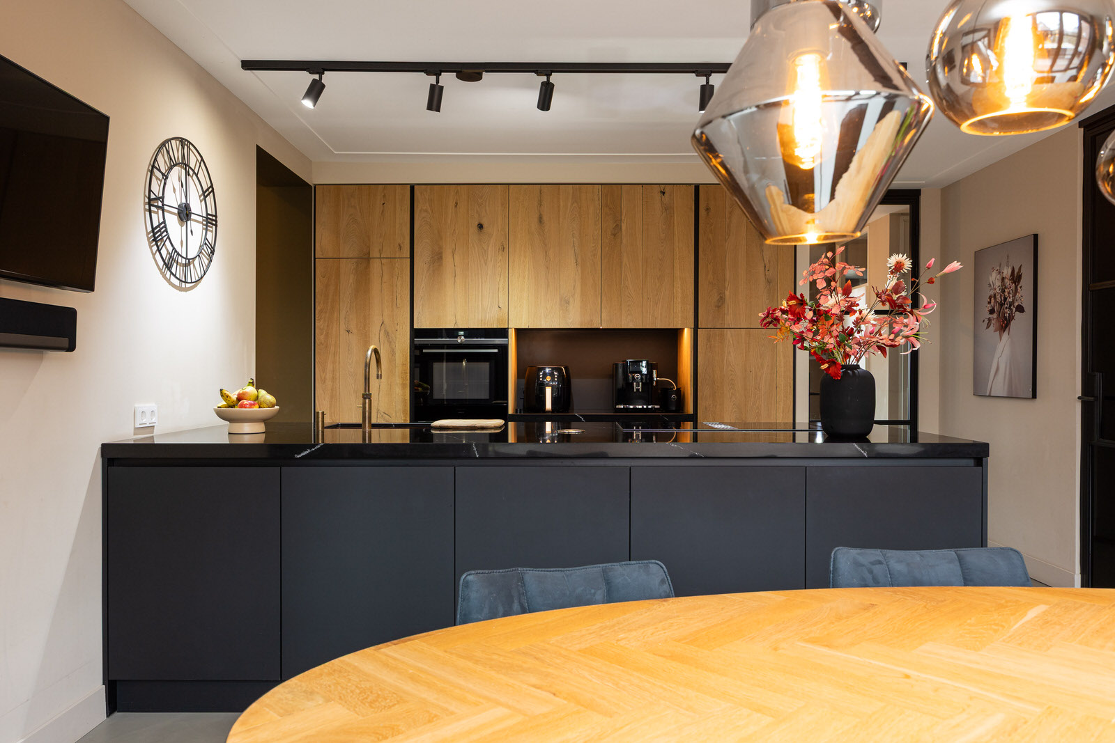 De keuken is geplaatst tijdens de uitbouw en verbouwing van 2021 en vormt samen met de eethoek het hart van de woning. Het betreft een complete en luxe keukenopstelling met onder andere een Quooker, grote koelkast met vershoudlade, vriezer, inductiekookplaat, downdraft afzuigkap, combi-oven en vaatwasser. Het composiet werkblad en de strakke lijnen zorgen voor een rustige uitstraling, terwijl de indeling praktisch en gebruiksvriendelijk is. De op maat gemaakte kast in deze ruimte is ter overname. Via de aluminium schuifpui met horren loopt de eethoek naadloos over in de tuin. De grote glaspartij zorgt voor een prettige lichtinval en versterkt de open en ruimtelijke sfeer op de begane grond. Naast de keuken bevindt zich een praktische provisieruimte, waardoor voorraad, apparatuur en dagelijkse spullen netjes uit het zicht kunnen worden opgeborgen.