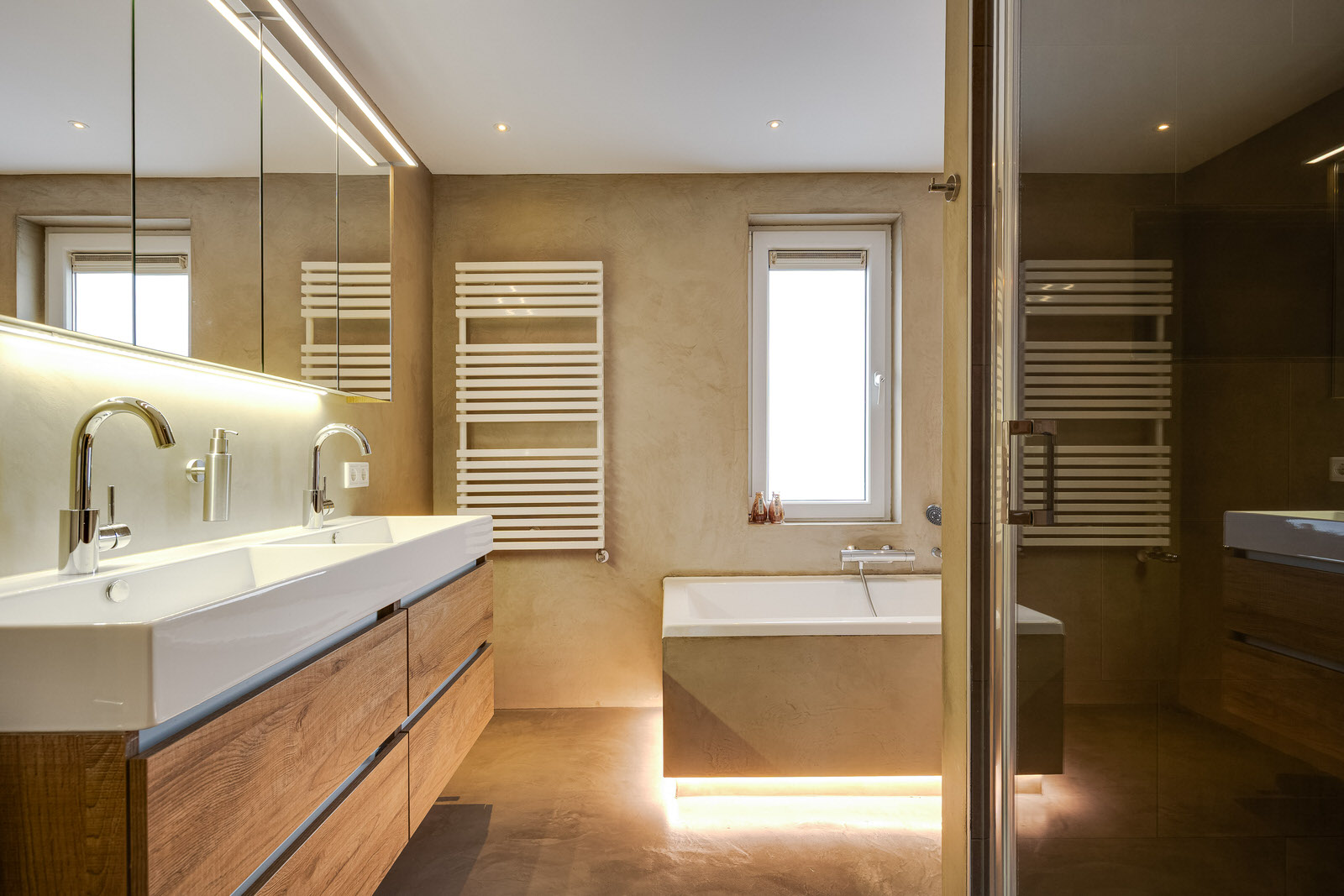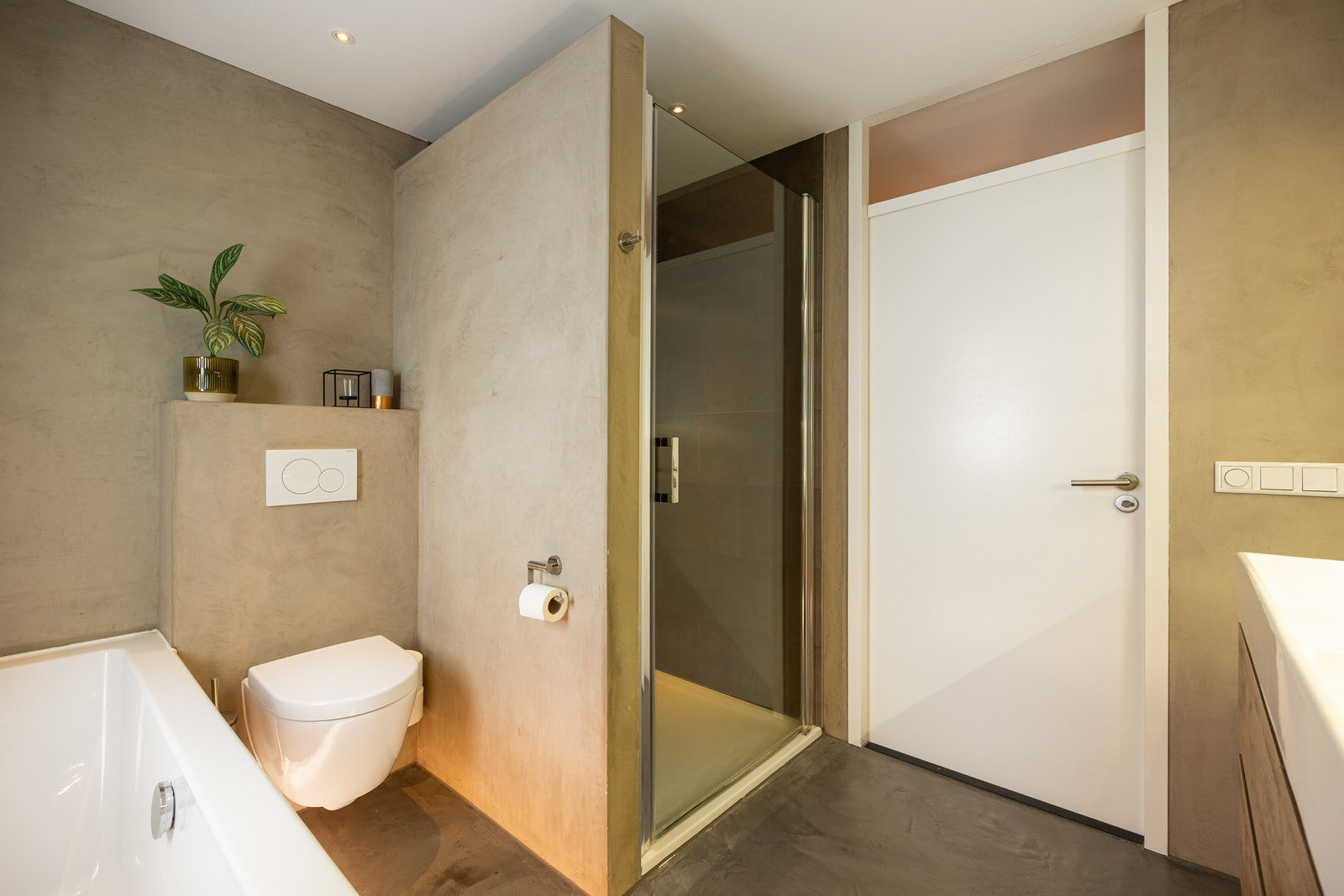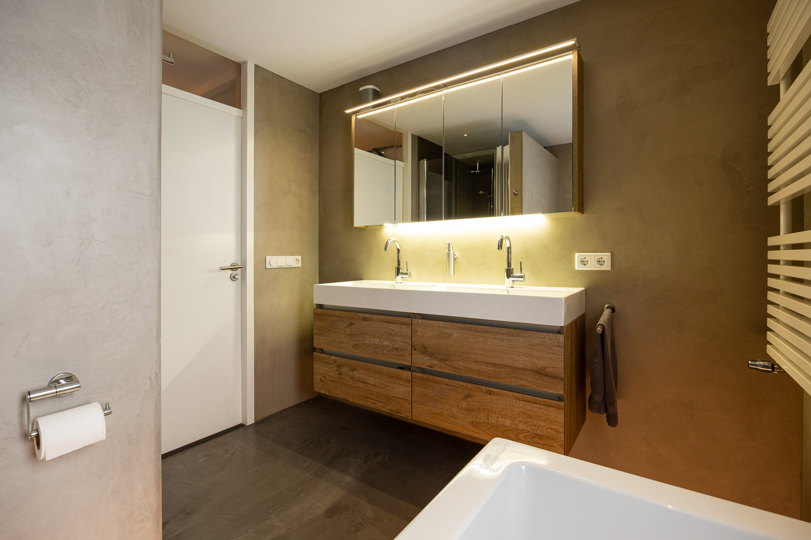 - Badkamervoorzieningen Ligbad, toilet, douche, dubbele wastafel, vloerverwarming
