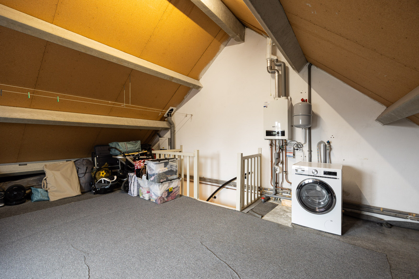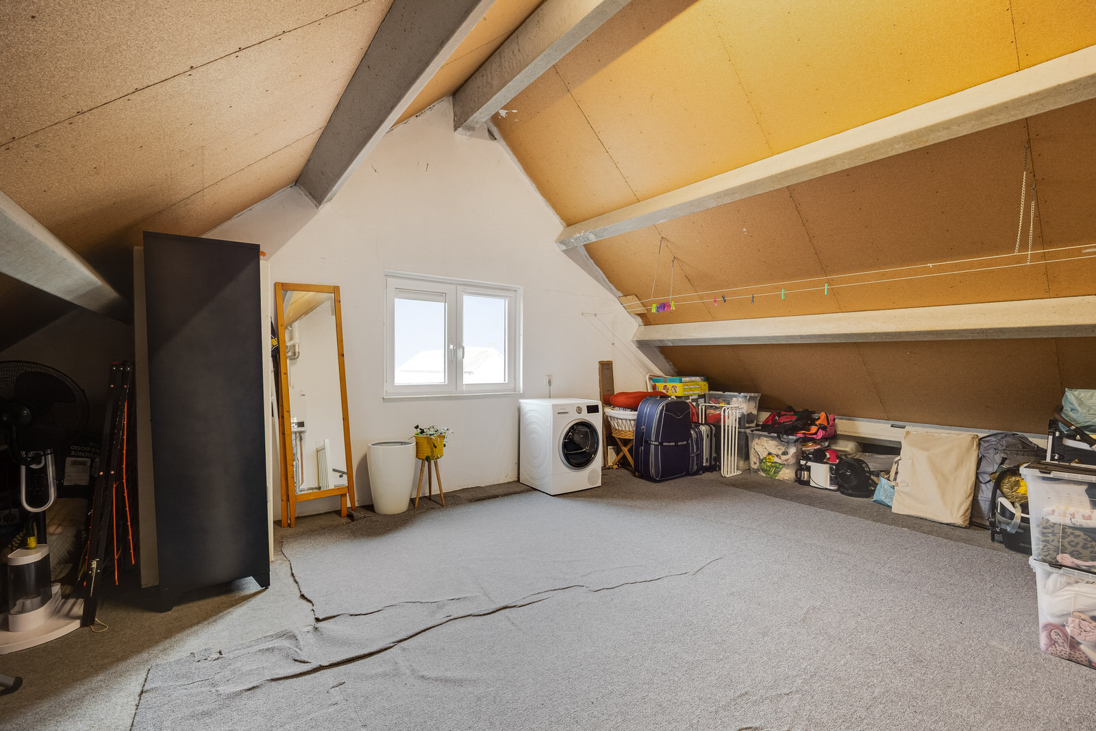 De tweede verdieping is een volwaardige zolderruimte met ramen, een hoge nok en veel bergruimte. Hier bevinden zich de aansluitingen voor de wasapparatuur en de cv-installatie (Nefit Trendline HRC30/CW5, geplaatst in 2015). De ruimte is uitstekend geschikt als extra slaapkamer, werkruimte of berging.