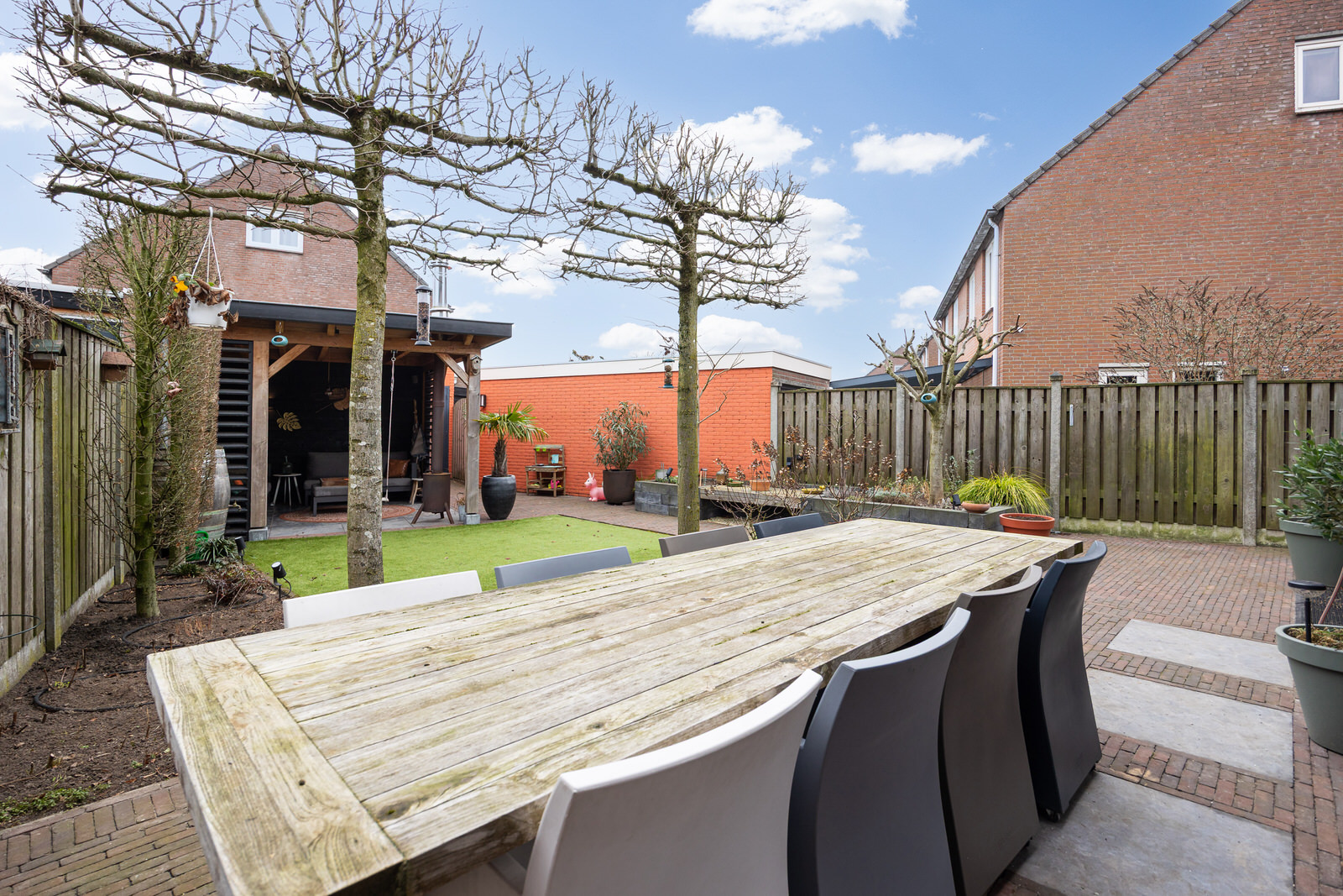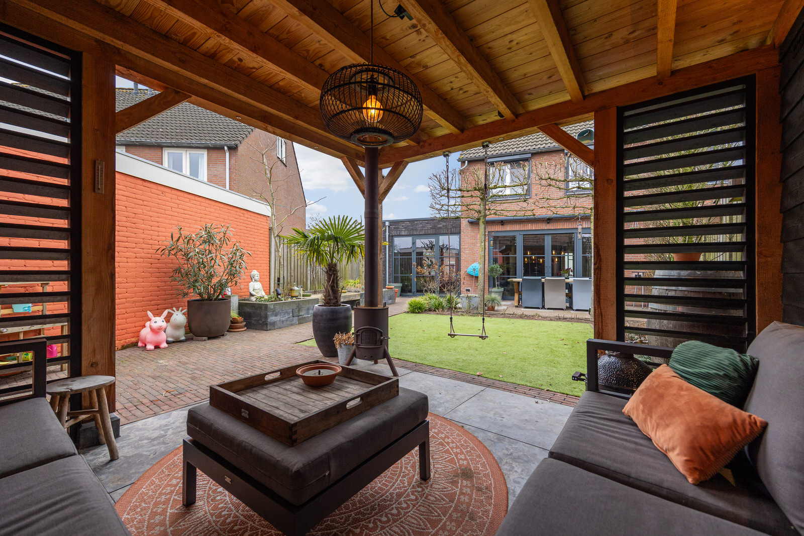 De achtertuin is verzorgd aangelegd en biedt een prettige combinatie van groen en terrassen. De overkapping biedt een beschutte plek om al vroeg in het voorjaar en tot ver in het najaar comfortabel buiten te zitten. Er is voldoende ruimte voor een eettafel, een loungehoek en speelruimte. De tuin biedt goede privacy en sluit prettig aan op de woning. Aan de voorzijde van de woning is parkeergelegenheid op eigen terrein aanwezig, waardoor je de auto comfortabel op eigen grond kunt parkeren.