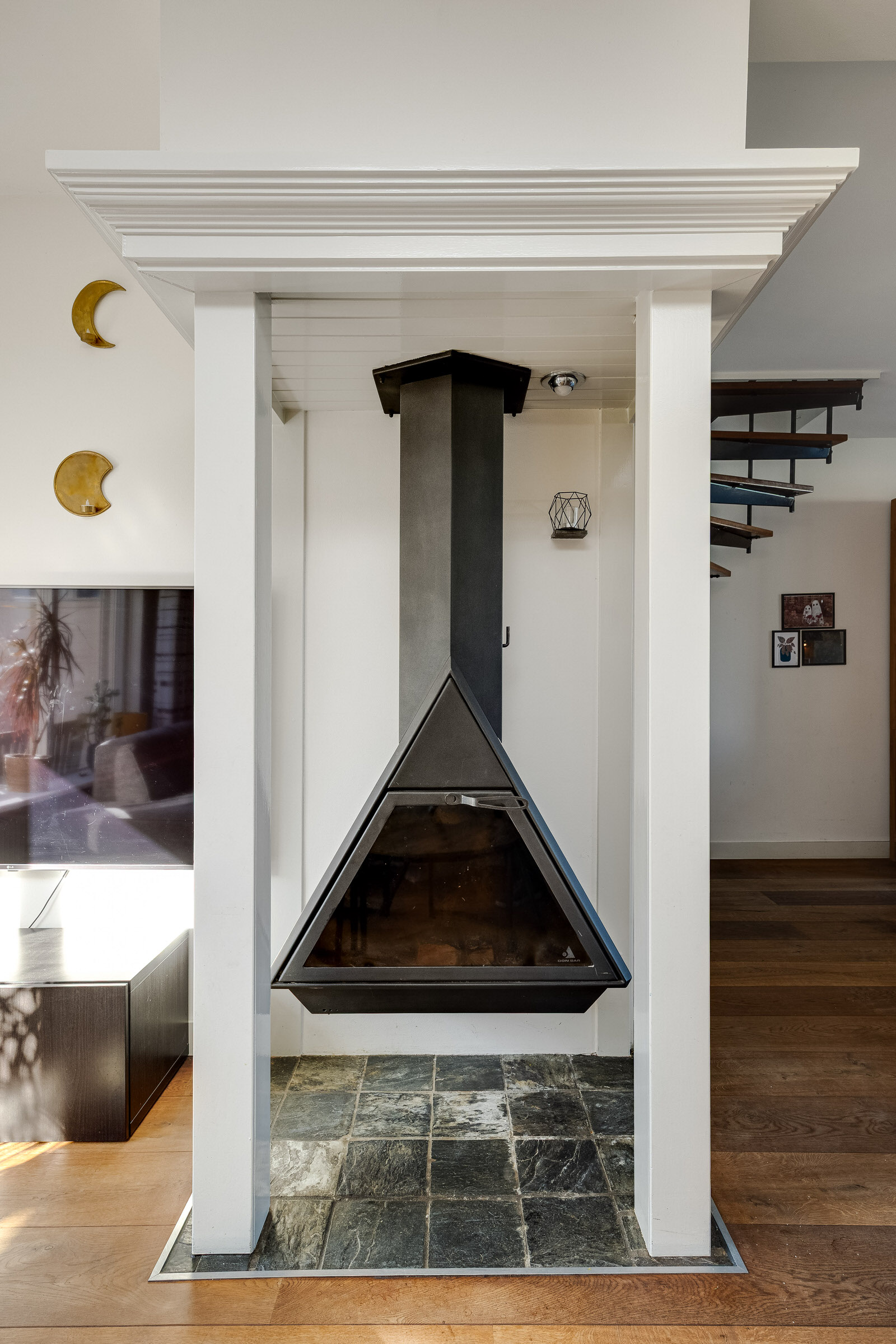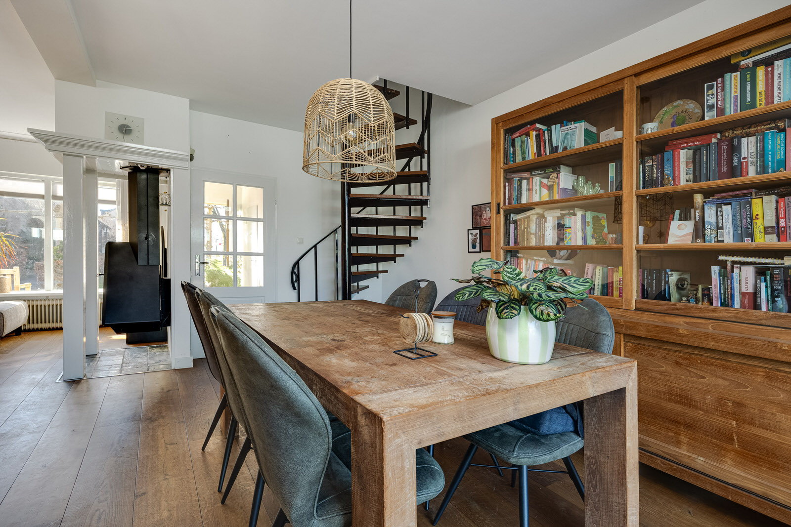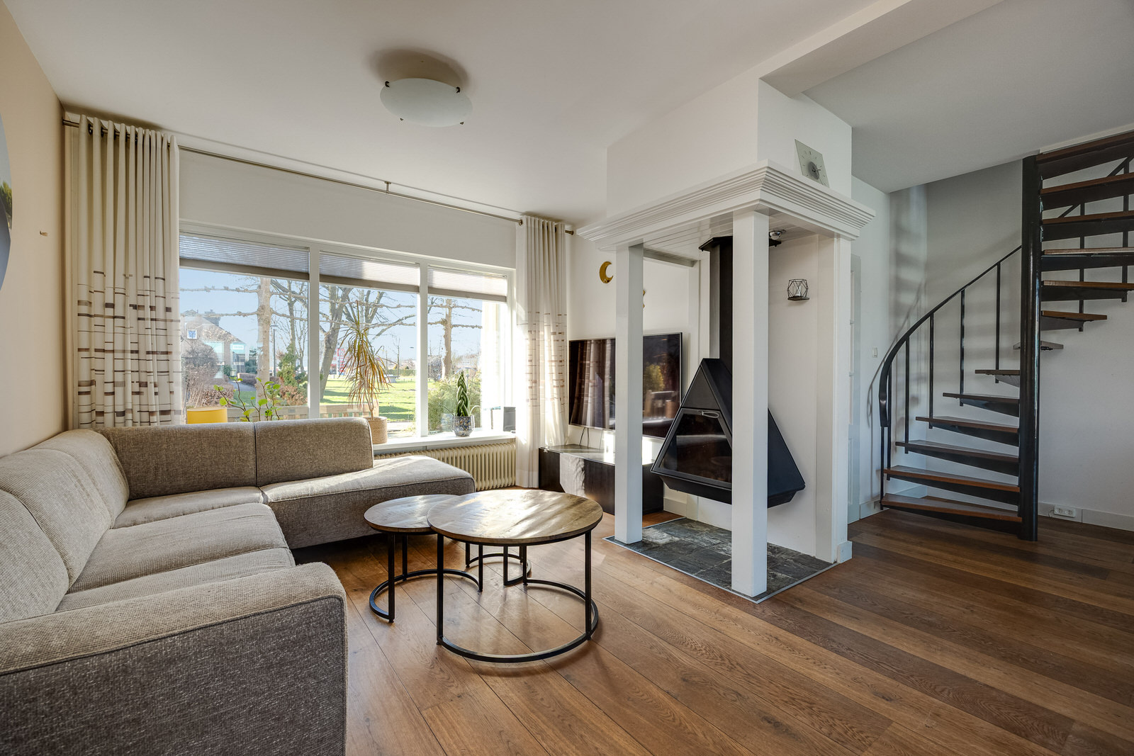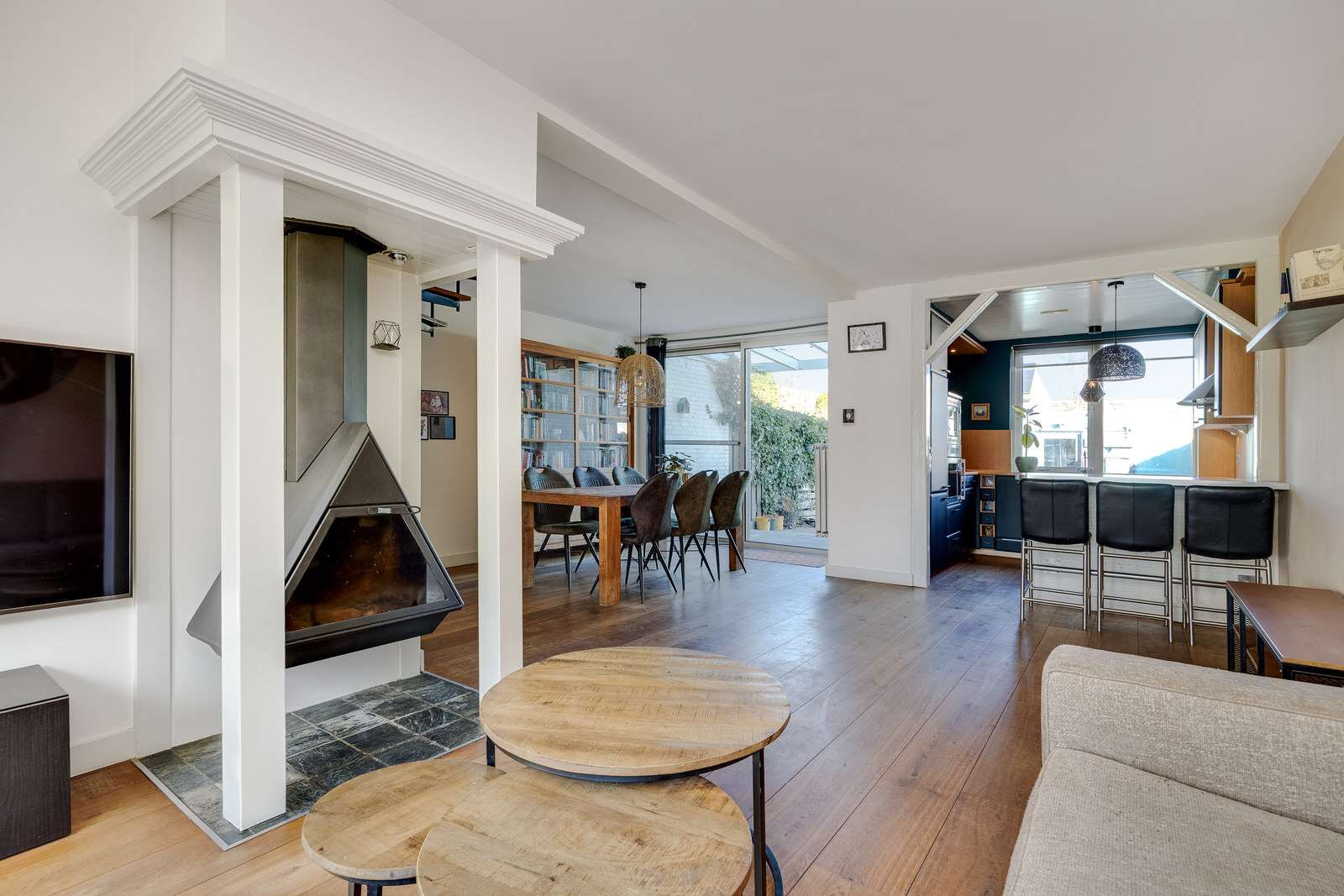 • Lichte woonkamer met houten vloer en houtkachel.