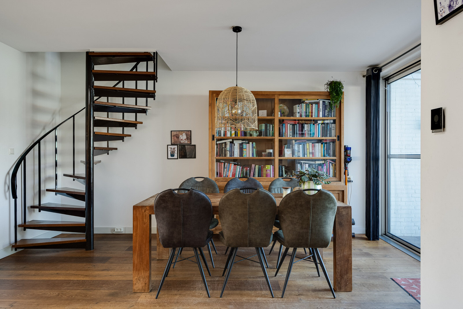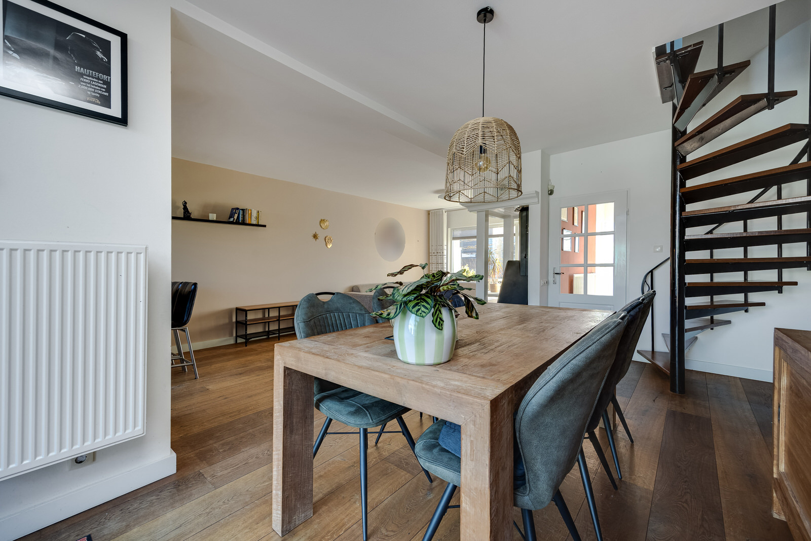 De woonkamer is voorzien van een houten vloer en strak gestucte wanden en plafond. De houtkachel vormt een sfeervol element in de ruimte. Dankzij de open verbinding met de keuken ontstaat een prettige leefruimte met voldoende plaats voor zowel een zithoek als een eettafel. De wenteltrap geeft toegang tot de eerste verdieping. Aan de achterzijde zorgen de grote raampartijen en de schuifpui voor veel lichtinval en direct contact met de tuin.