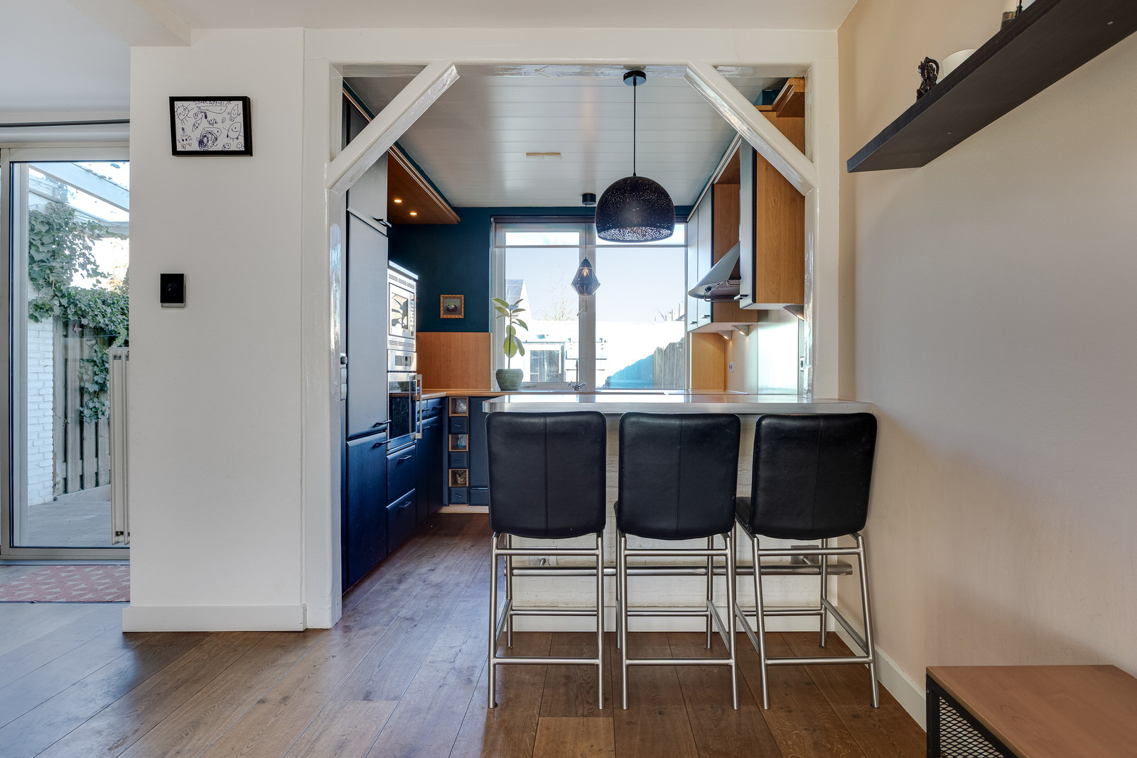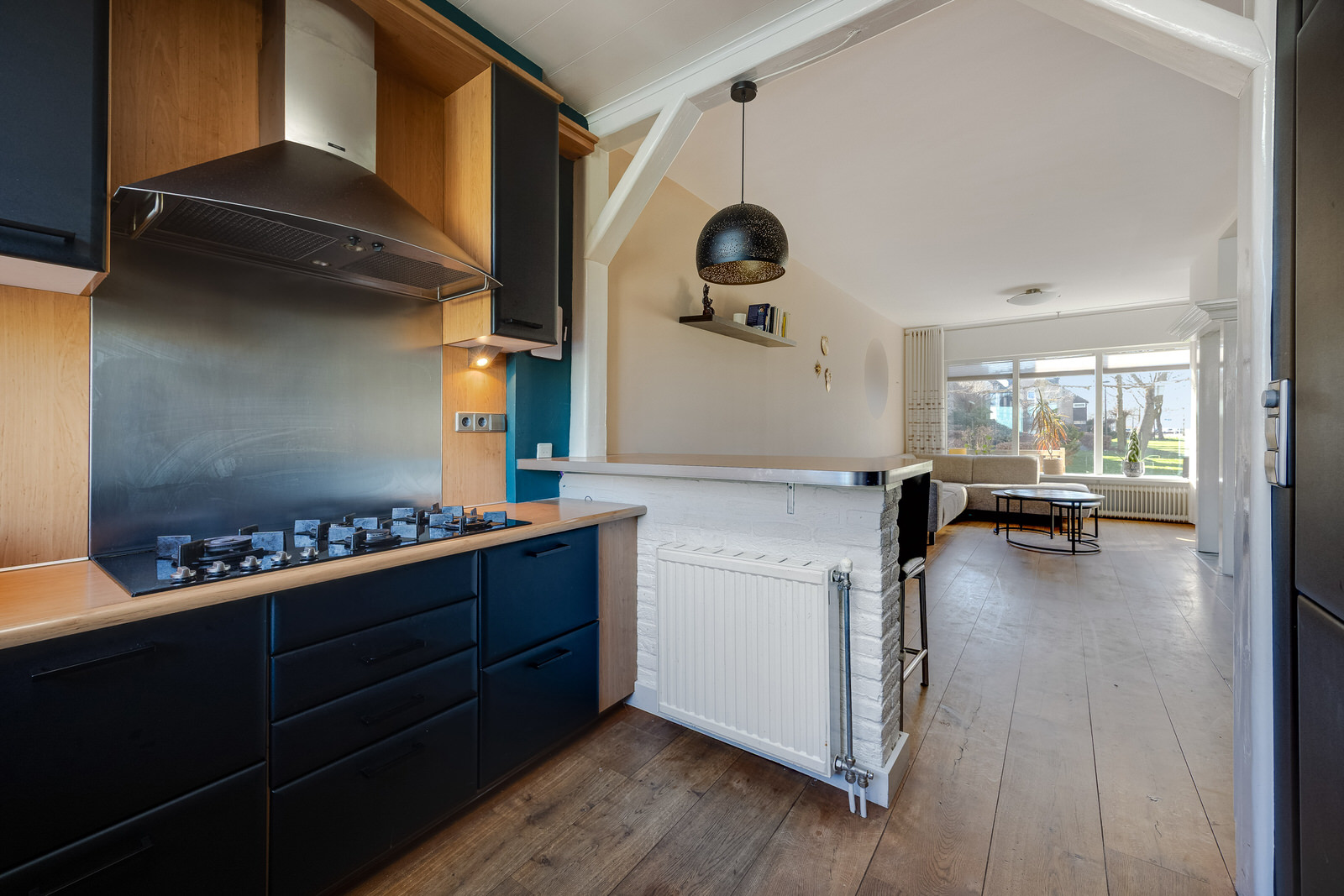 De open keuken is geplaatst in een U-opstelling en beschikt over veel werk- en bergruimte. De keuken is voorzien van een koelkast, vriezer, oven, magnetron, vaatwasser, gaskookplaat en afzuigkap. De bar vormt een natuurlijke verbinding tussen keuken en eetruimte en is een fijne plek voor een snelle koffie in de ochtend of om aan te schuiven tijdens het koken. Vanuit de keuken is er zicht op de achtertuin, wat zorgt voor een open en betrokken gevoel met buiten.