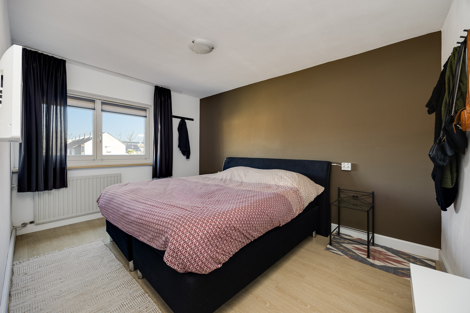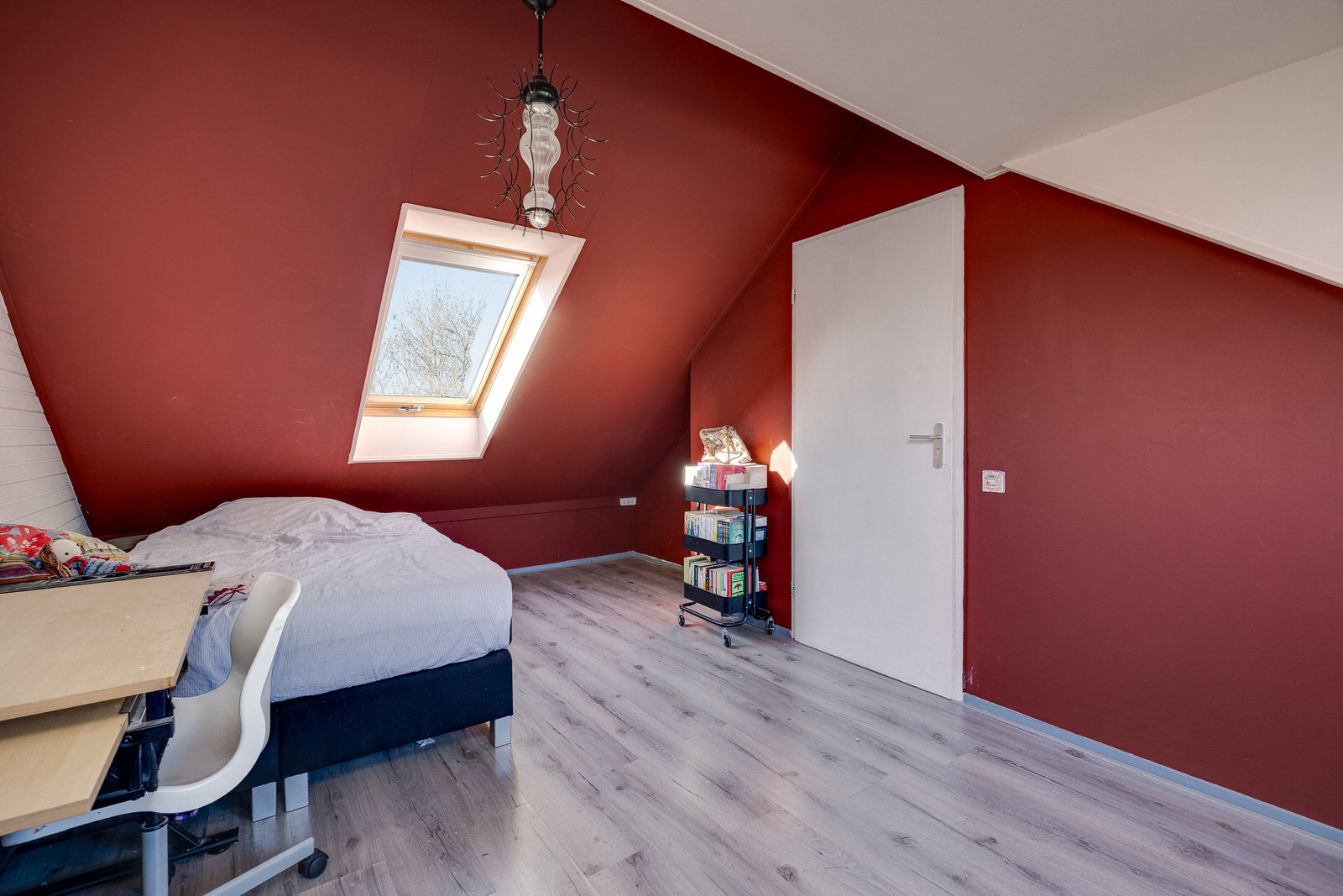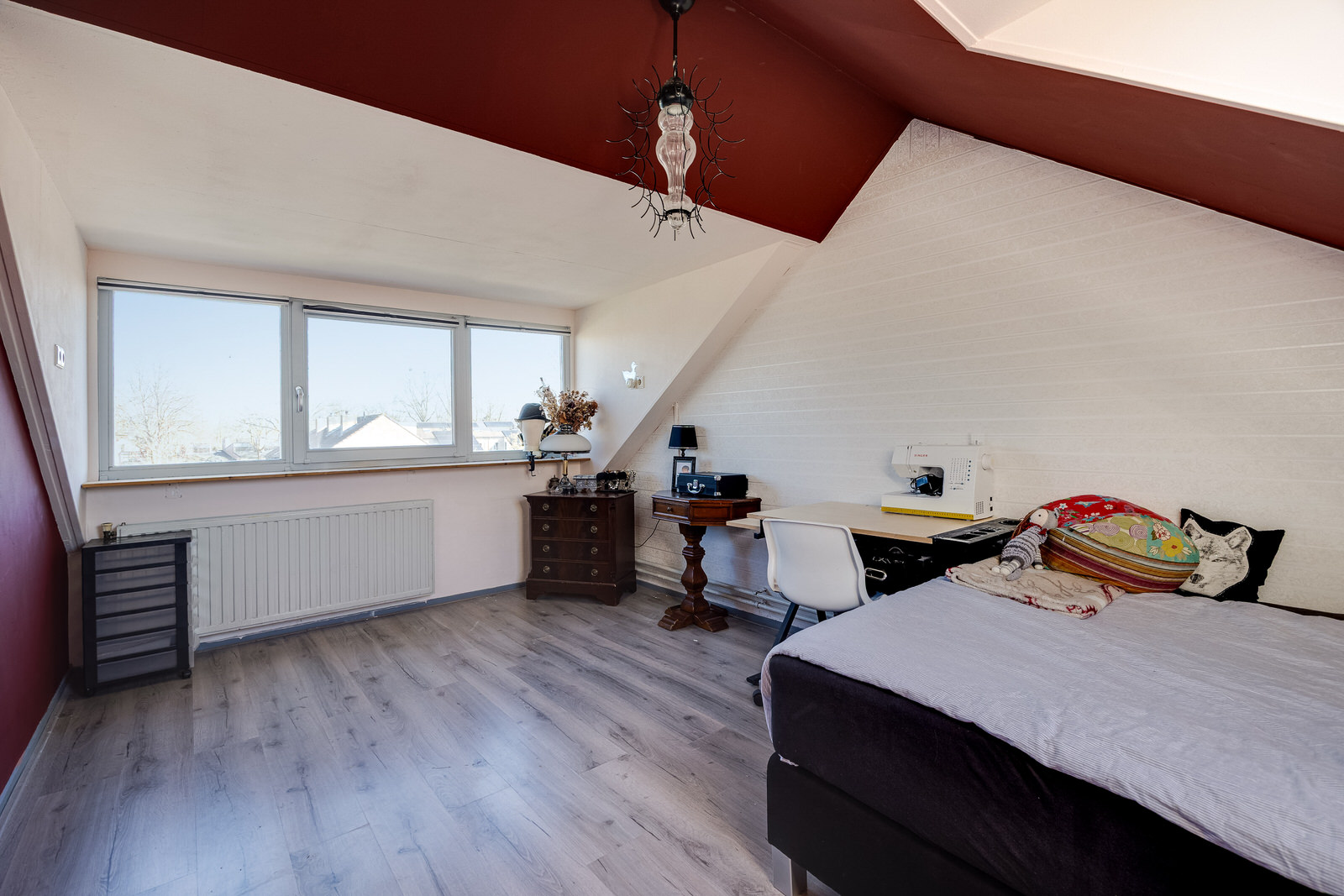 De vierde slaapkamer is een volwaardige ruimte met een grote dakkapel en extra dakraam. Hierdoor ontstaat een lichte kamer met prettig uitzicht over de omgeving. De schuine kap geeft de ruimte karakter, terwijl de afmetingen voldoende plaats bieden voor een tweepersoonsbed, bureau of kastenwand. Een kamer die zich uitstekend leent als ouderslaapkamer, tienerkamer of rustige werkplek.