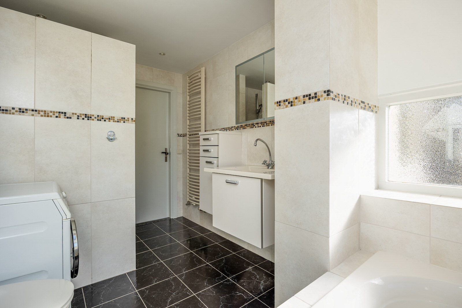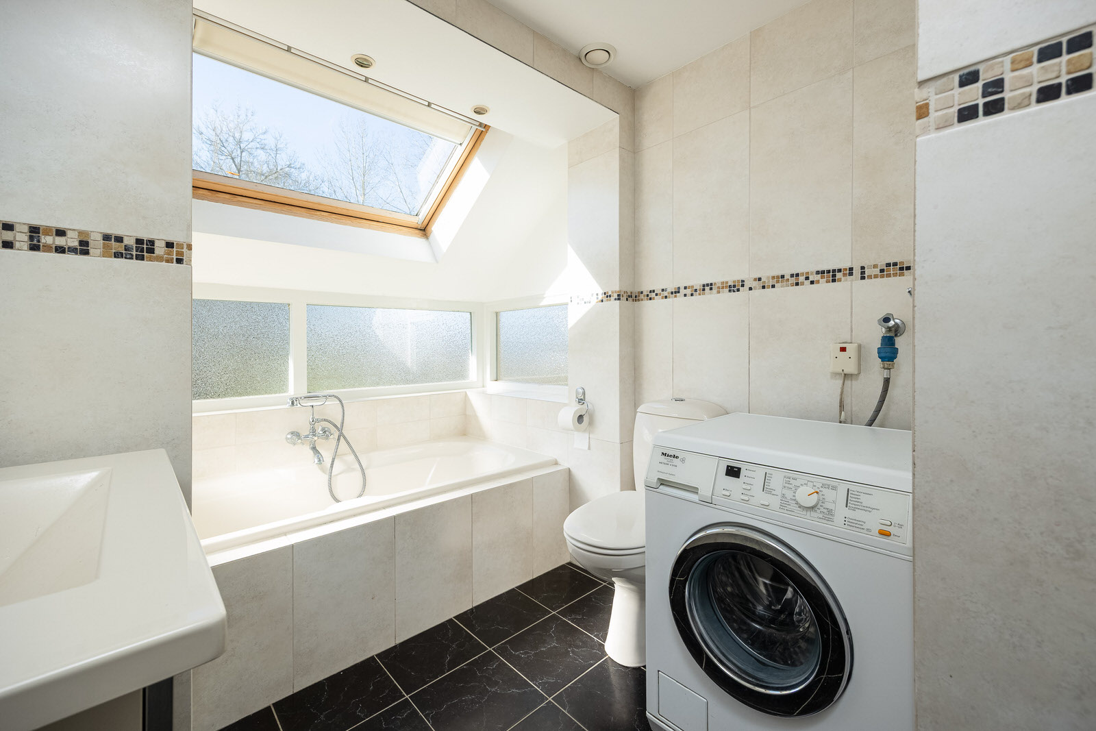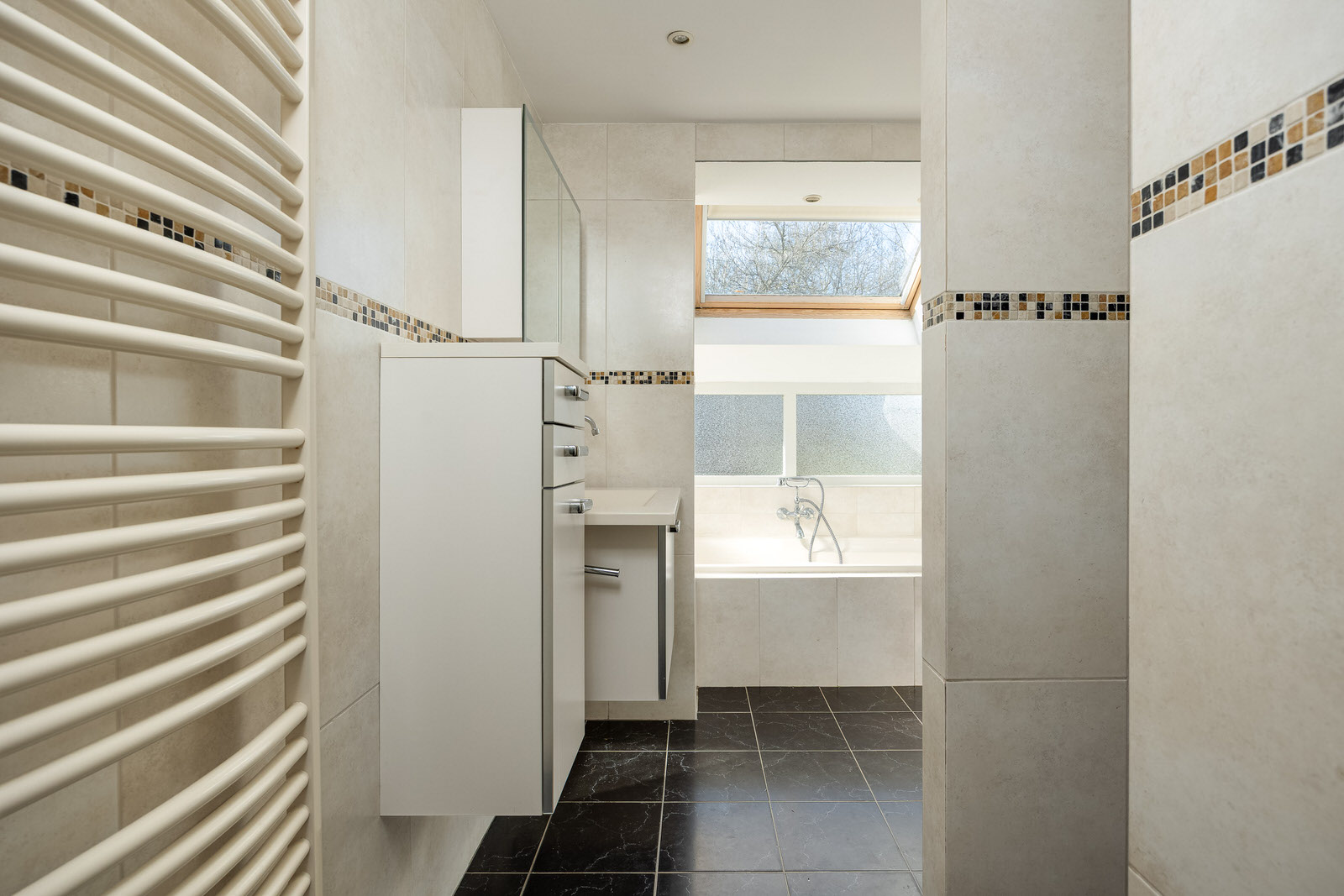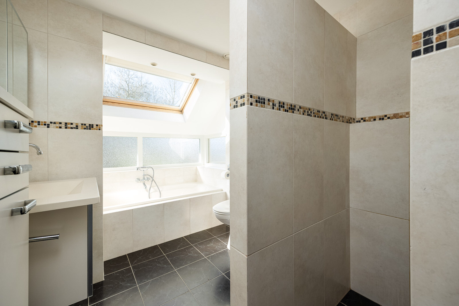 De volledig betegelde badkamer is compleet uitgevoerd met een ligbad, inloopdouche met thermostatische kraan, staand toilet, designradiator en wastafel met meubel. De ramen en het dakraam zorgen voor natuurlijke lichtinval en ventilatie. Tevens bevindt zich hier de aansluiting voor de wasmachine.