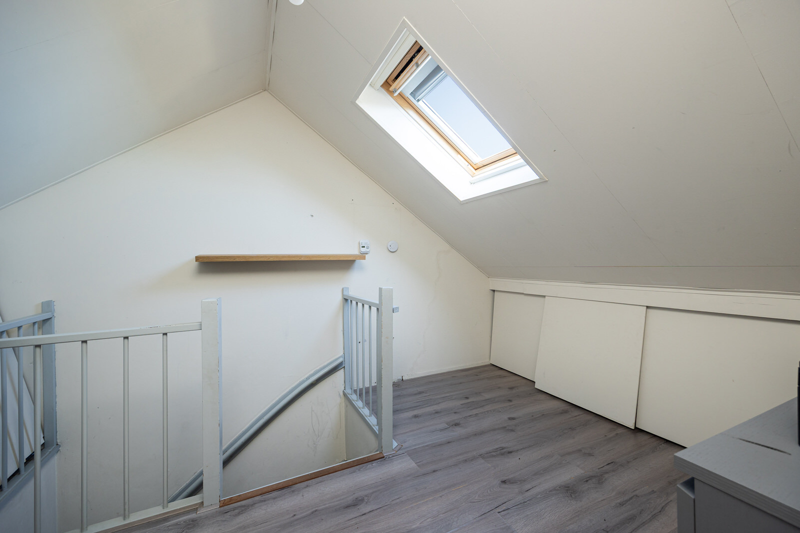 De tweede verdieping is bereikbaar via een vaste trap. Op de overloop ligt laminaat en is een houten dakraam met dubbel glas aanwezig. Achter de knieschotten bevindt zich extra bergruimte. Hier is tevens de Nefit Topline cv-ketel uit 2012 geplaatst.
