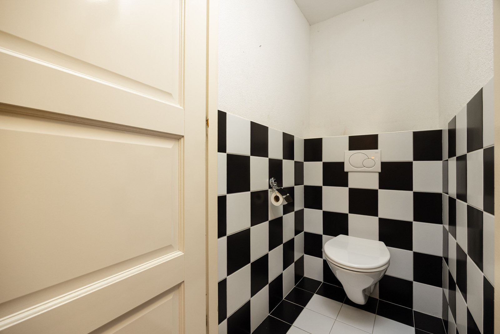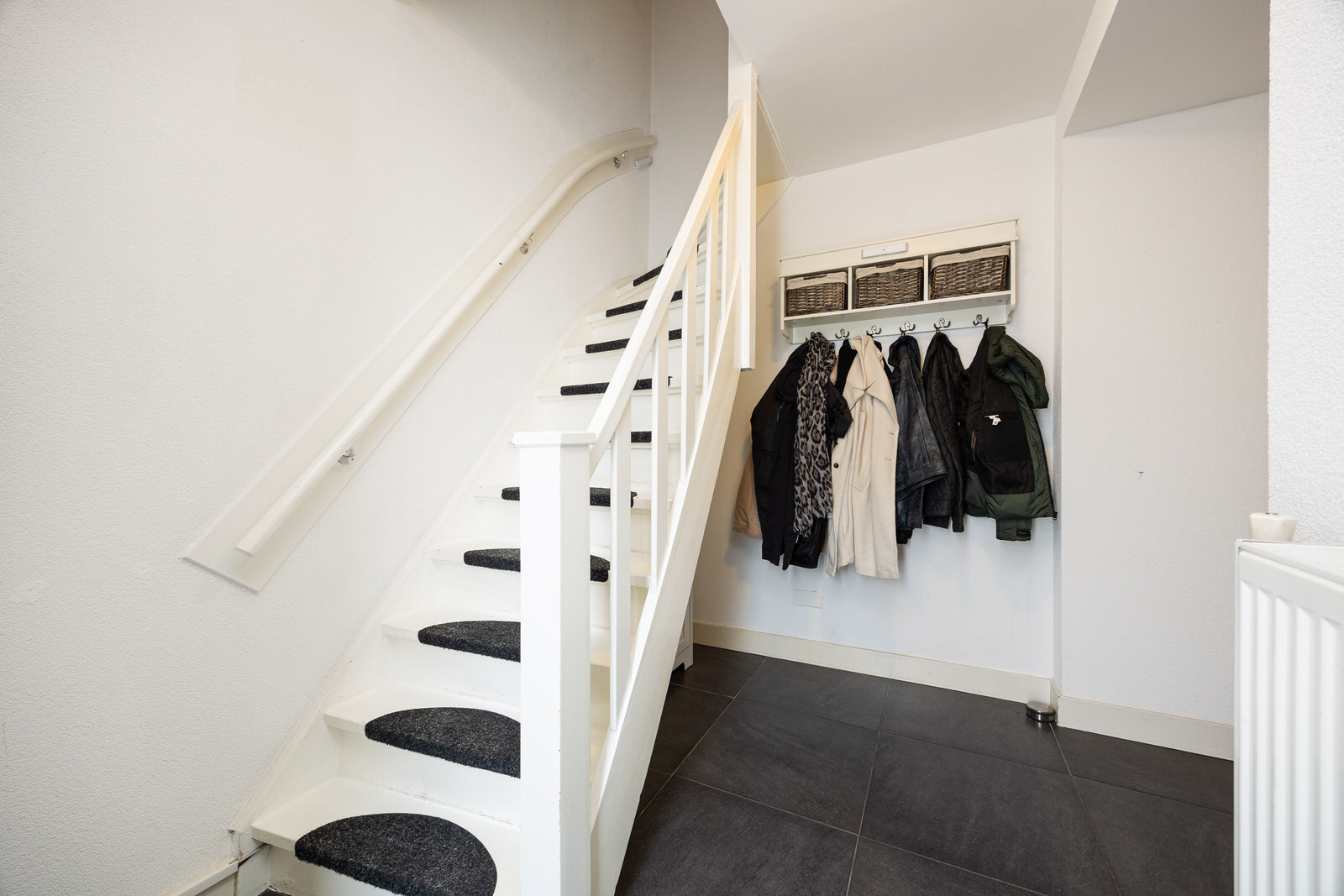 Via de onderhoudsvriendelijke voortuin en eigen oprit kom je binnen in de ruime hal. Hier bevinden zich de trapopgang, de meterkast en een toiletruimte met wandcloset en fonteintje. De afwerking is verzorgd en neutraal.