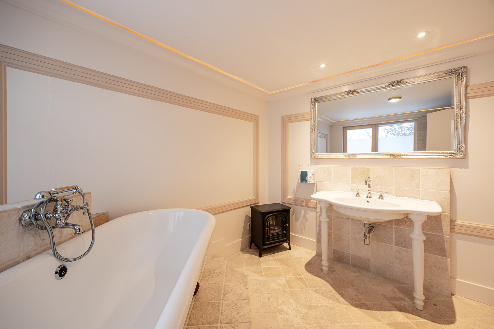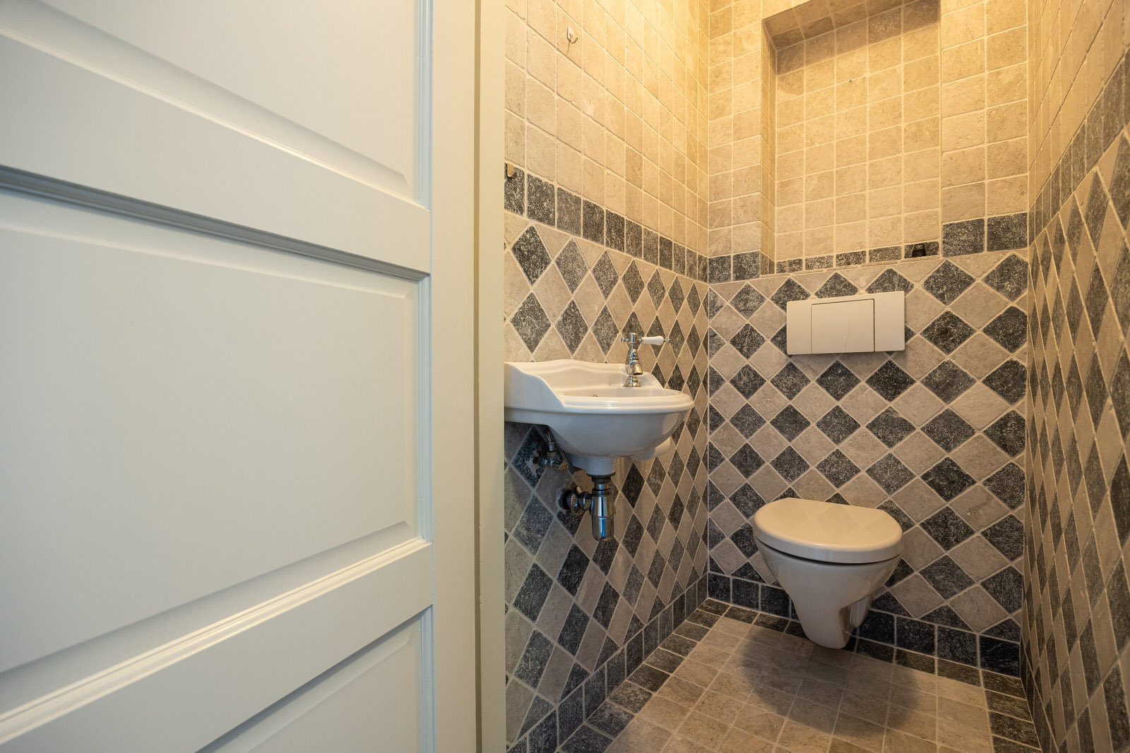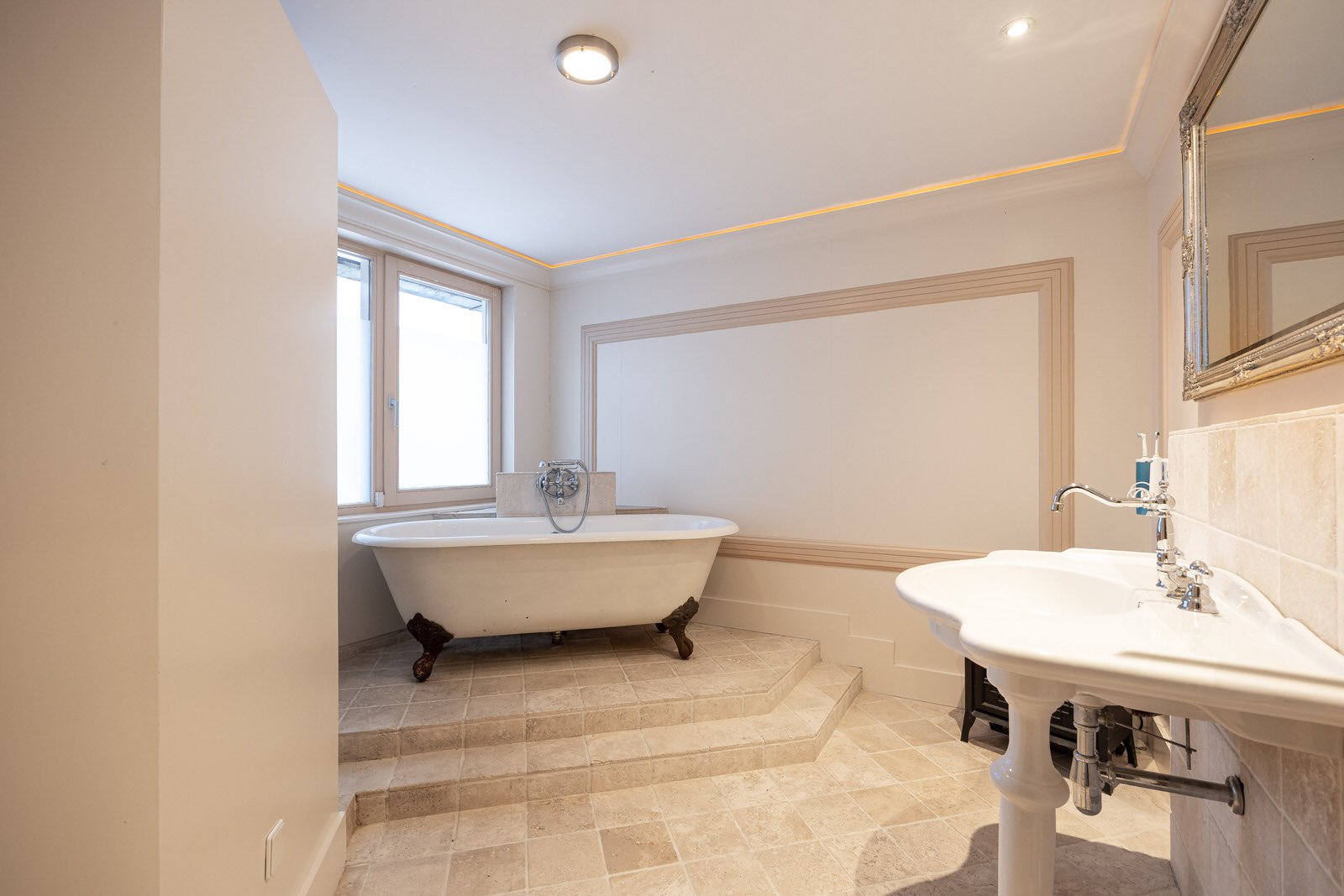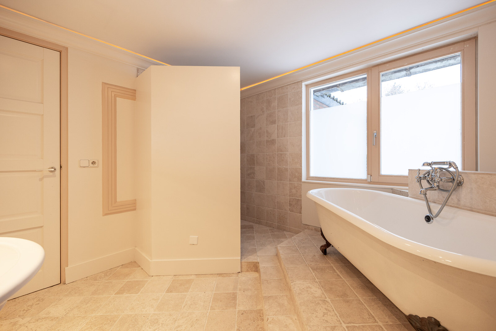De badkamer is compleet uitgevoerd met ligbad, inloopdouche en brede wastafel. Daarnaast is er een separaat toilet op de overloop.