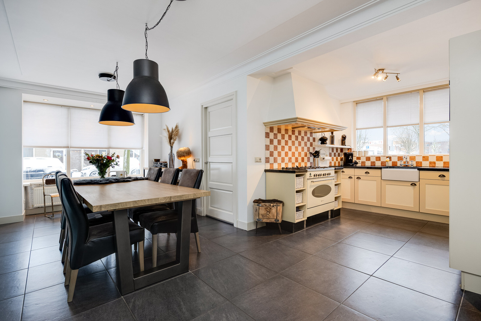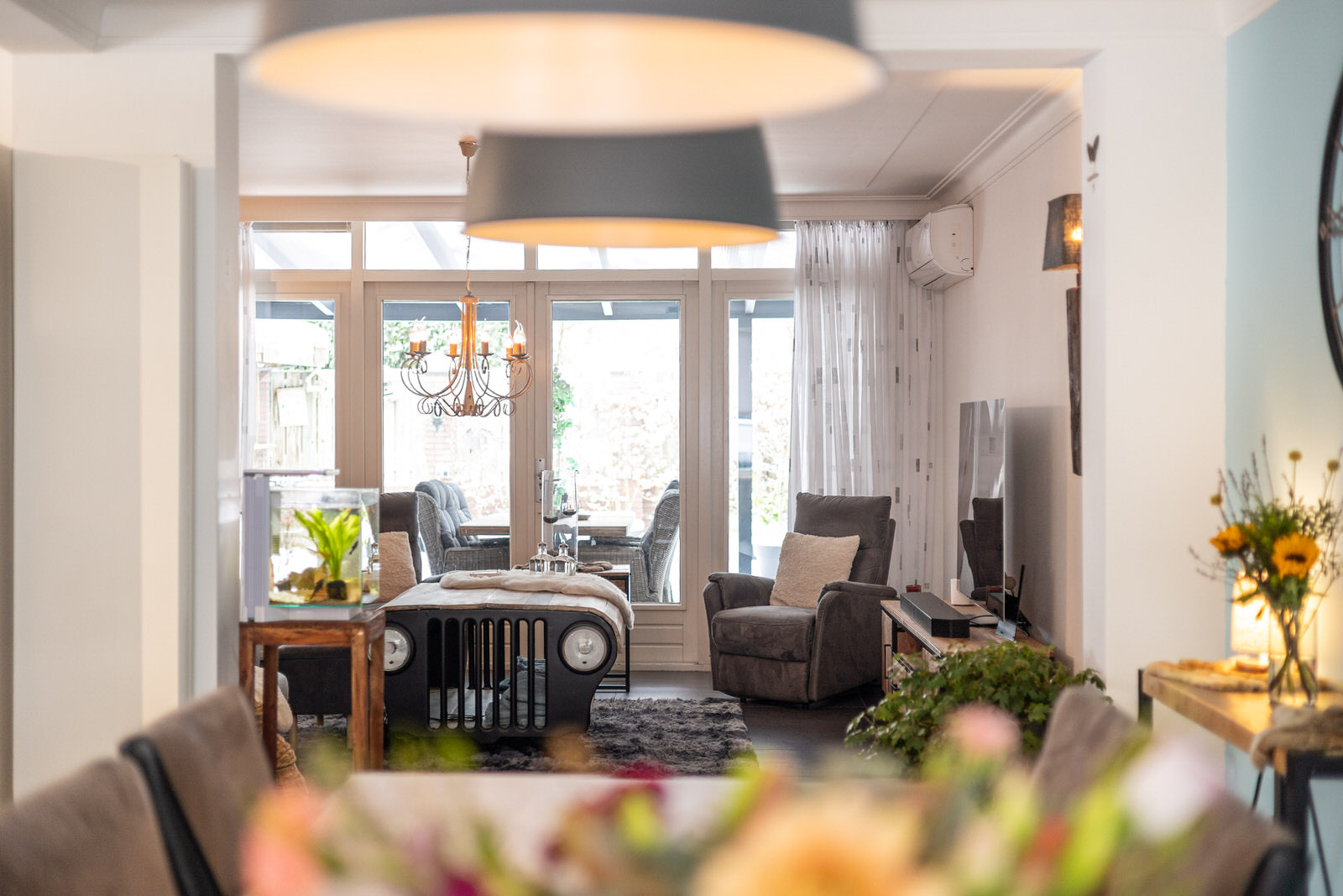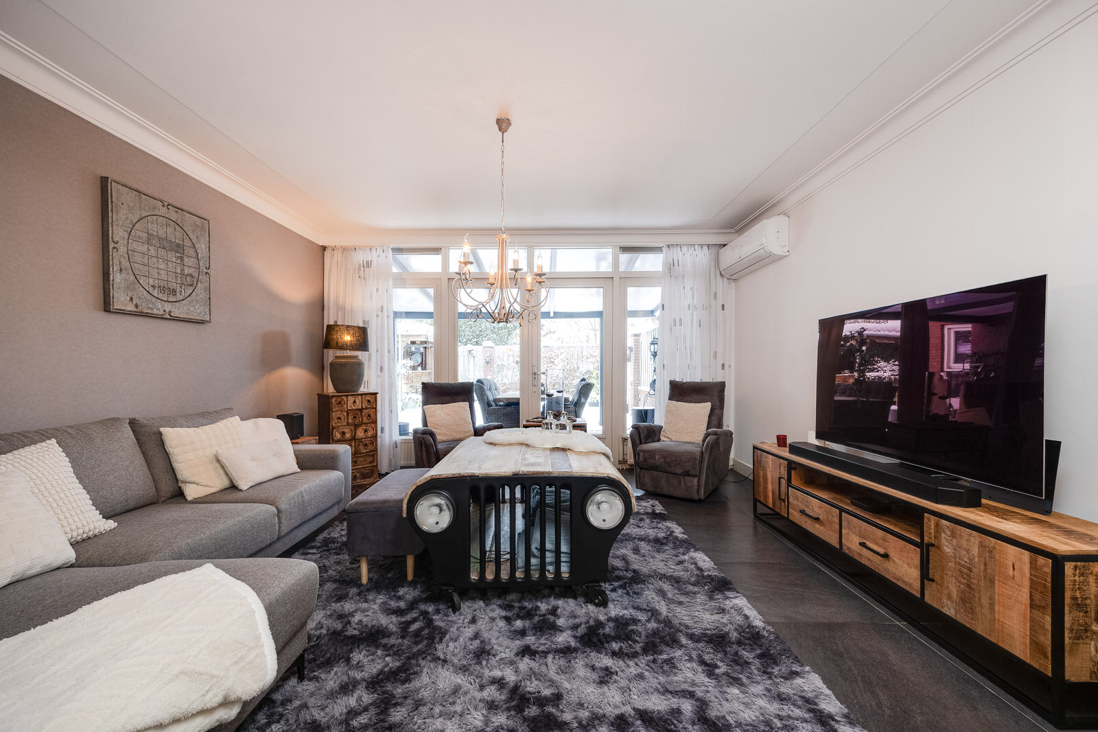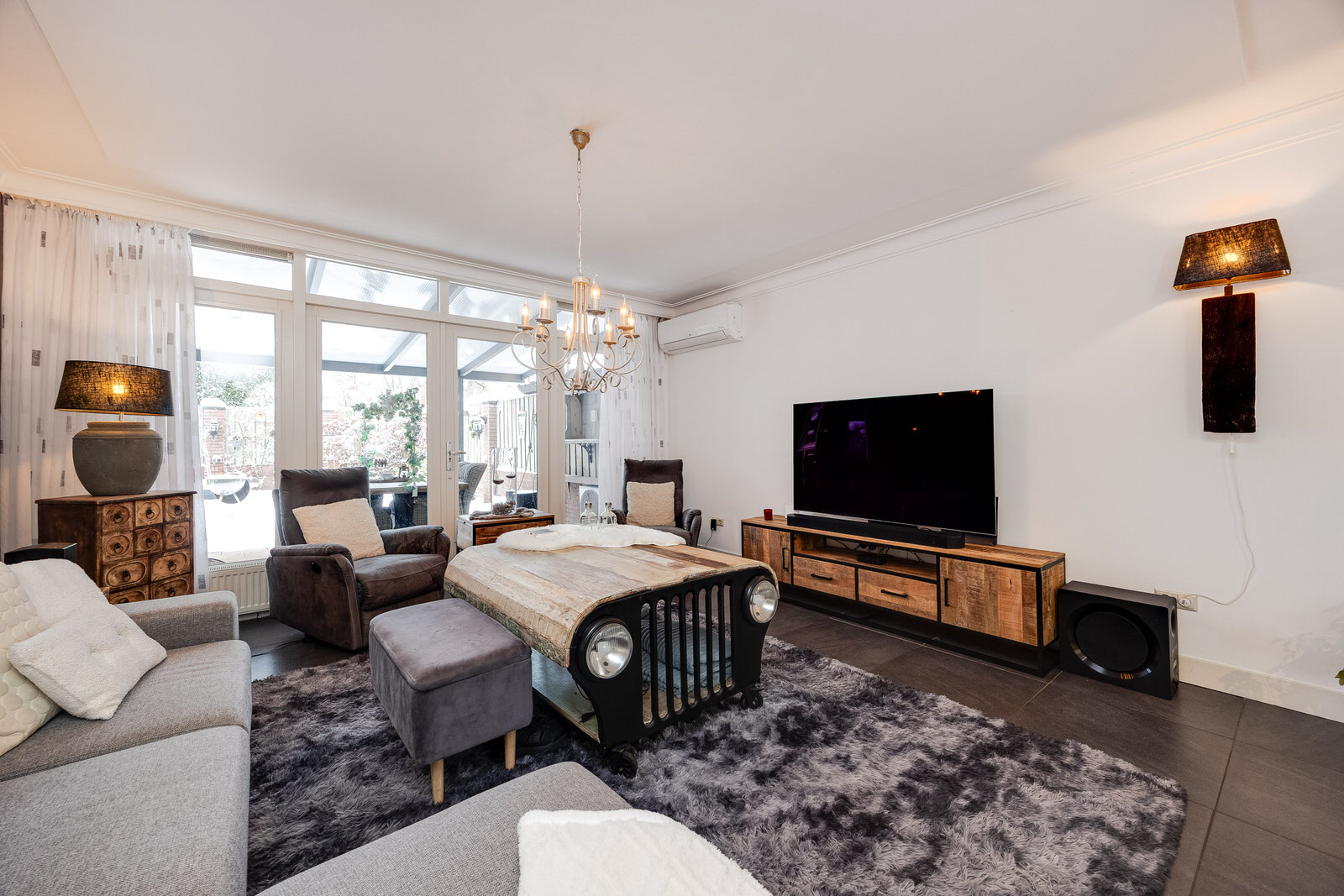 De woonkamer is ruim opgezet en profiteert aan de voorzijde van een erker, wat zorgt voor extra licht en een prettige uitstraling. Aan de achterzijde is de woning uitgebouwd, waardoor hier een royale zithoek is ontstaan met directe verbinding naar de tuin via openslaande deuren. Tevens bevindt zich hier een airconditioning om het gehele jaar de woonruimte de gewenste temperatuur te geven. Grote raampartijen zorgen voor veel daglicht en de openslaande deuren voor een directe verbinding met buiten.