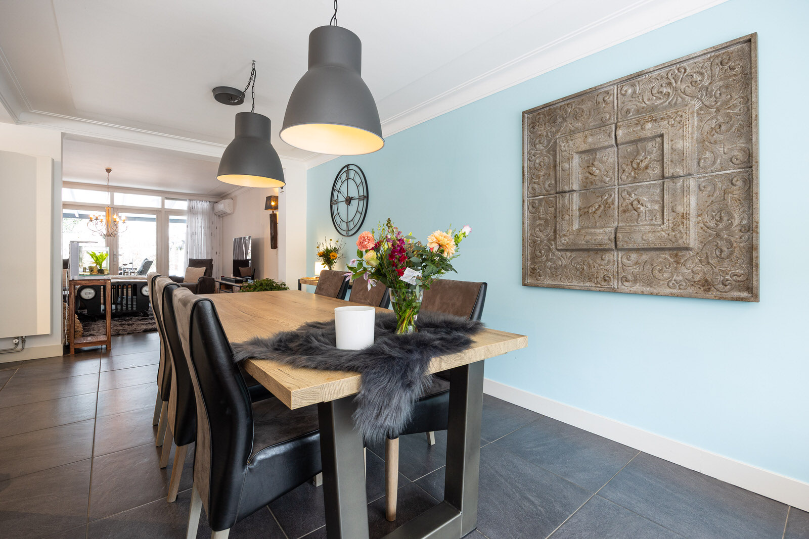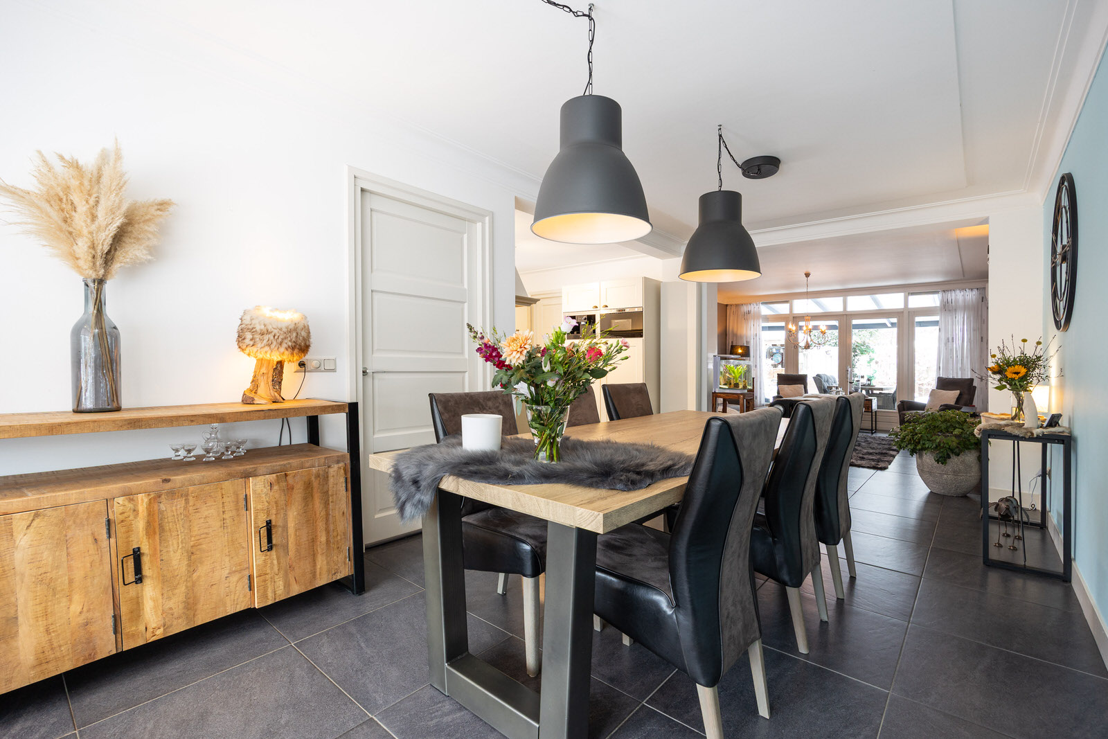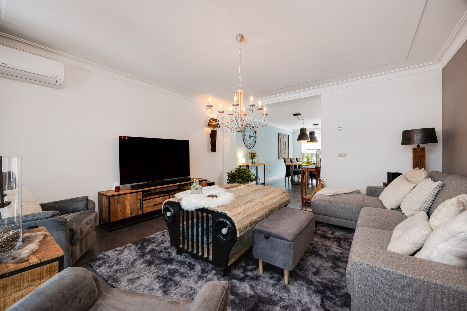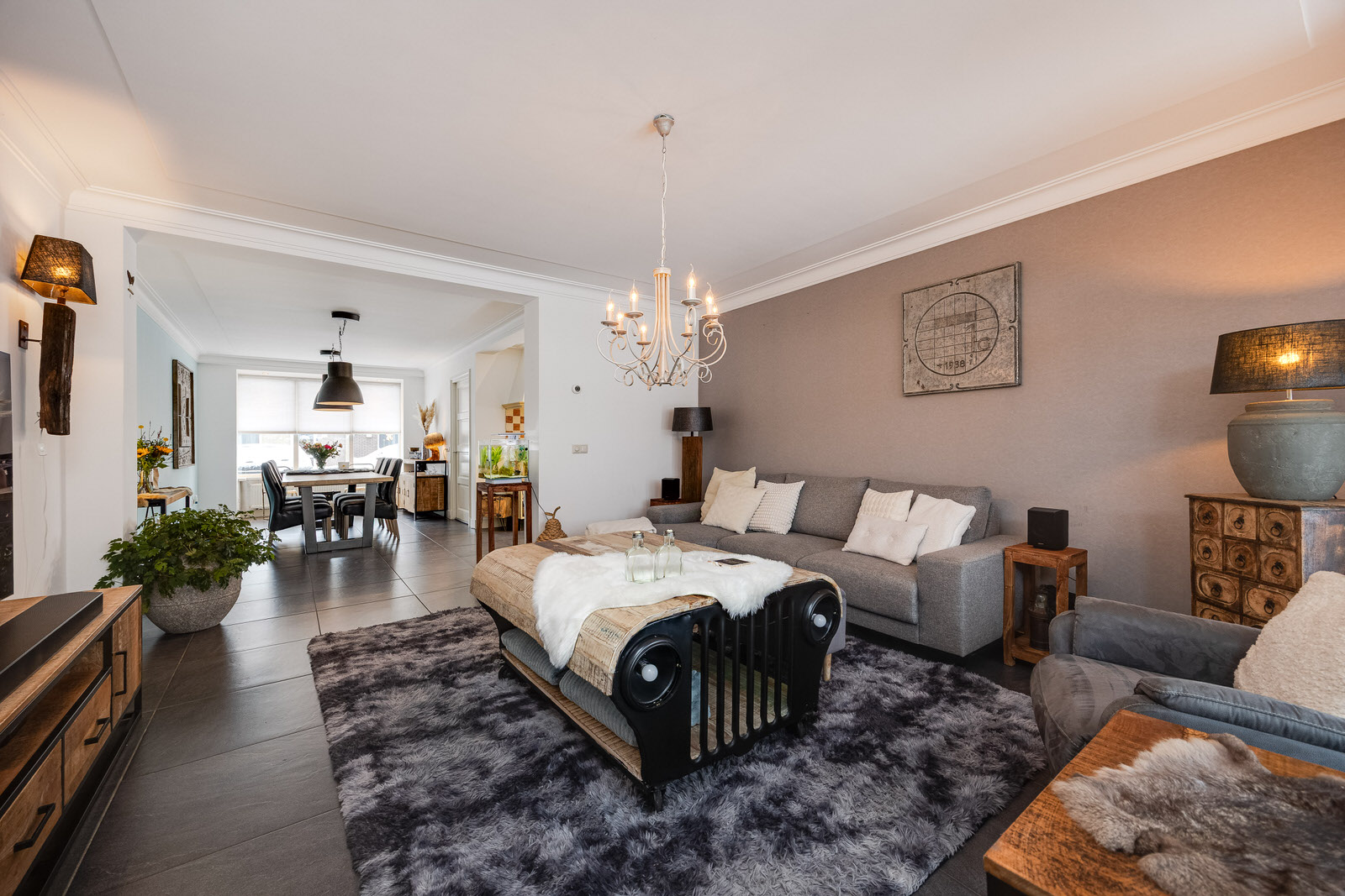 De woonkamer is ruim opgezet en profiteert aan de voorzijde van een erker, wat zorgt voor extra licht en een prettige uitstraling. Aan de achterzijde is de woning uitgebouwd, waardoor hier een royale zithoek is ontstaan met directe verbinding naar de tuin via openslaande deuren. Tevens bevindt zich hier een airconditioning om het gehele jaar de woonruimte de gewenste temperatuur te geven. Grote raampartijen zorgen voor veel daglicht en de openslaande deuren voor een directe verbinding met buiten.