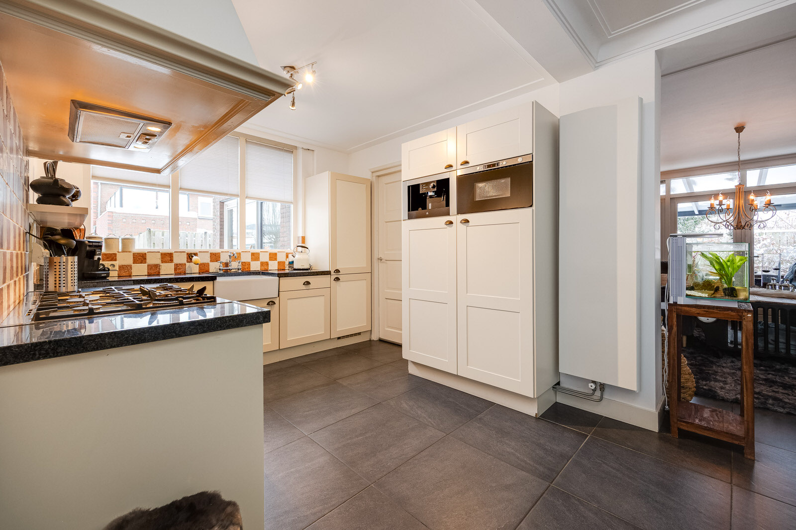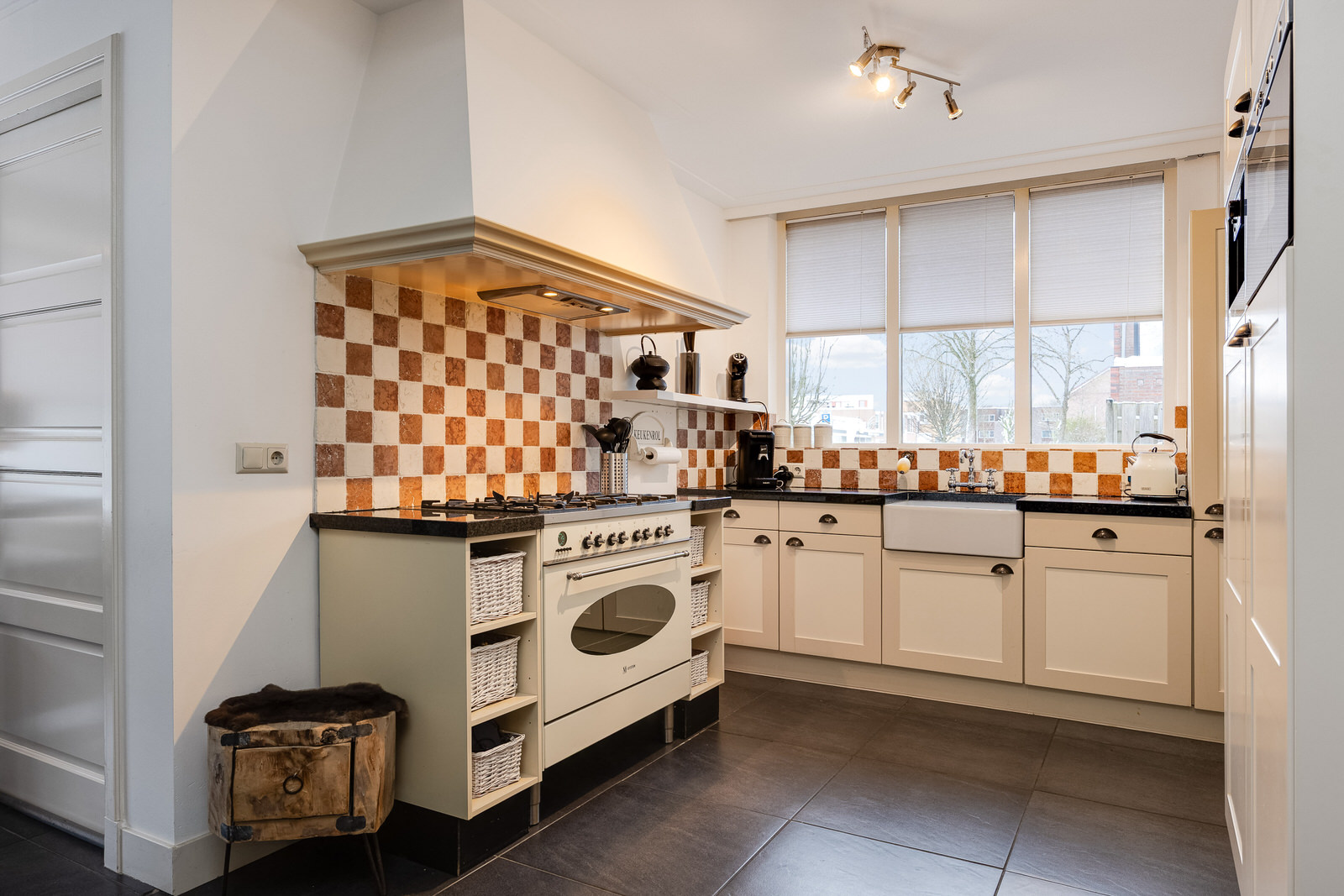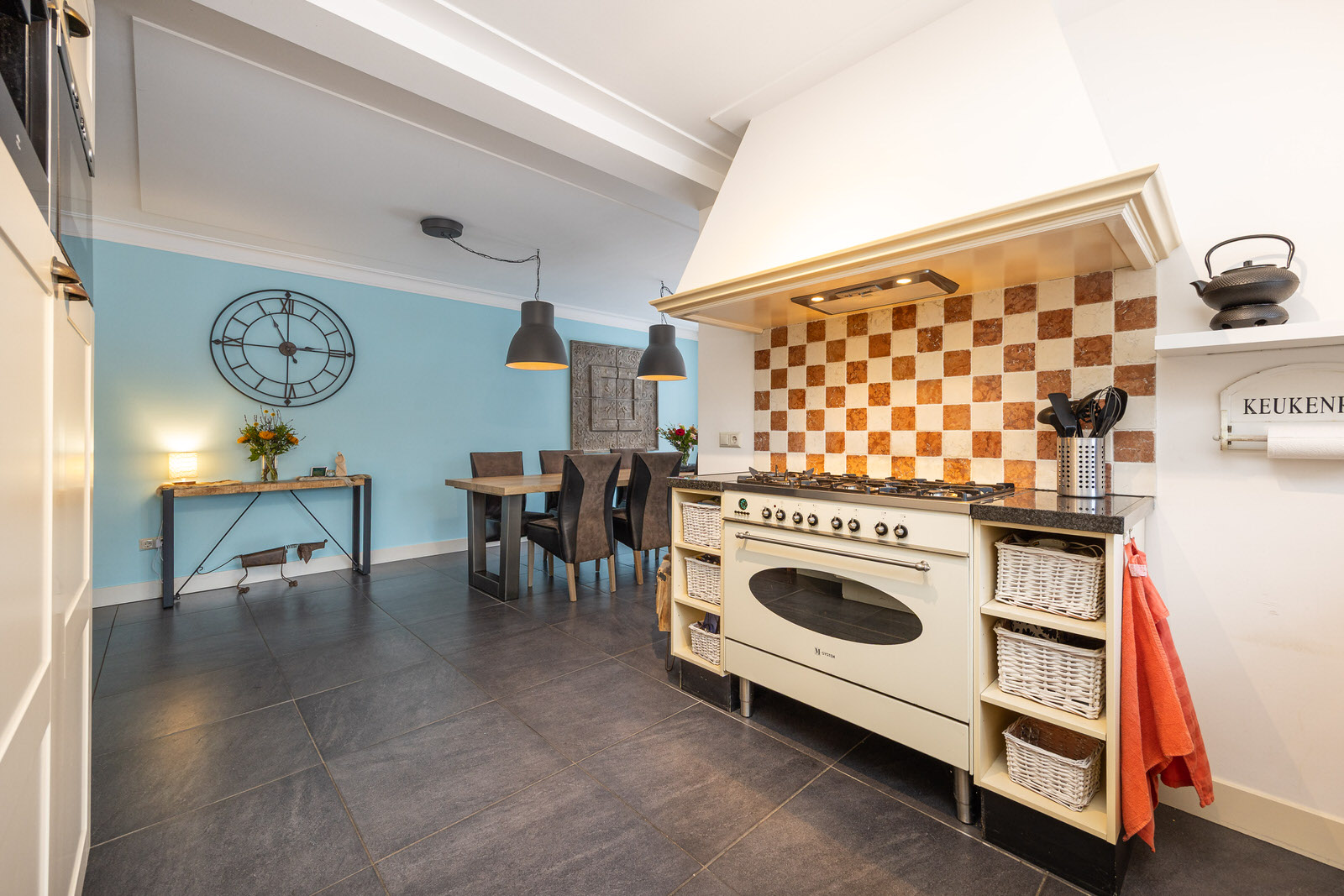 De sfeervolle keuken staat in open verbinding met het eetgedeelte en is praktisch ingericht met veel werk- en kastruimte. De opstelling biedt plaats aan diverse inbouwapparatuur, te weten een 6-pits gasfornuis met wokbrander, oven, afzuigkap, koelkast en vaatwasmachine. Daarnaast is er een koffiezetmachine en magnetron. De keuken ligt centraal op de begane grond, beschikt over daglicht via een raam in de zijgevel en heeft een directe verbinding met zowel het eetgedeelte als de bijkeuken.