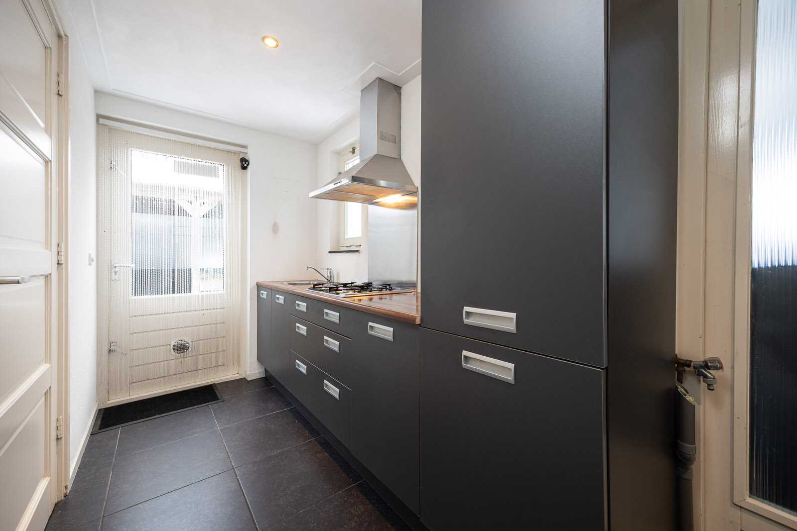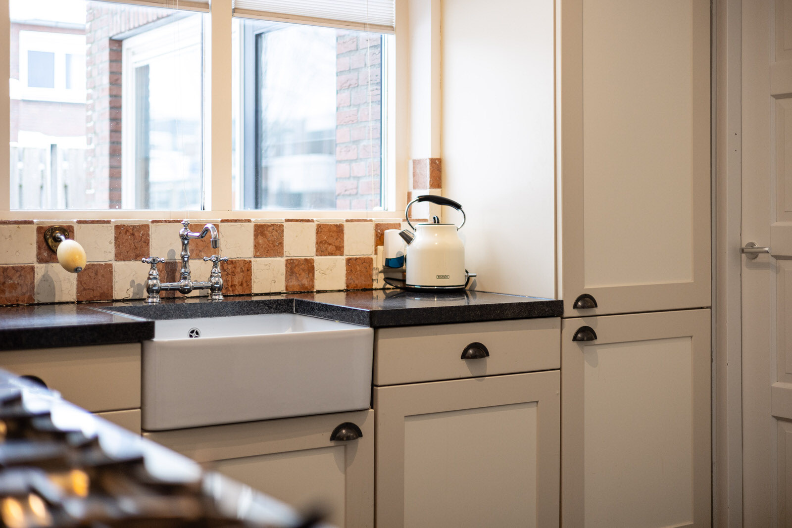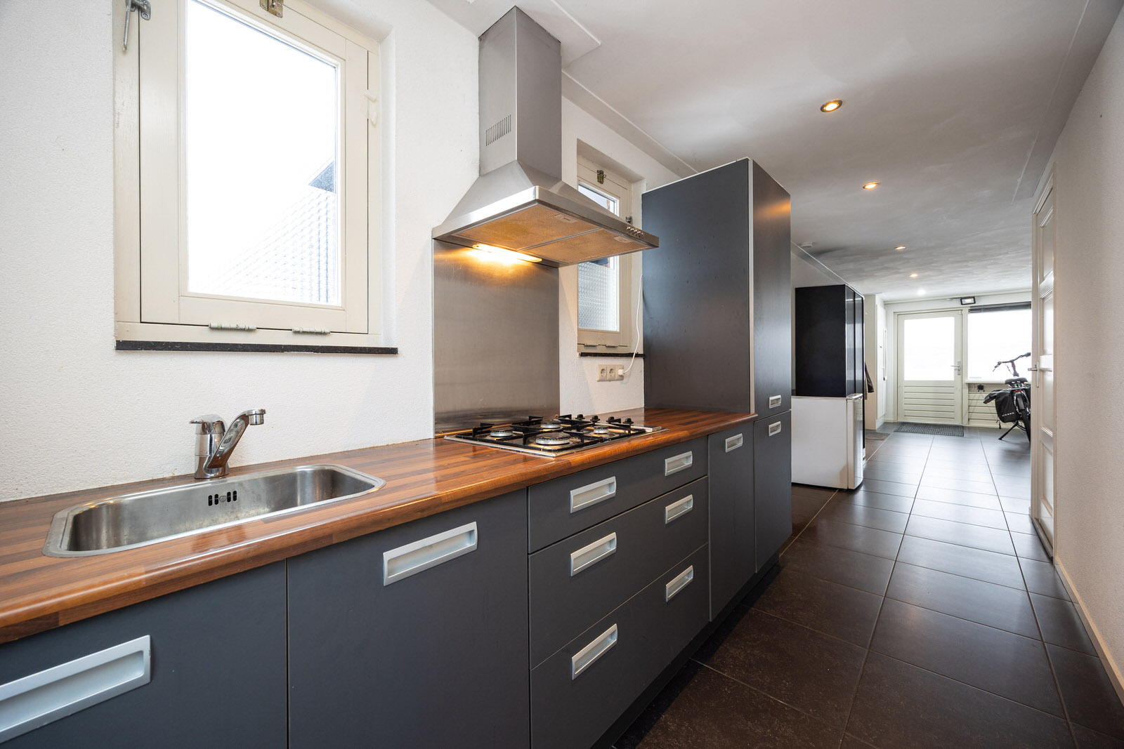 De sfeervolle keuken staat in open verbinding met het eetgedeelte en is praktisch ingericht met veel werk- en kastruimte. De opstelling biedt plaats aan diverse inbouwapparatuur, te weten een 6-pits gasfornuis met wokbrander, oven, afzuigkap, koelkast en vaatwasmachine. Daarnaast is er een koffiezetmachine en magnetron. De keuken ligt centraal op de begane grond, beschikt over daglicht via een raam in de zijgevel en heeft een directe verbinding met zowel het eetgedeelte als de bijkeuken.