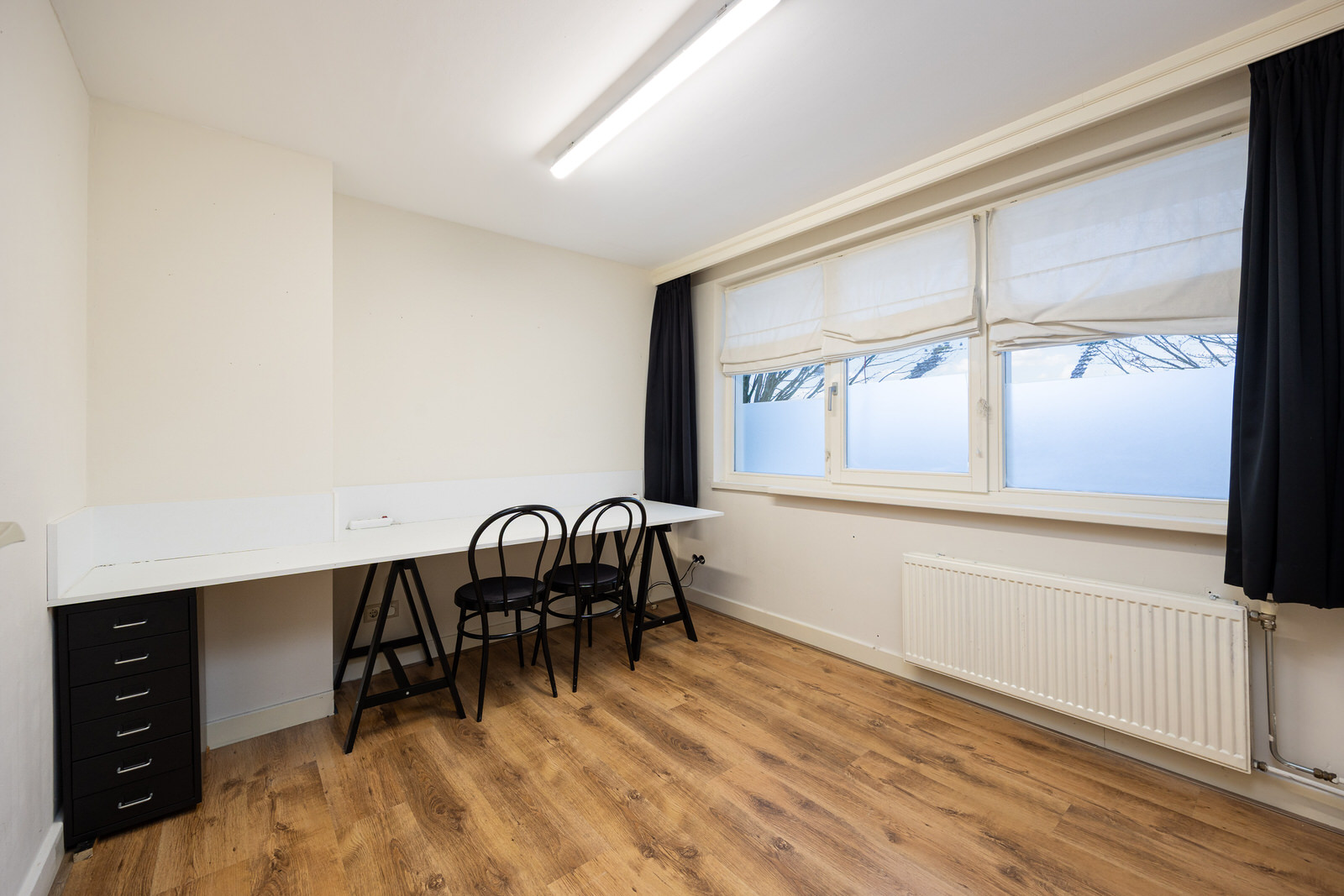Aansluitend aan de keuken bevindt zich de bijkeuken met aansluitingen voor wasapparatuur en extra bergruimte. Vanuit hier is er een achterdeur naar de tuin én een inpandige doorgang naar het bijgebouw.