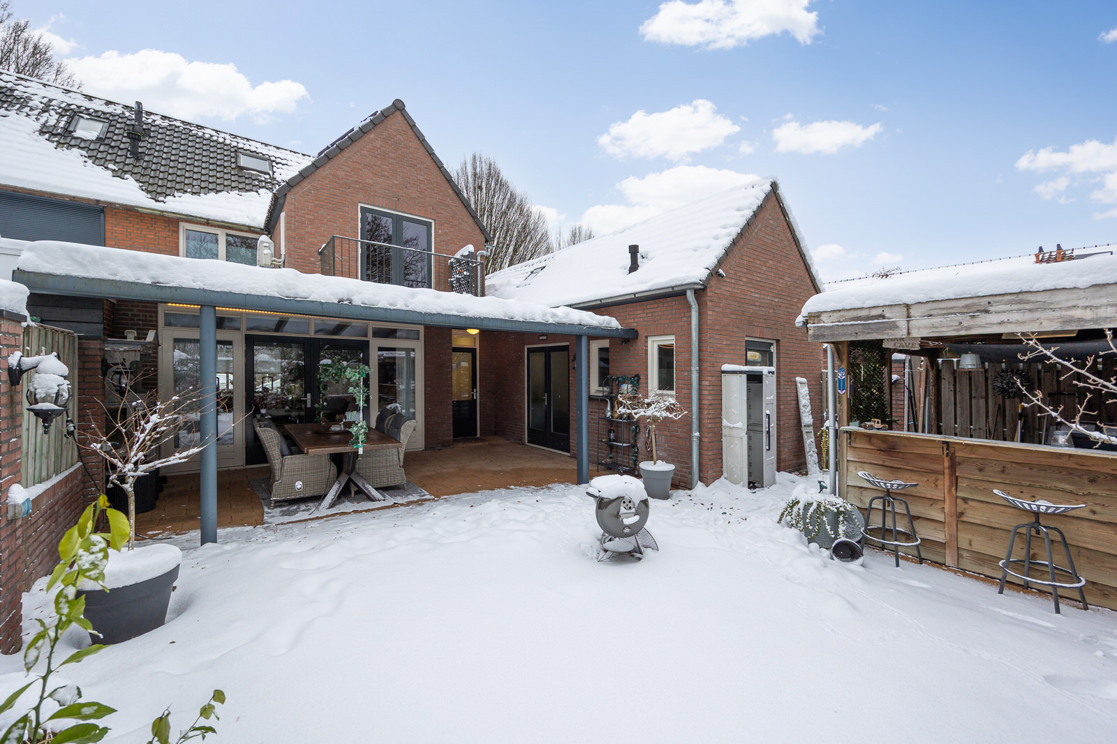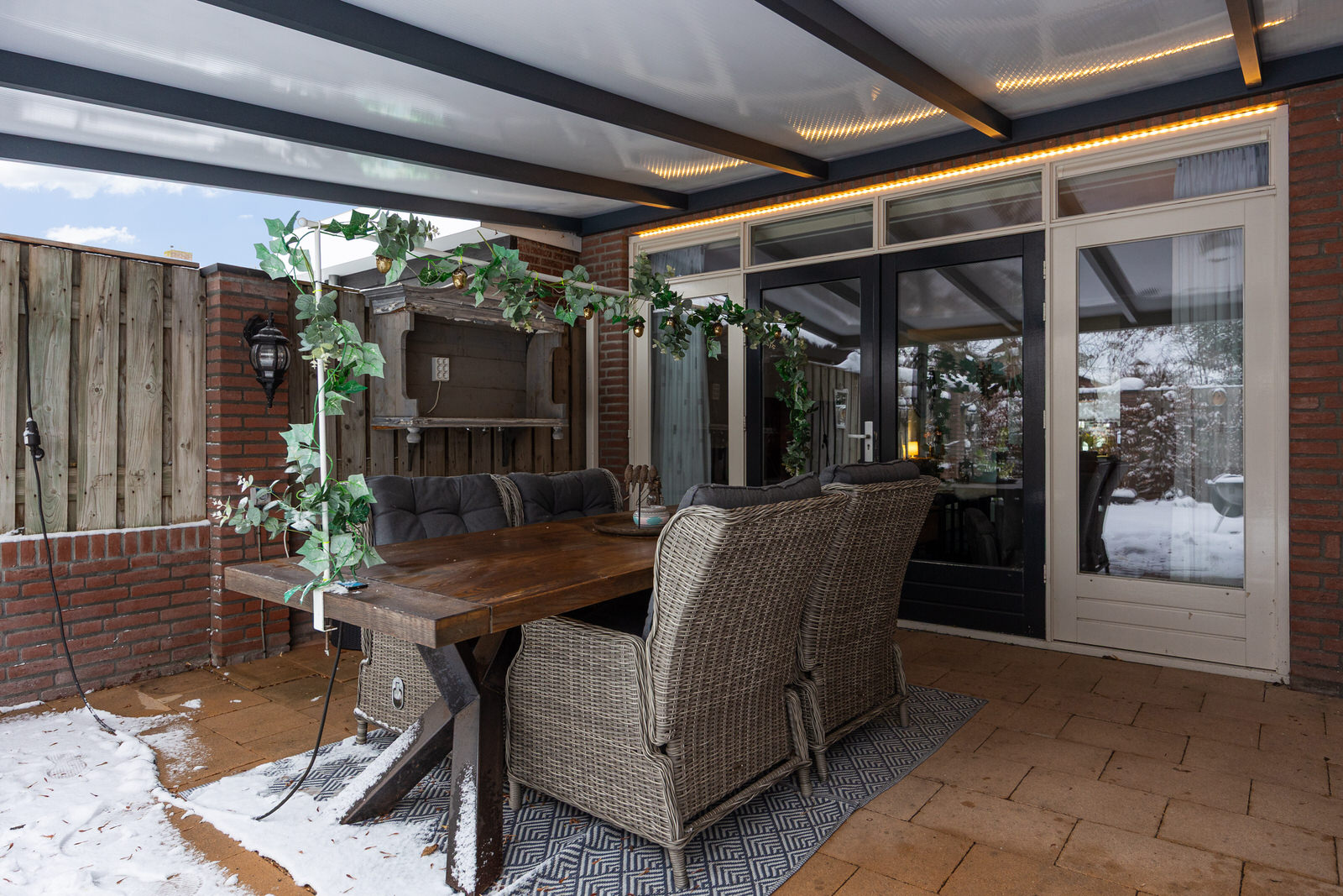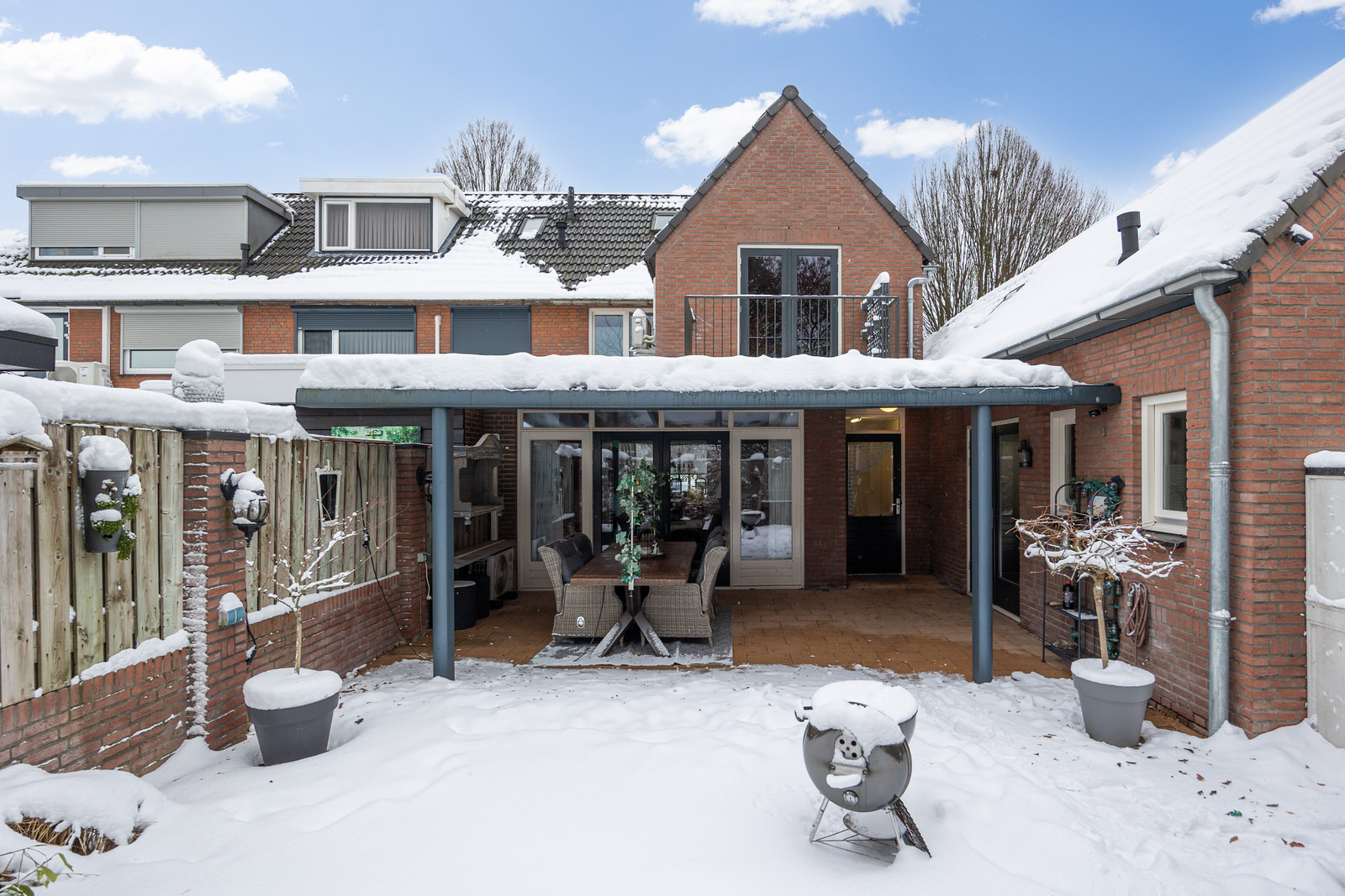 De achtertuin is volledig omsloten en biedt veel privacy. De tuin is grotendeels verhard en daarmee onderhoudsvriendelijk ingericht. Meerdere overkappingen zorgen ervoor dat je hier het hele jaar door comfortabel buiten kunt zitten. De grootste overkapping bevindt zich direct aan de achterzijde over de volledige breedte van het oorspronkelijke hoofdhuis. Met een diepte van bijna 4 meter, is het een heerlijke overkapping om uitgebreid onder te vertoeven. Via een poort is er een achterom aanwezig. De voortuin is eveneens onderhoudsvriendelijk en biedt parkeergelegenheid voor twee auto's op eigen terrein.