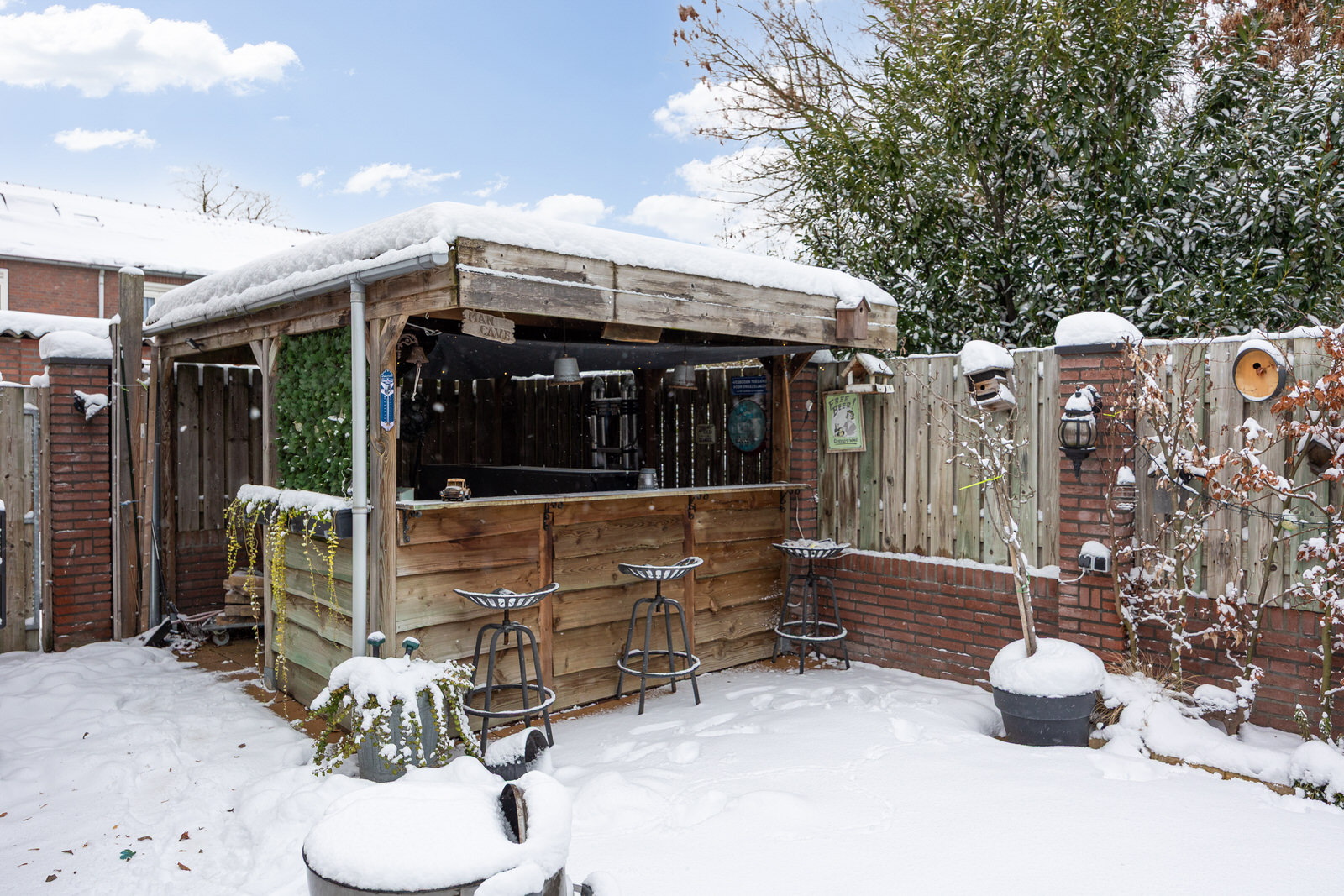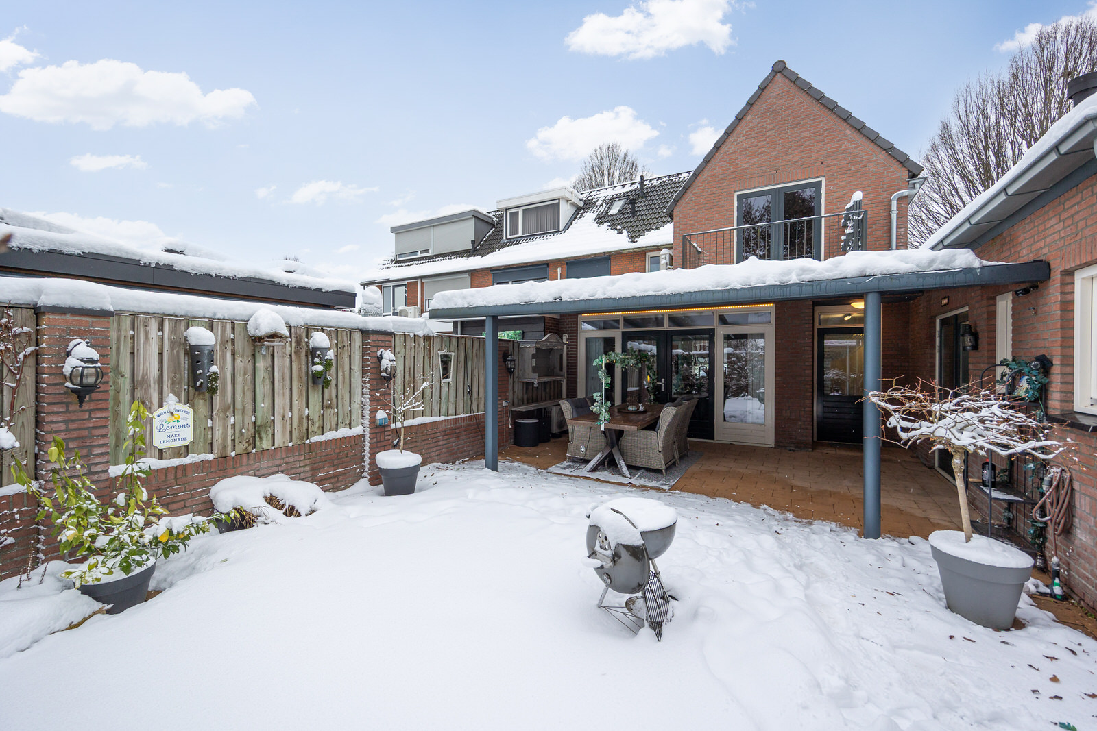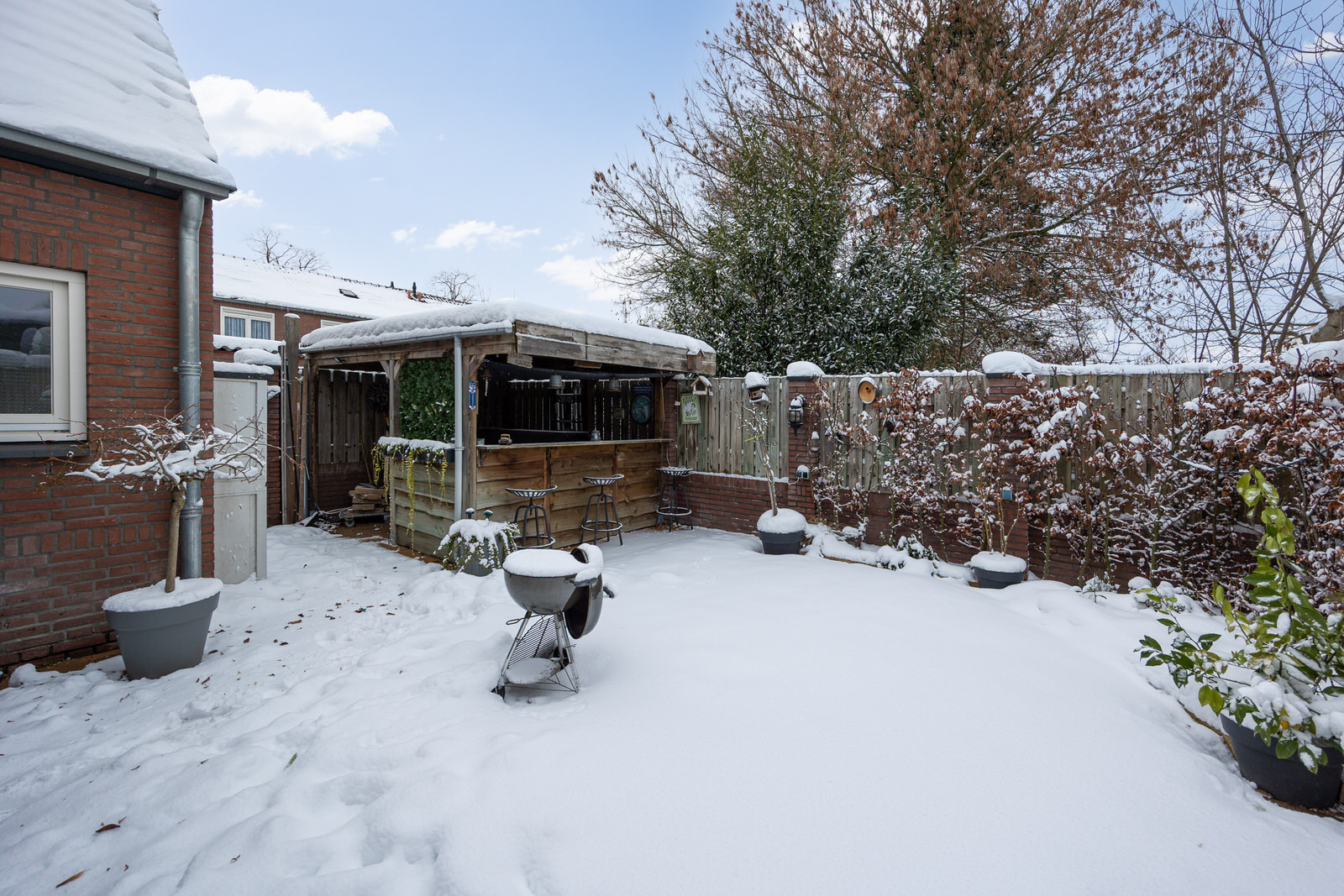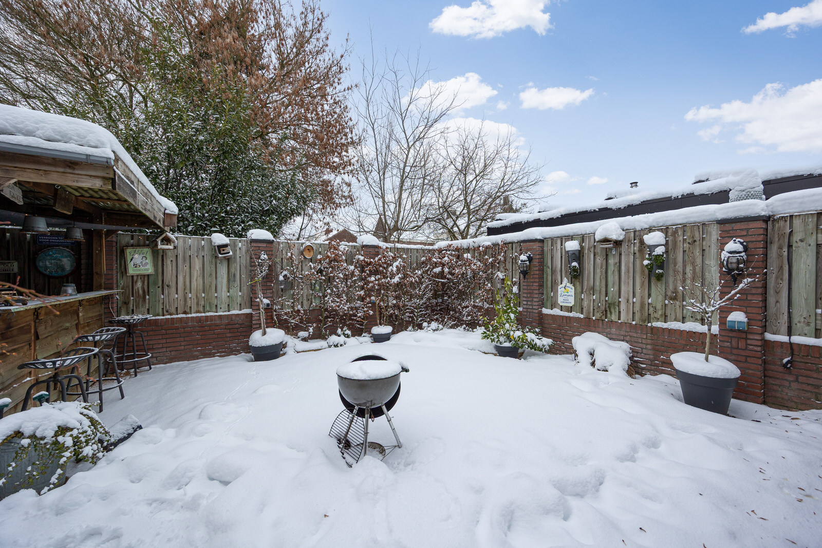 De achtertuin is volledig omsloten en biedt veel privacy. De tuin is grotendeels verhard en daarmee onderhoudsvriendelijk ingericht. Meerdere overkappingen zorgen ervoor dat je hier het hele jaar door comfortabel buiten kunt zitten. De grootste overkapping bevindt zich direct aan de achterzijde over de volledige breedte van het oorspronkelijke hoofdhuis. Met een diepte van bijna 4 meter, is het een heerlijke overkapping om uitgebreid onder te vertoeven. Via een poort is er een achterom aanwezig. De voortuin is eveneens onderhoudsvriendelijk en biedt parkeergelegenheid voor twee auto's op eigen terrein.