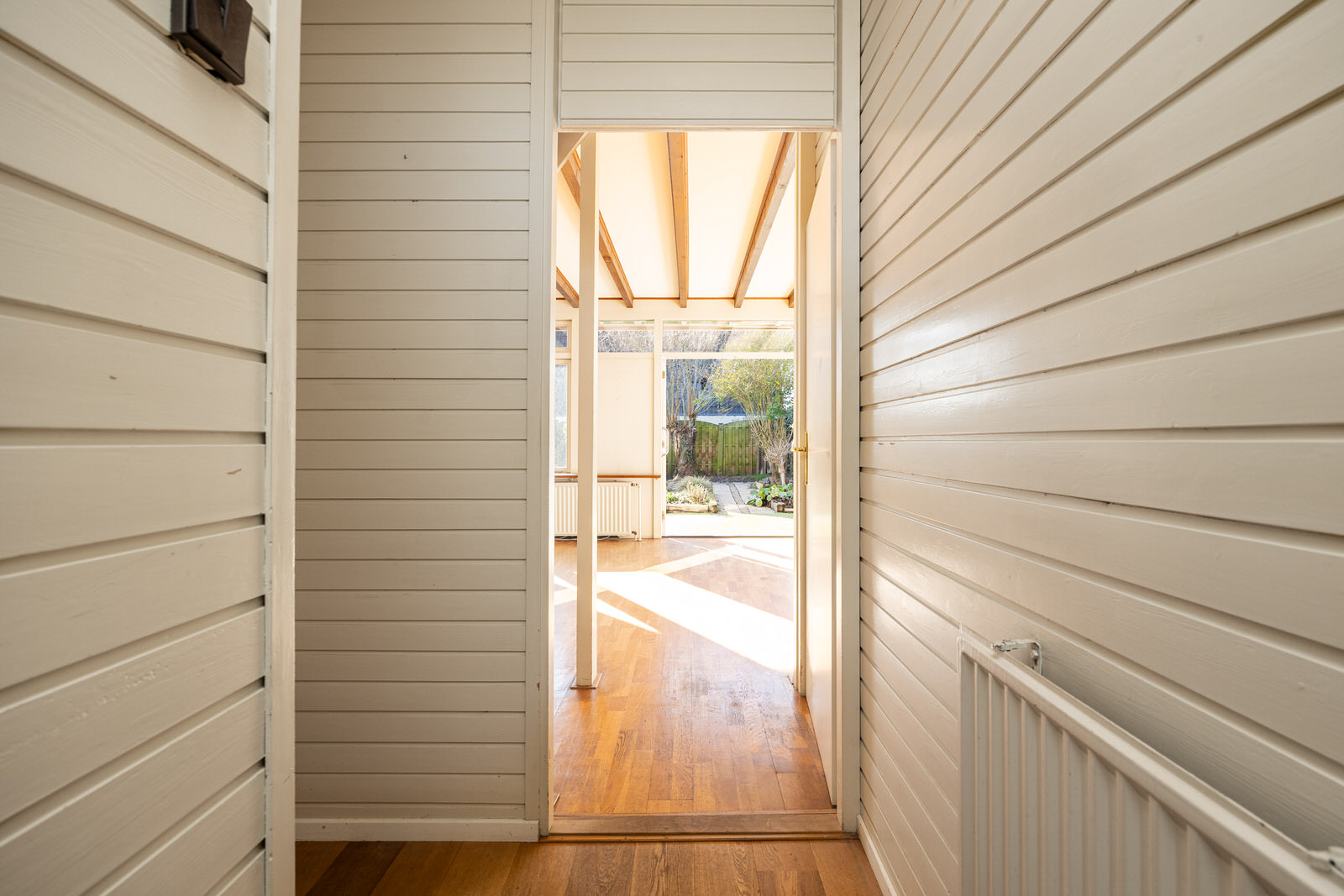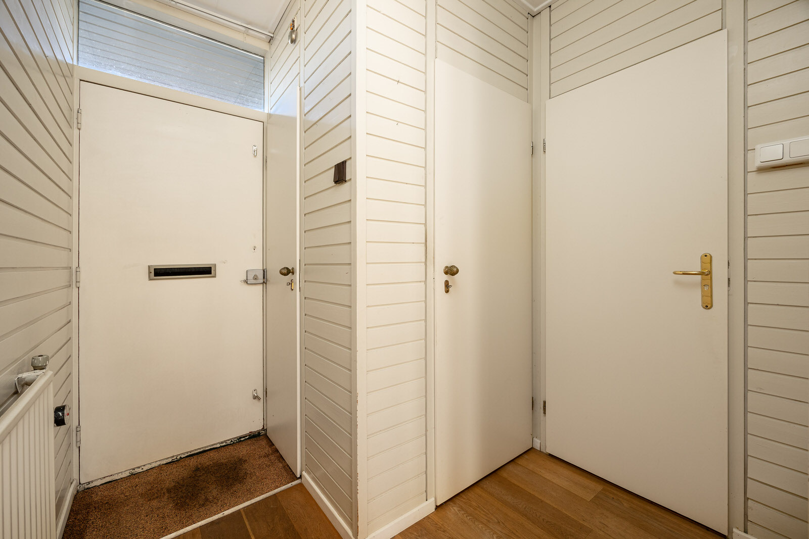 Via de entree kom je in de hal van de woning. Hier bevinden zich de meterkast met vijf groepen en twee aardlekschakelaars en een vaste kast met de opstelling van de boiler voor warm water. Vanuit de hal zijn de badkamer en de woonkamer bereikbaar.