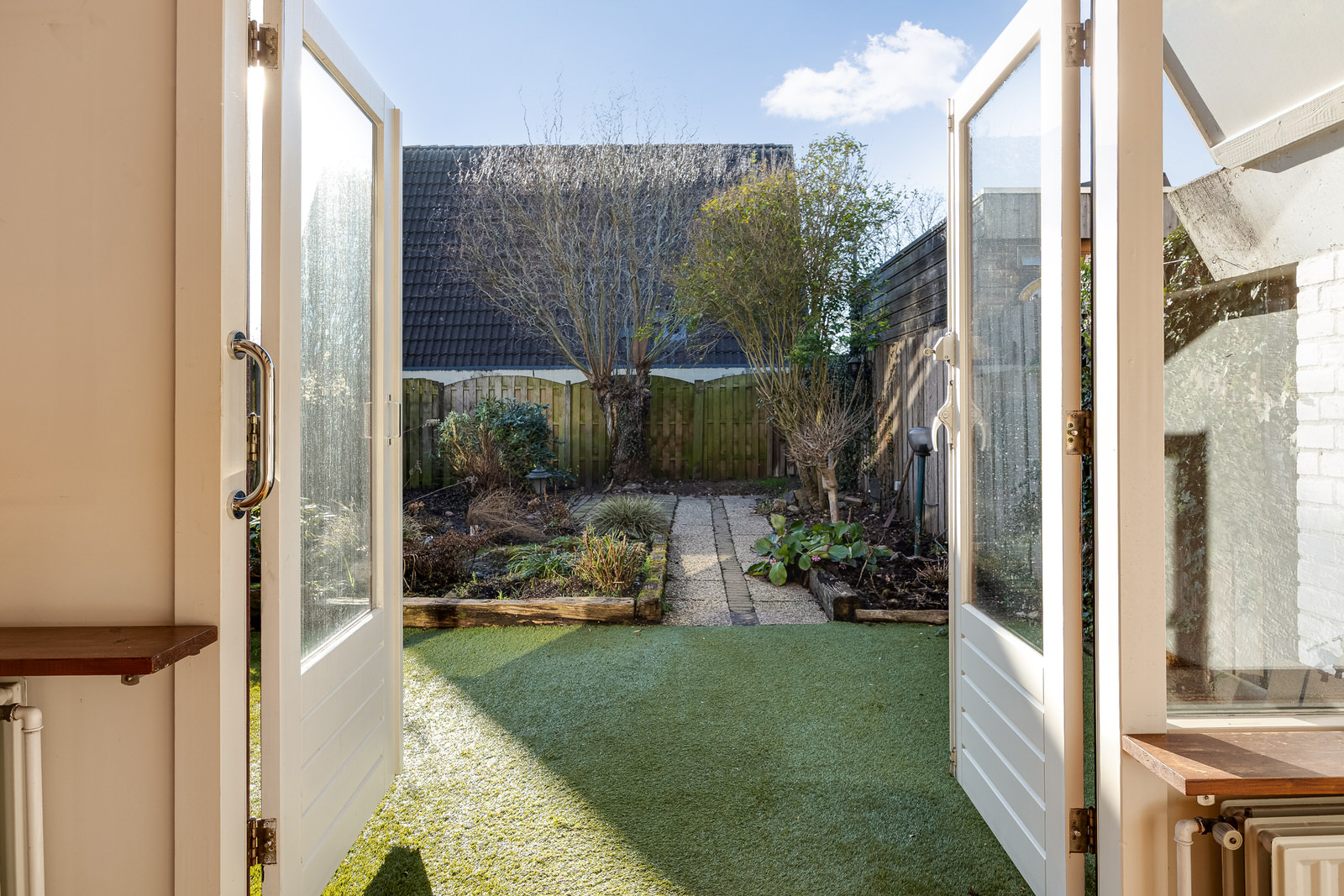 - Verrassend ruime woonkamer met openslaande deuren naar de achtertuin.