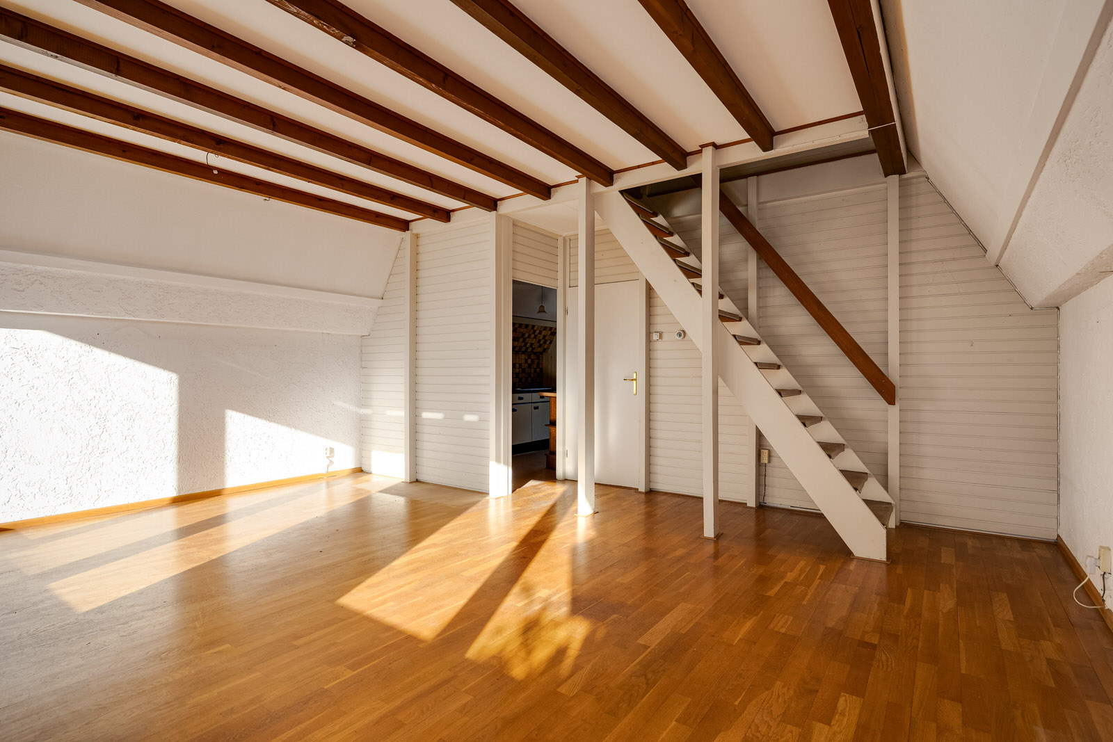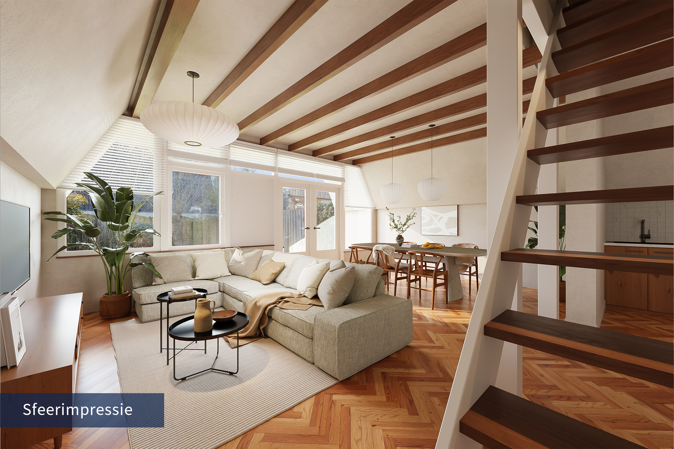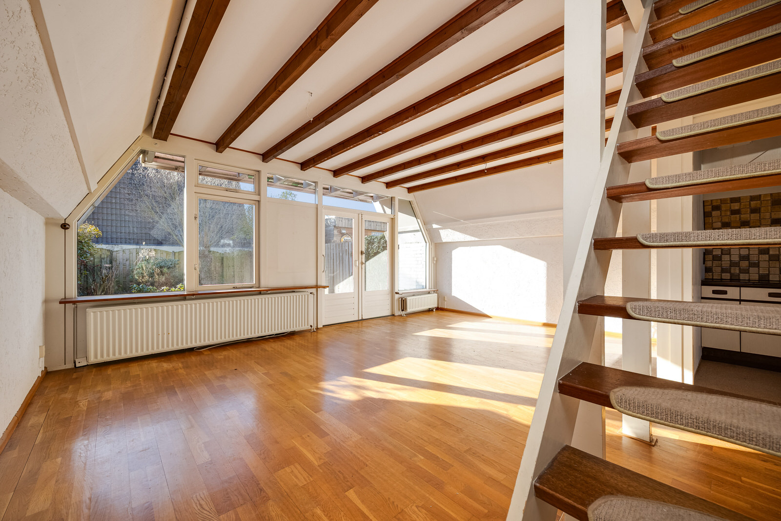 De woonkamer vormt het hart van de woning en verrast door de ruimte en het licht. De karakteristieke kapconstructie met zichtbare balken geeft de ruimte een sfeervolle uitstraling. De kamer is voorzien van een parketvloer en granol wandafwerking en biedt voldoende plaats voor zowel een comfortabele zithoek als een eethoek. Dankzij de grote pui met openslaande deuren naar de achtertuin valt er veel daglicht naar binnen. De trap in de woonkamer leidt naar de eerste verdieping.