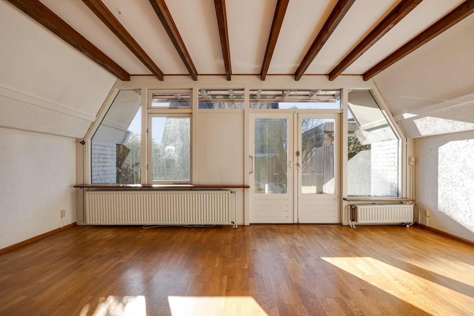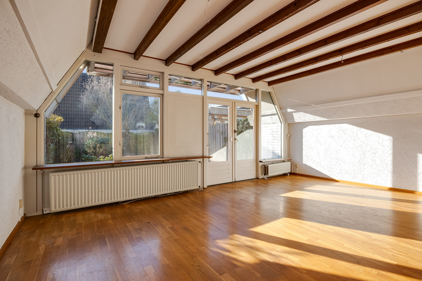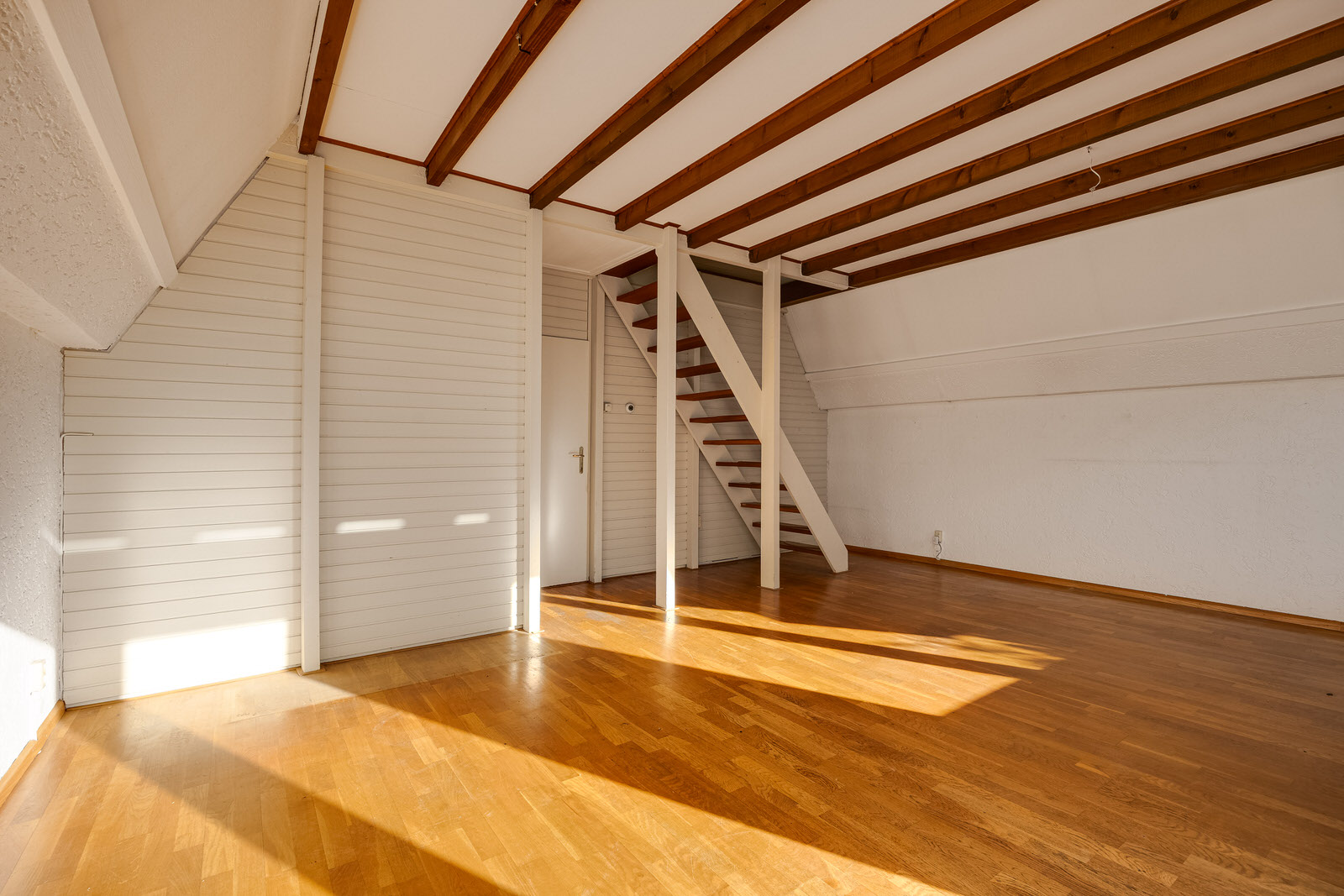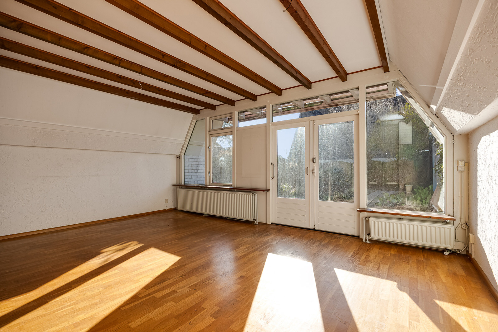 De woonkamer vormt het hart van de woning en verrast door de ruimte en het licht. De karakteristieke kapconstructie met zichtbare balken geeft de ruimte een sfeervolle uitstraling. De kamer is voorzien van een parketvloer en granol wandafwerking en biedt voldoende plaats voor zowel een comfortabele zithoek als een eethoek. Dankzij de grote pui met openslaande deuren naar de achtertuin valt er veel daglicht naar binnen. De trap in de woonkamer leidt naar de eerste verdieping.