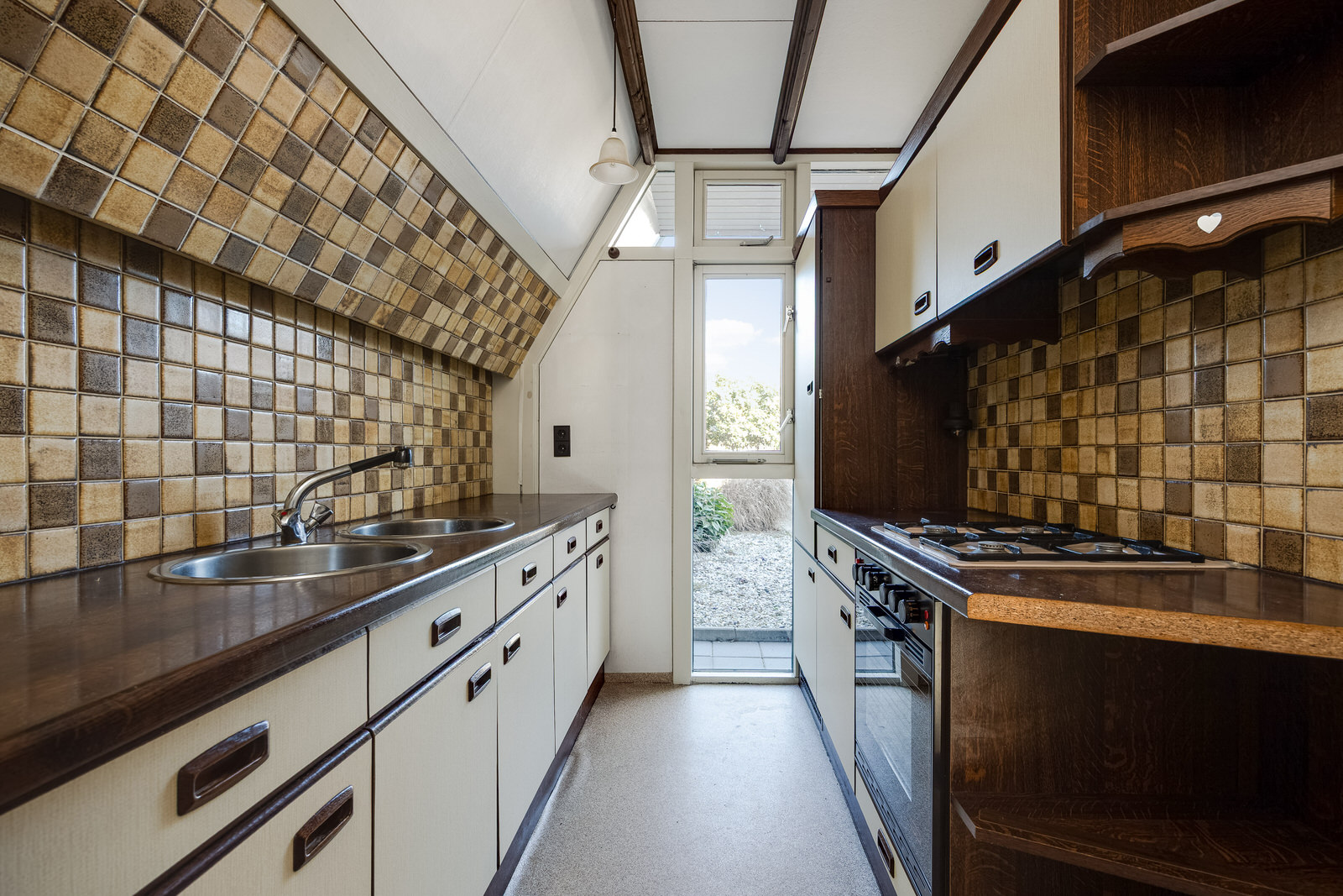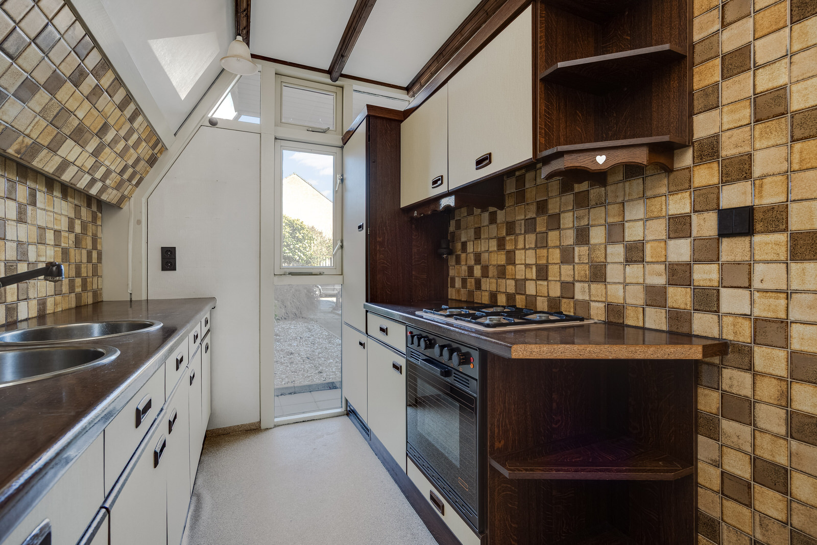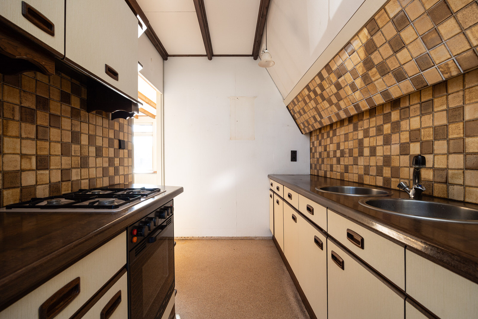 De half open keuken bevindt zich aan de voorzijde van de woning. De keuken heeft een rechte opstelling met een dubbele spoelbak en diverse apparatuur, waaronder een vierpits gaskookplaat, afzuigkap, oven en een koelkast met vriesvak. De ruimte biedt de mogelijkheid om de keuken naar eigen wens te moderniseren.