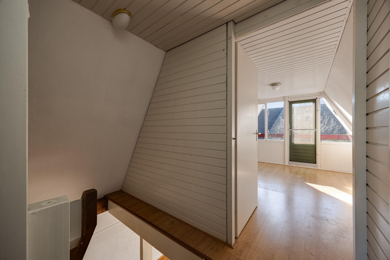 Via de trap in de woonkamer bereik je de overloop op de eerste verdieping. Hier bevindt zich een vaste kast.