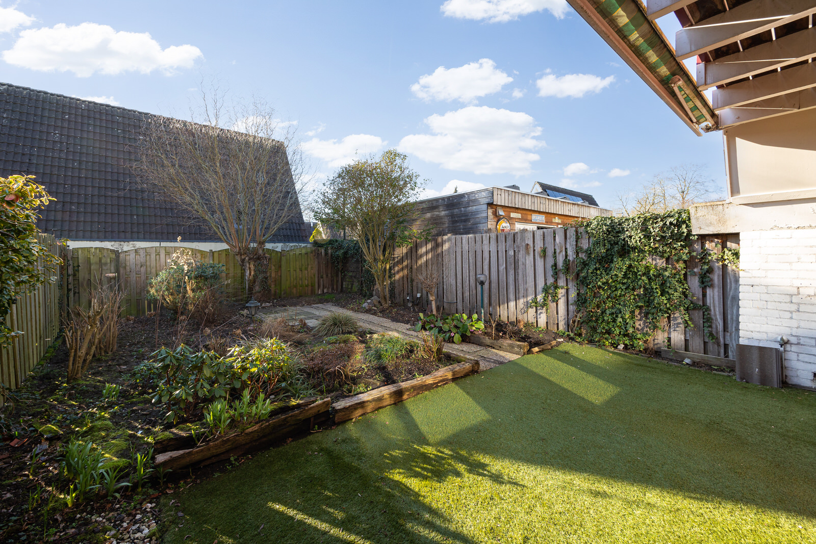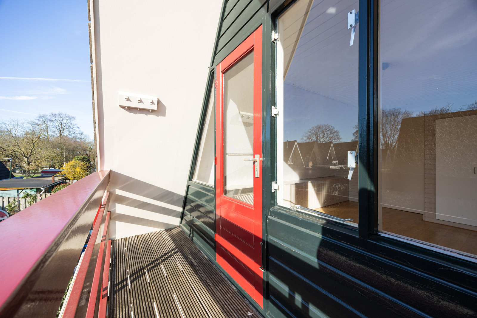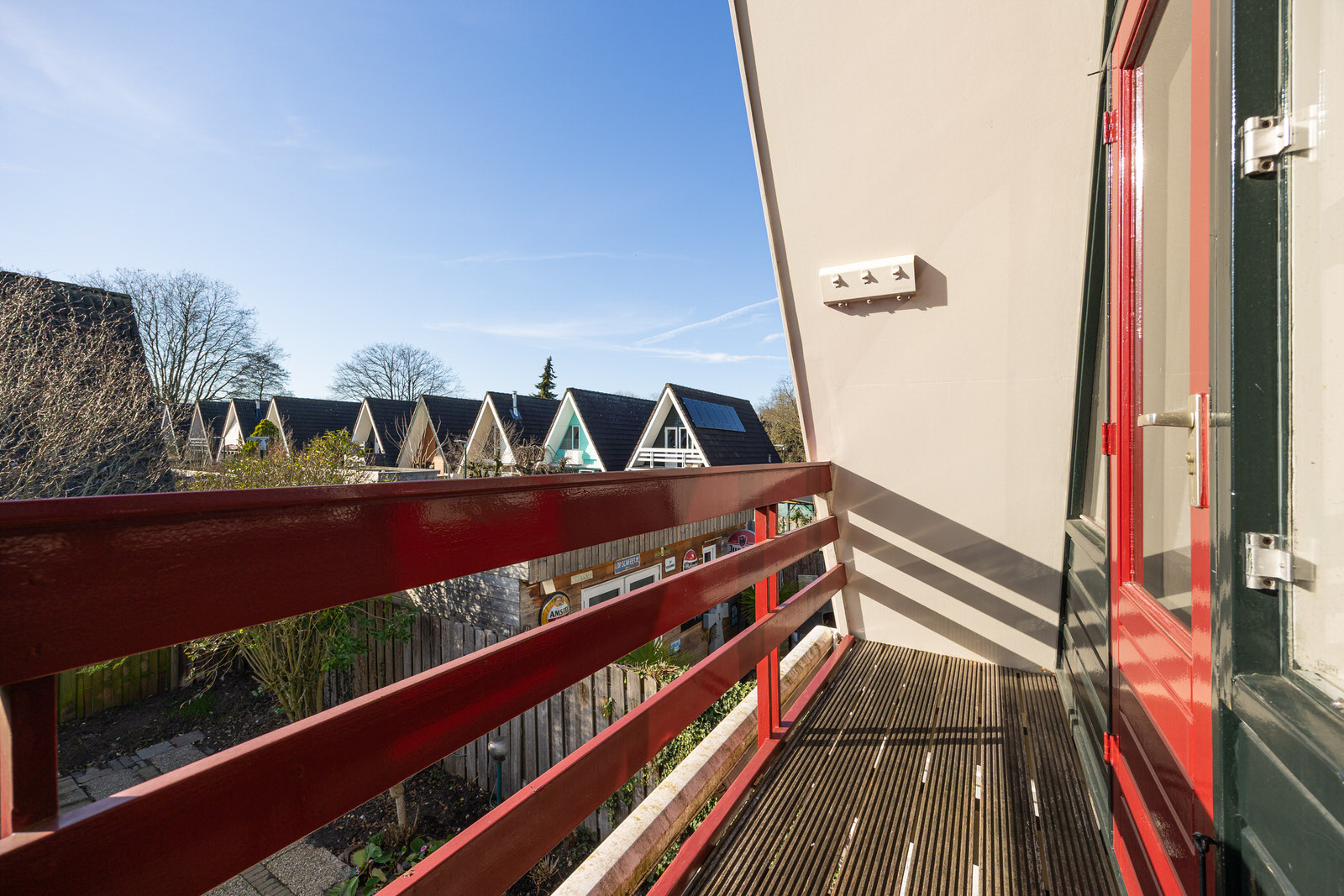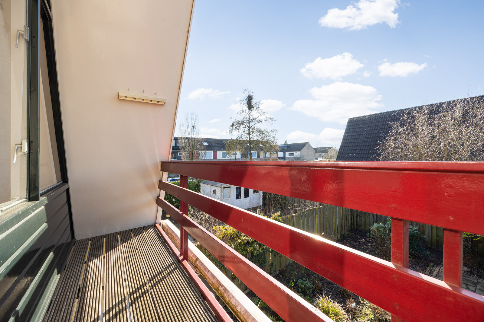 Aan de achterzijde bevindt zich een balkon dat toegankelijk is vanuit de slaapkamer. Vanaf hier is er uitzicht over de tuin en de omliggende bebouwing.