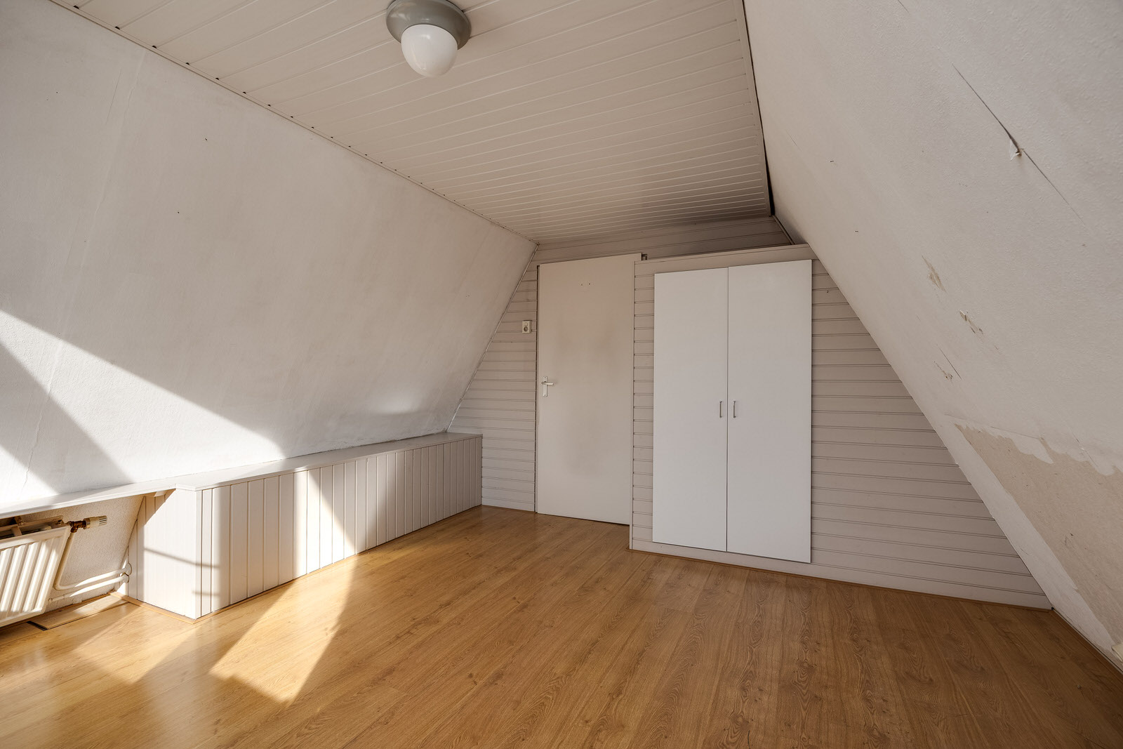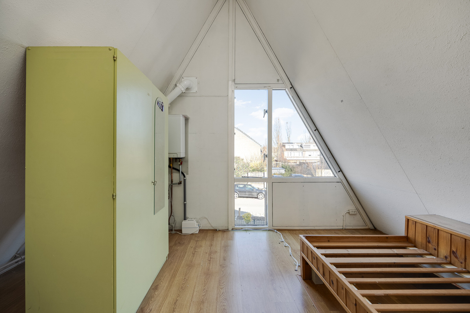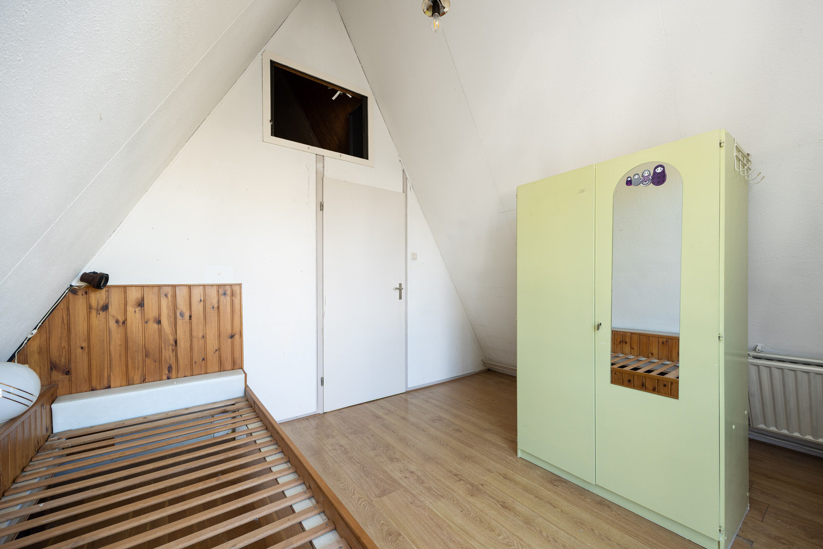 Op de eerste verdieping zijn twee slaapkamers aanwezig. De slaapkamer aan de achterzijde heeft een deur naar het balkon en beschikt over een vaste kast. De slaapkamer aan de voorzijde heeft de opstelling van de cv-ketel, een kast en een vaste bedstede. Vanuit deze kamer is tevens toegang tot een praktische bergruimte in de kap. De schuine dakvlakken geven beide kamers het kenmerkende karakter van dit woningtype.