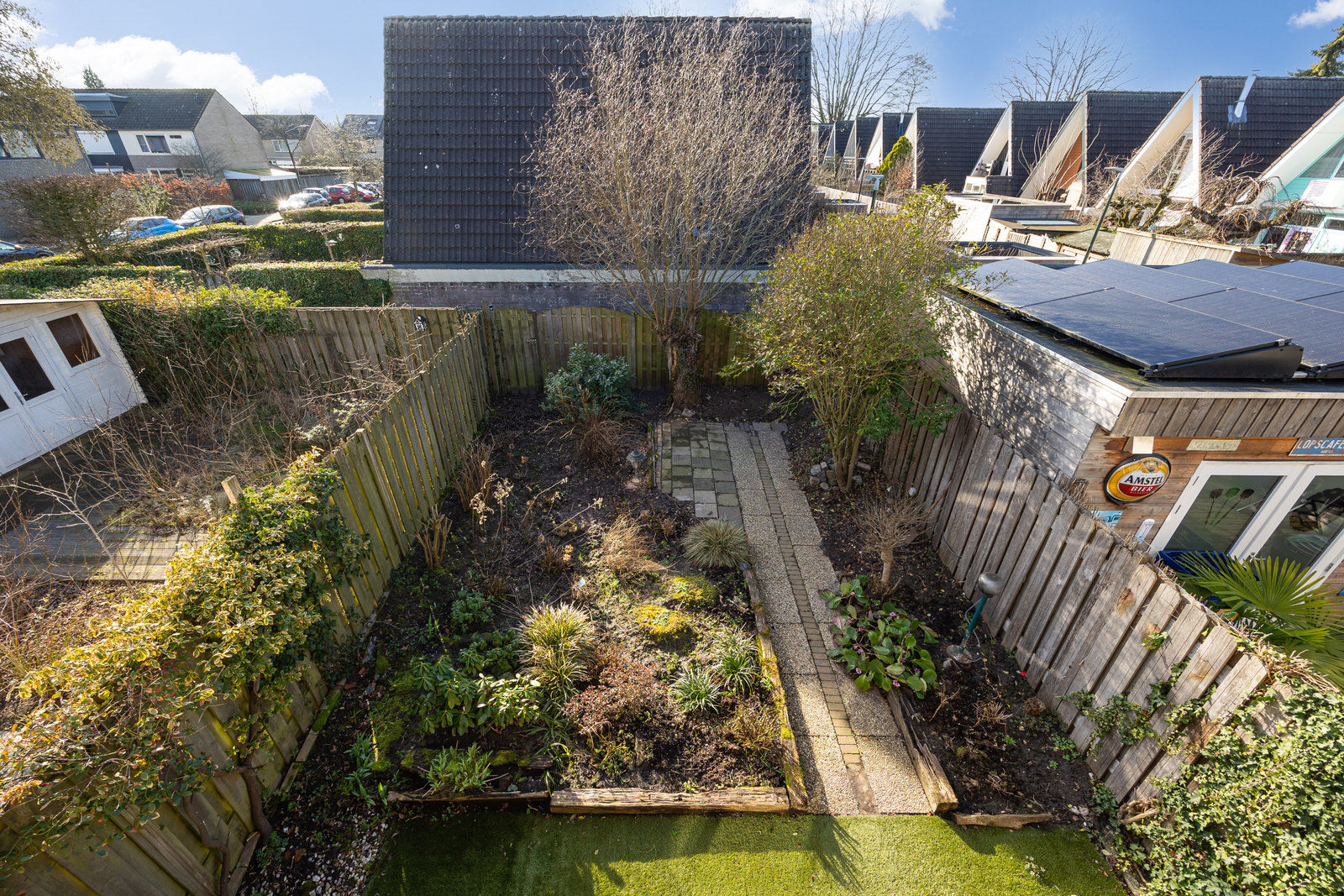 De achtertuin is bereikbaar via de openslaande deuren vanuit de woonkamer. De tuin is aangelegd met een combinatie van bestrating, beplanting en gazon, waardoor er ruimte is voor zowel een terras als groen. Dankzij de erfafscheidingen aan weerszijden biedt de tuin een beschutte plek om buiten te zitten. Vanuit de tuin is er bovendien een fraai zicht op de karakteristieke kap van de woning.