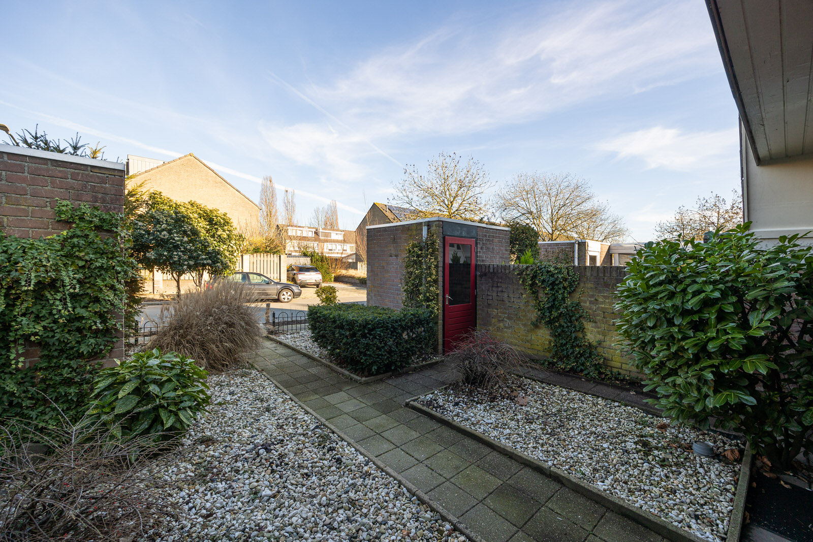 - Stenen berging met elektra aan de voorzijde van de woning.